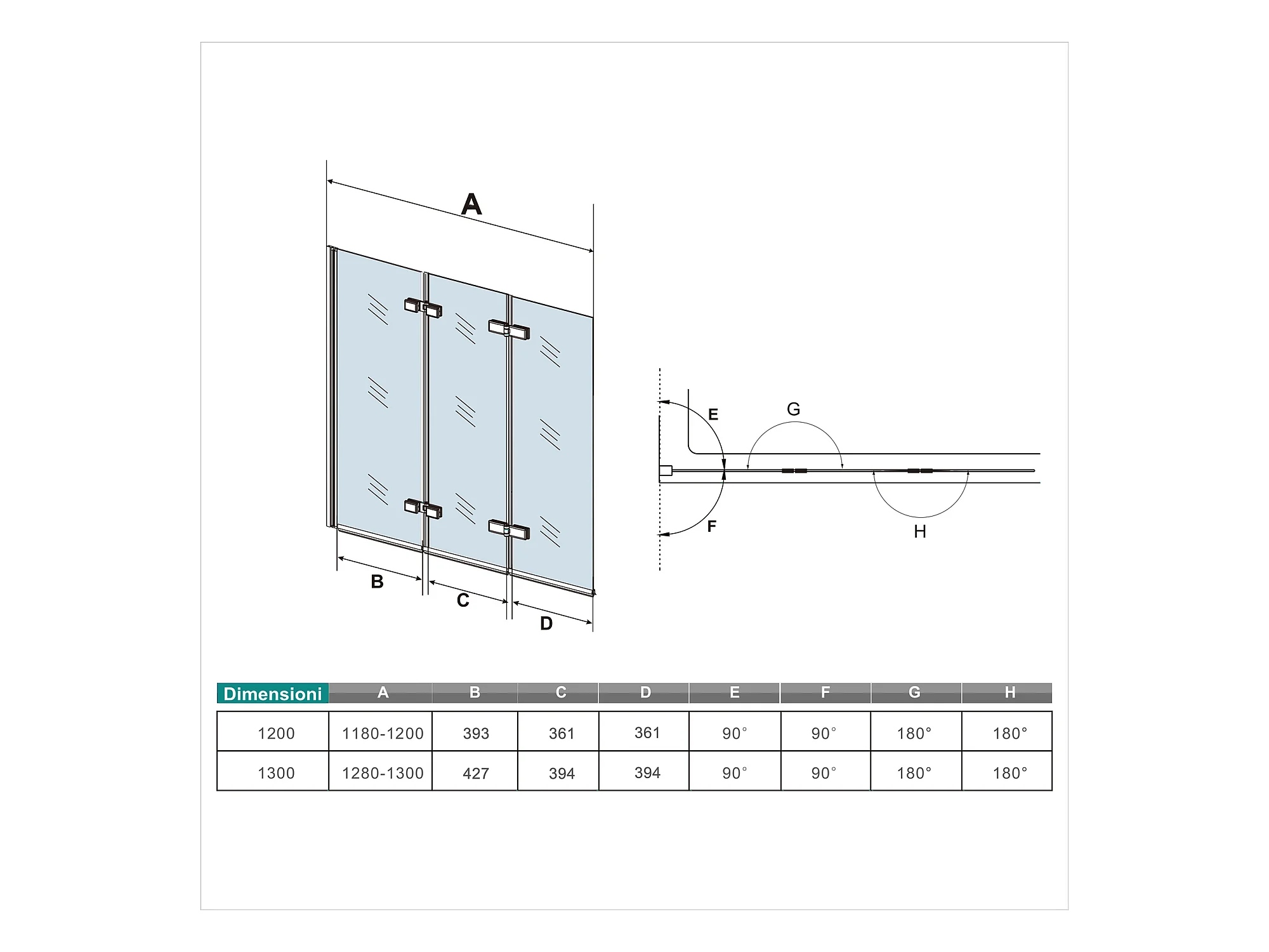120x140 cm Parete Per Vasca Apribile 180 Gradi Montaggio Verso Destro Irreversibile in Vetro Temperato 6 mm Anticalcare Fascia Centrale Opaca