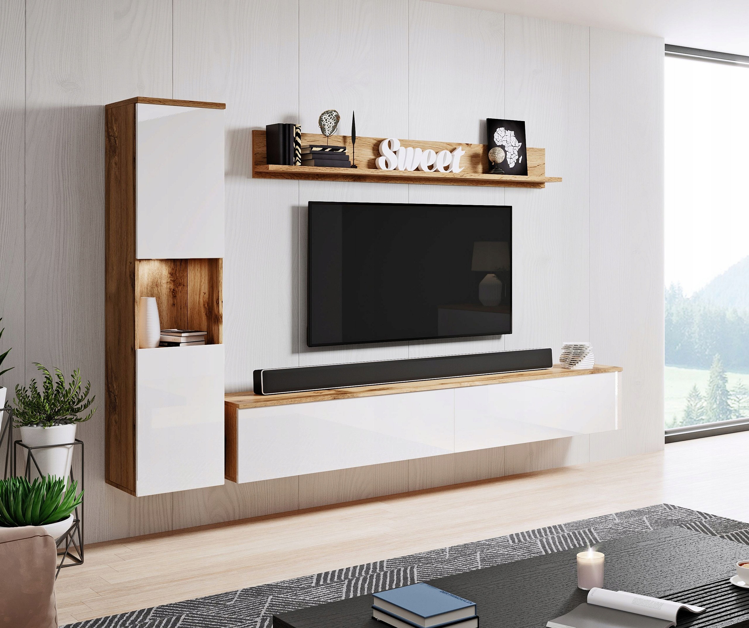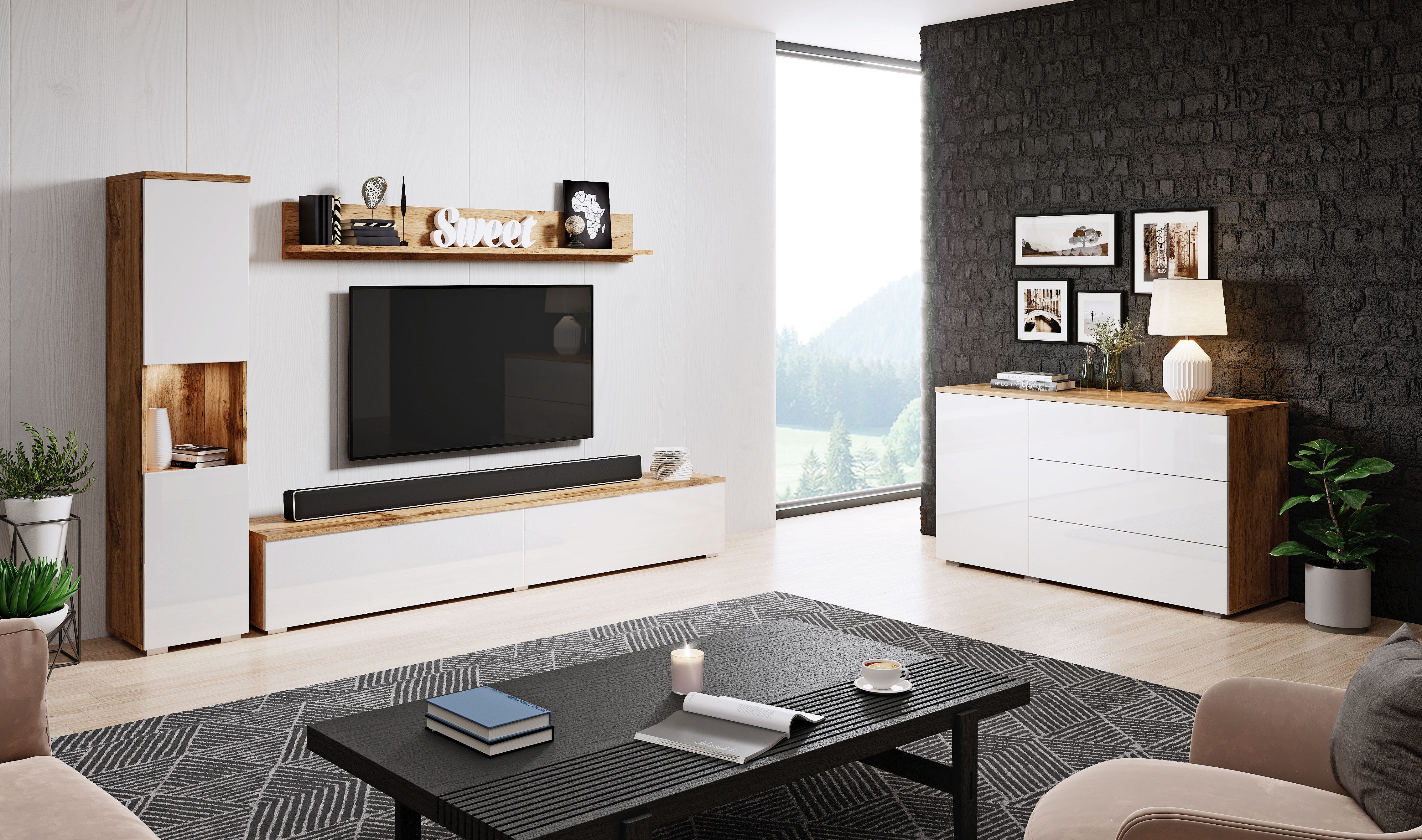 Parete soggiorno moderna 3 elementi con LED, frontali lucidi, colonna e mobile TV 180 cm corpo rovere wotan, frontali bianco lucido