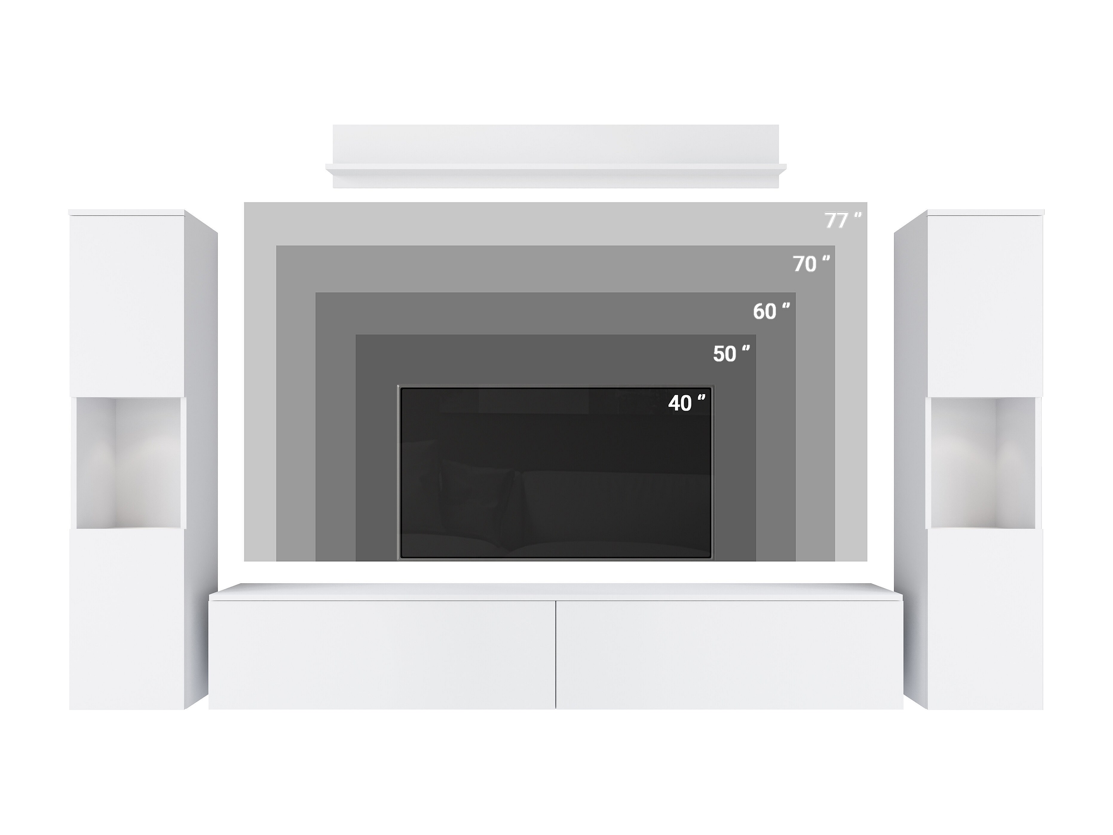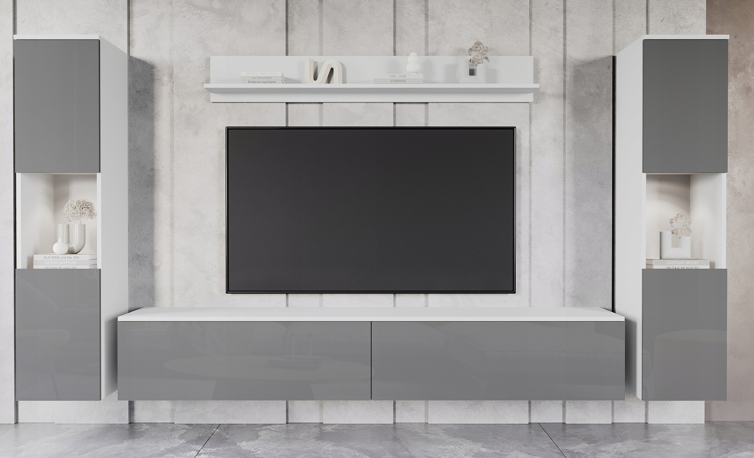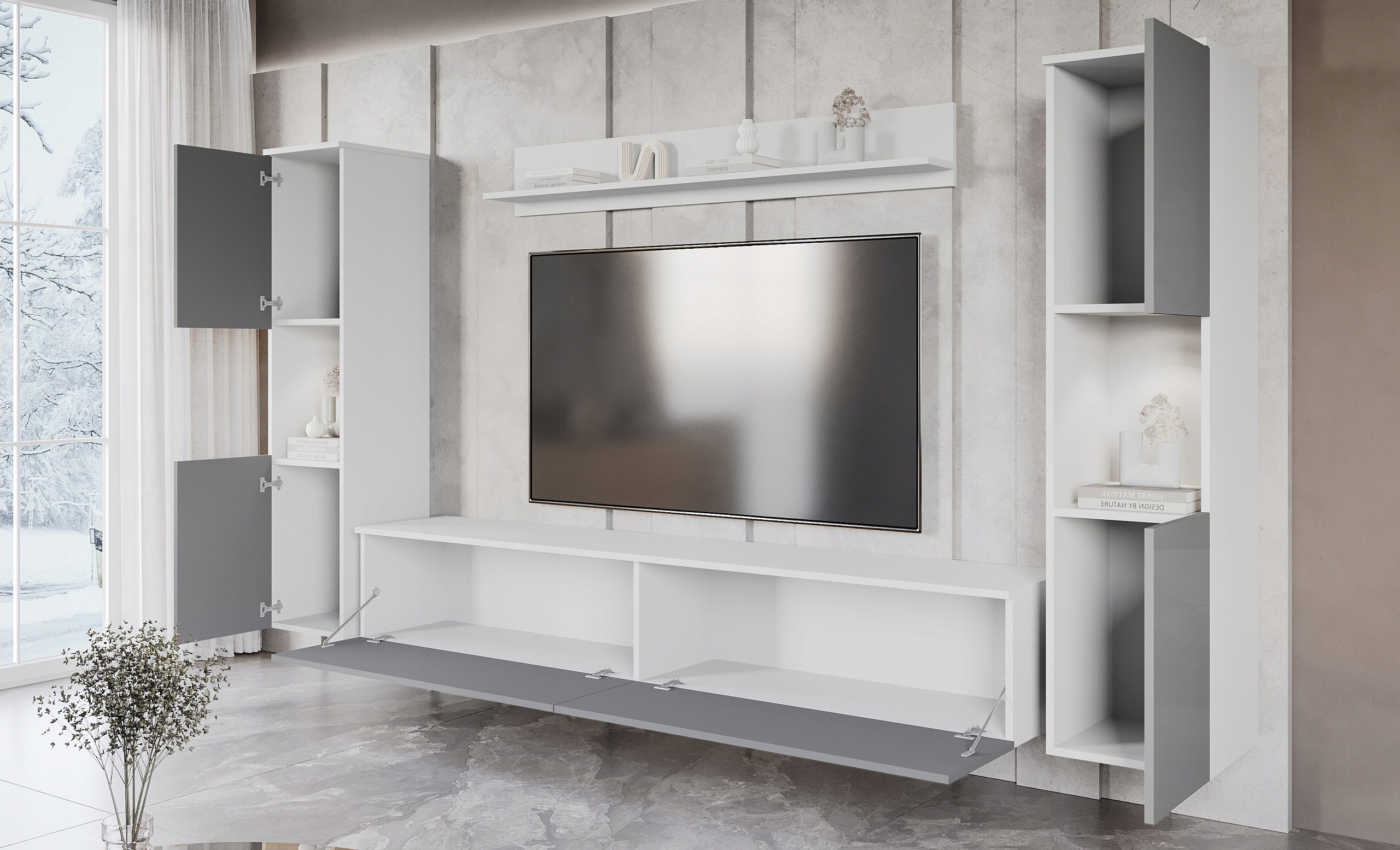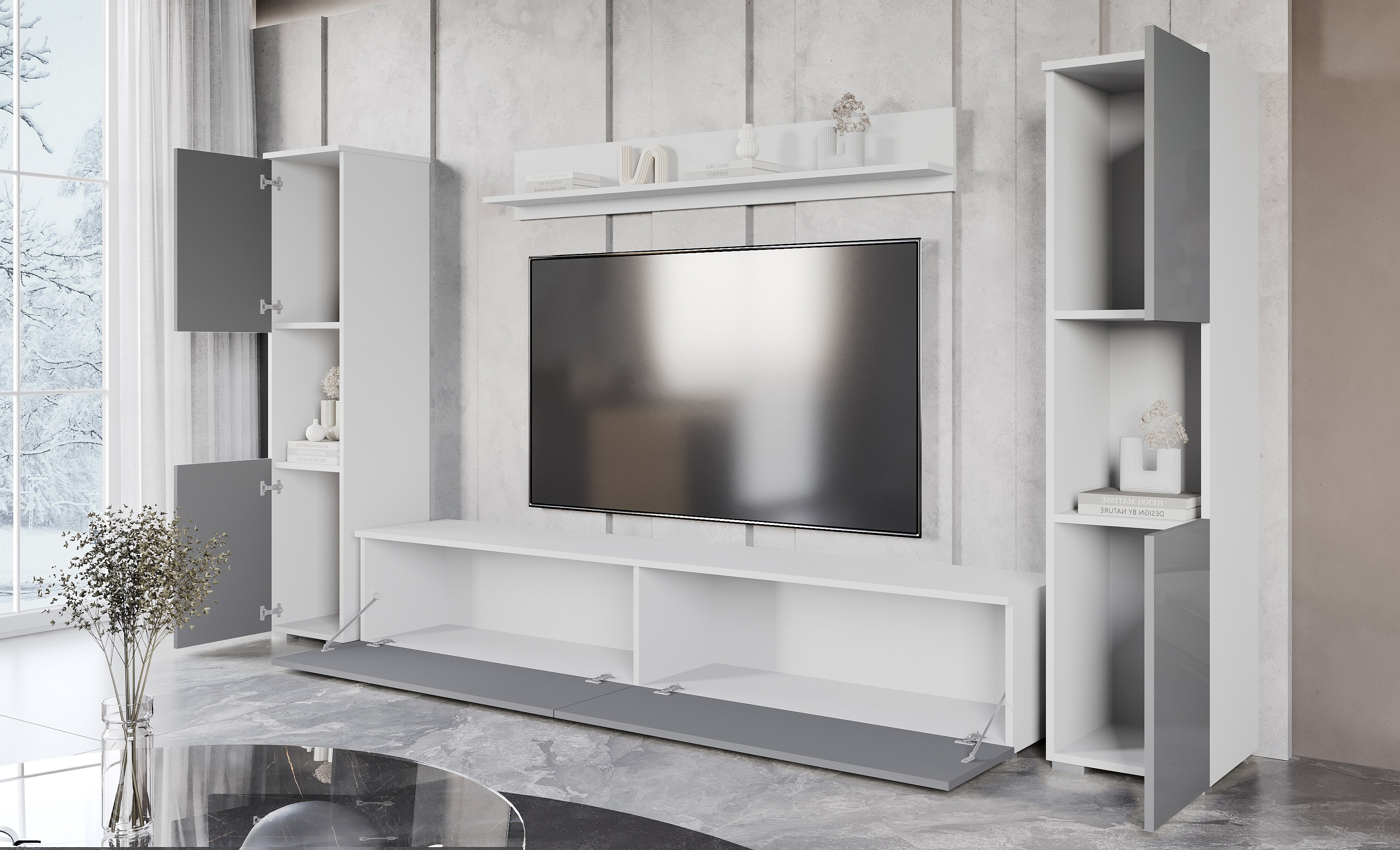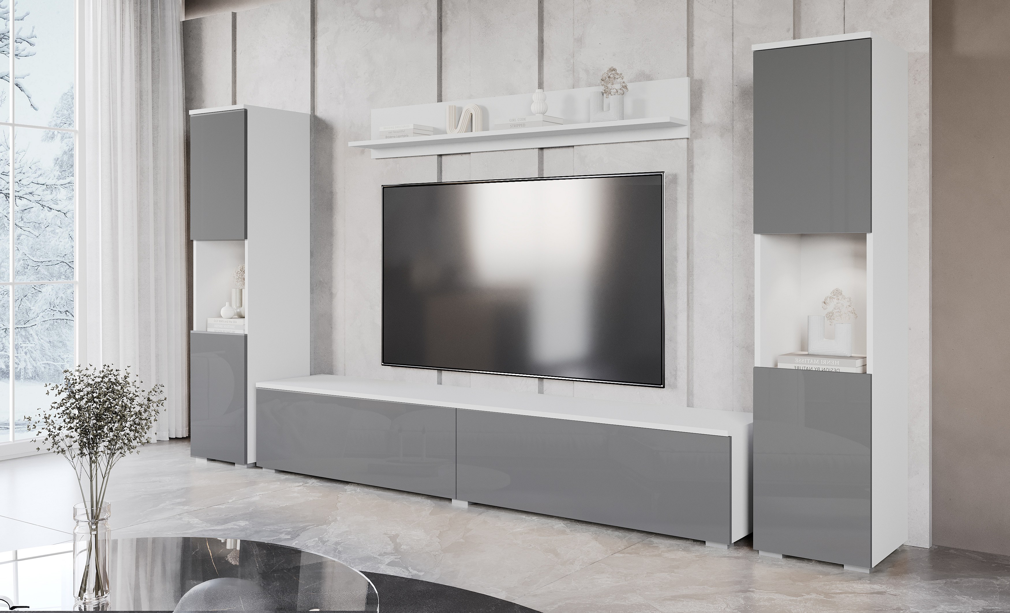 Parete soggiorno moderna 4 elementi con LED, 2 colonne, mobile TV 180 cm e mensola, corpo bianco opaco, frontali grigio lucido