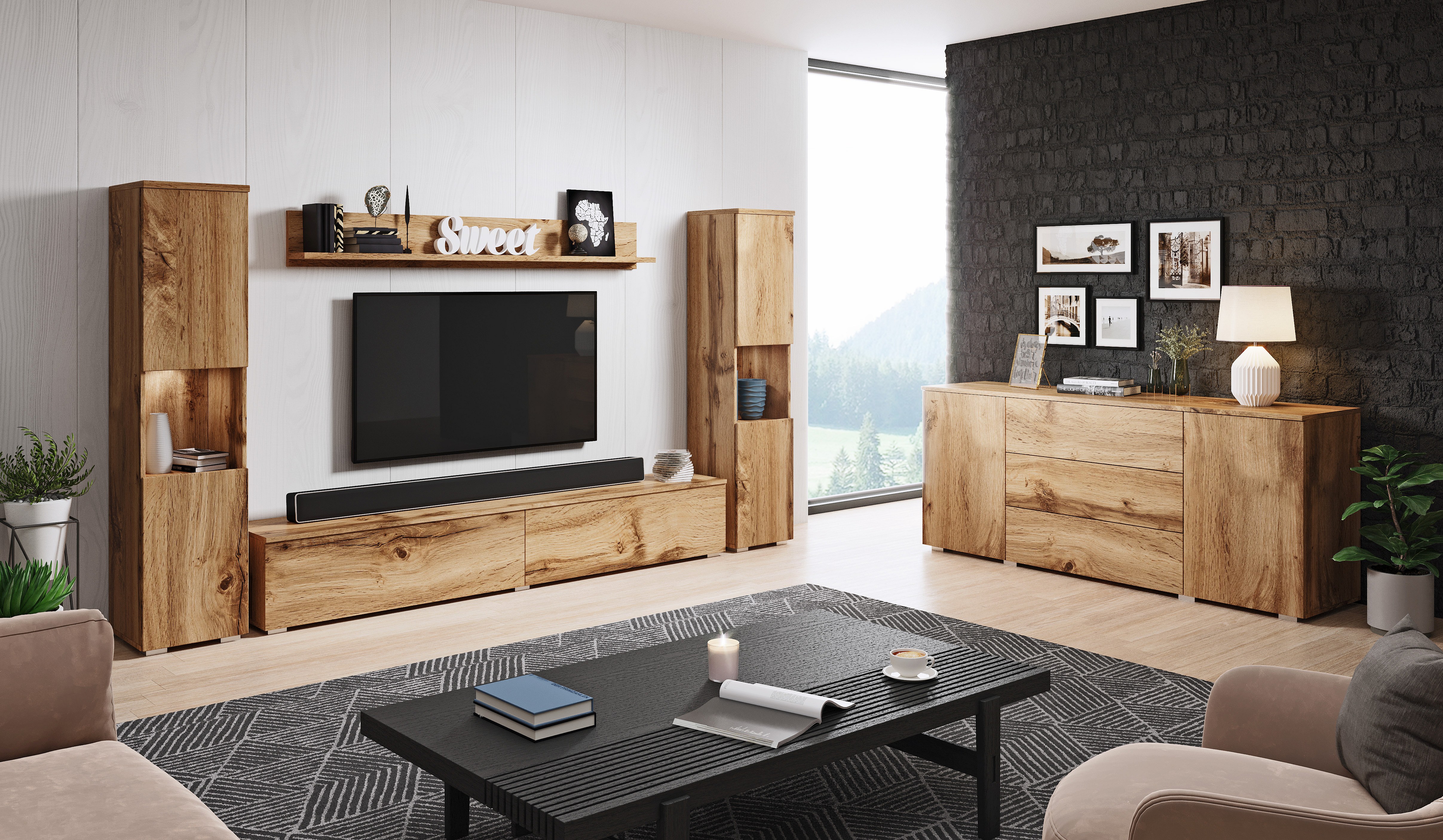 Parete soggiorno moderna 4 elementi con LED, opaca, 2 colonne, mobile TV 180 cm e mensola rovere wotan