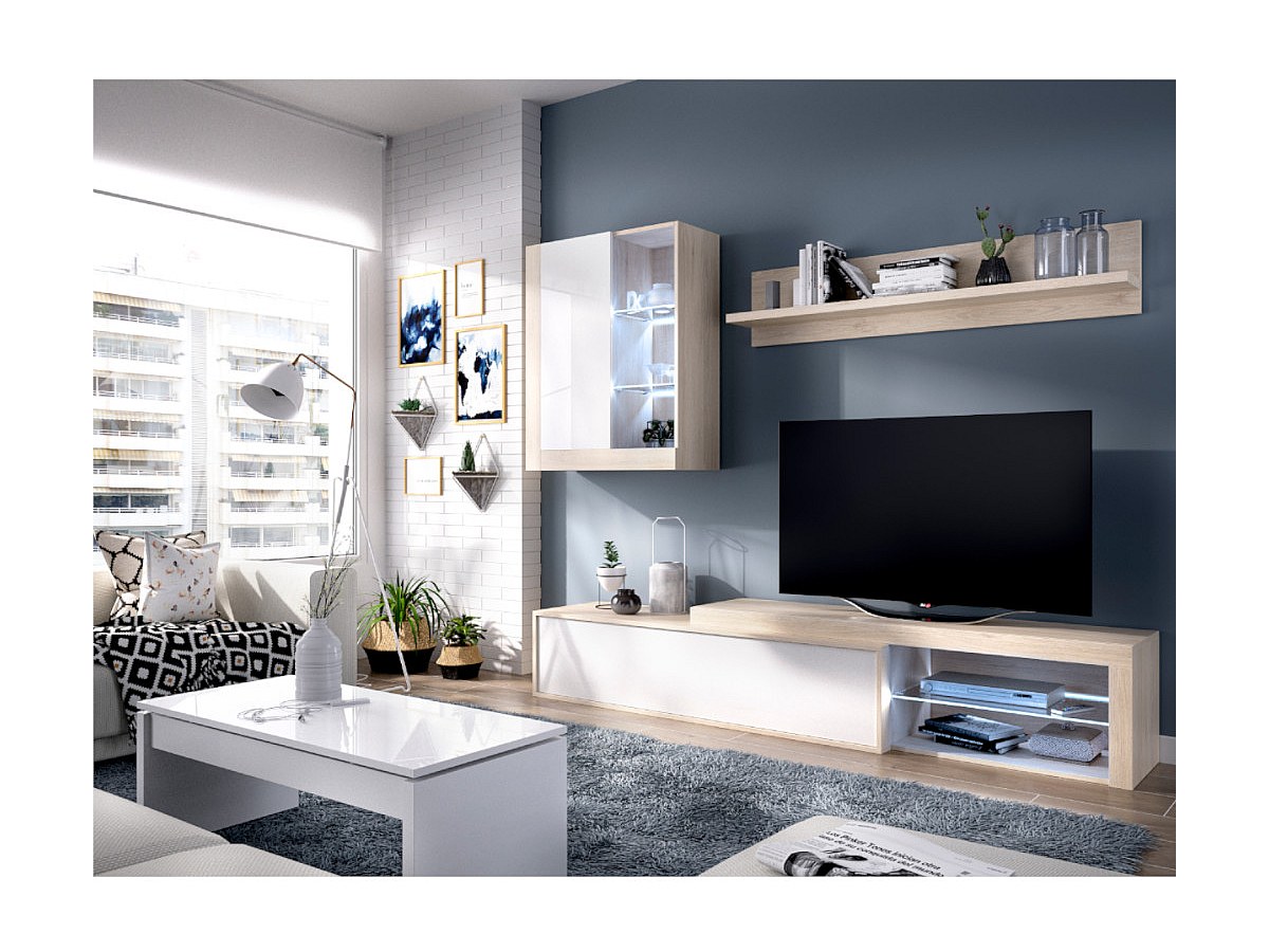 Parete TV con LED e vani portaoggetti in Quercia e bianco - AKABA