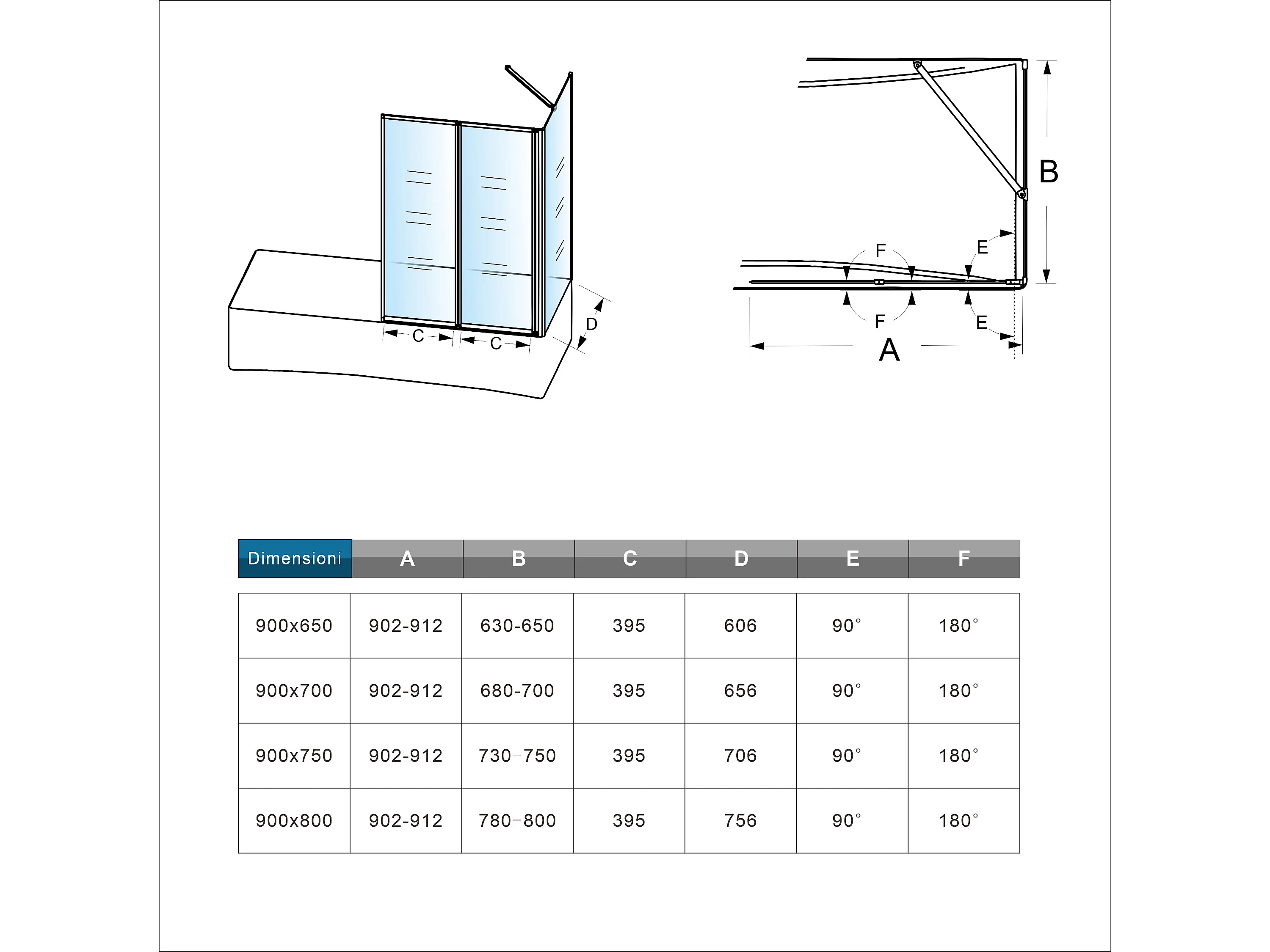 Parete Vasca Doccia 90x70cm Sopravasca Angolare 2 Ante Pieghevoli Vetro Temperato da 4 mm con Parete Laterale da 6 mm H.140cm Telai Neri Opachi