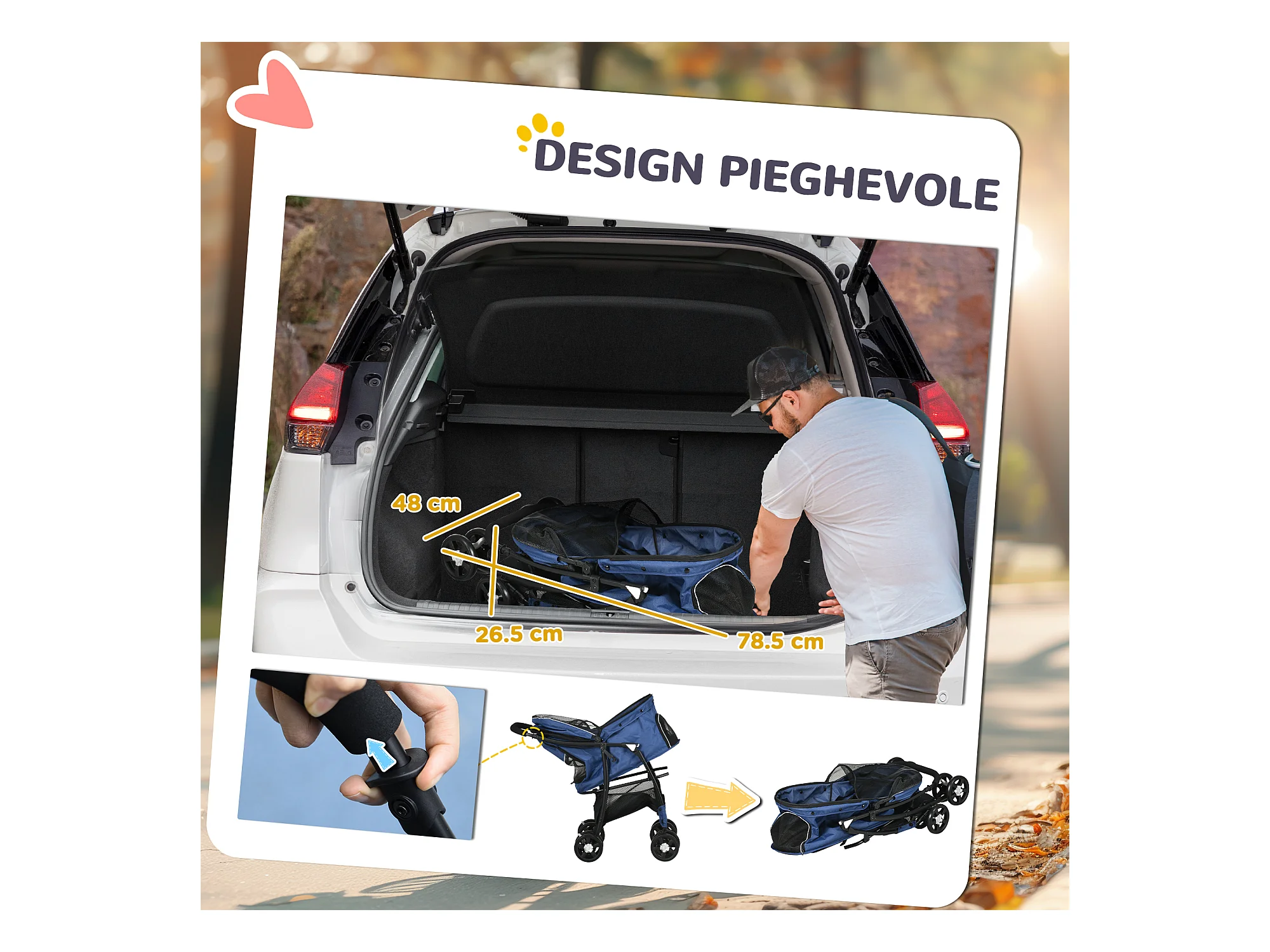 Passeggino per cani pieghevole con copertura antipioggia e freni blu
