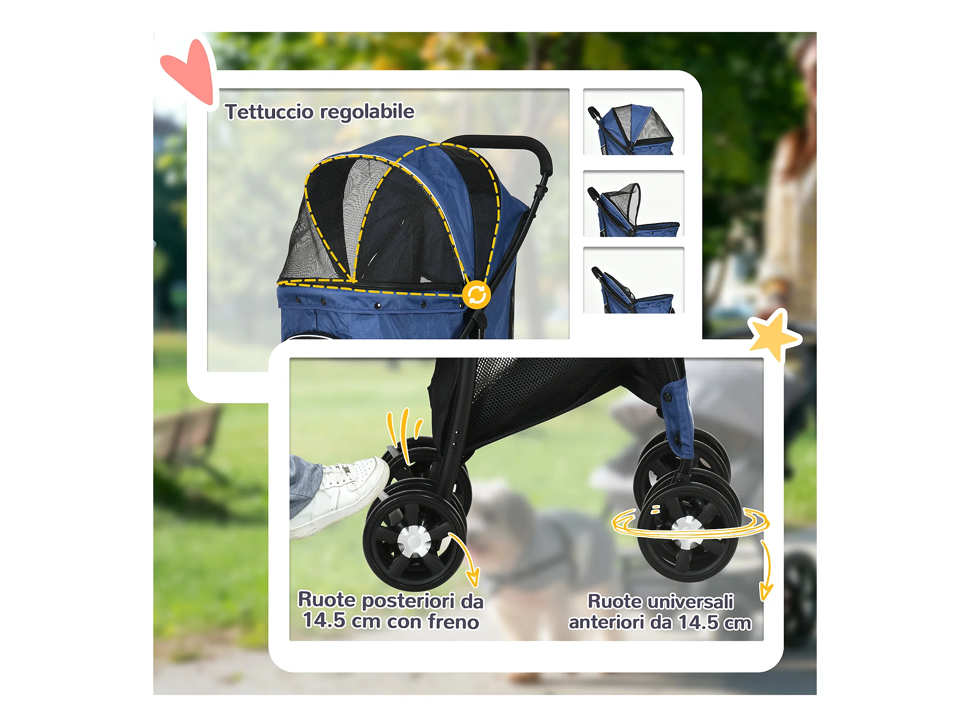Passeggino per cani pieghevole con tettuccio e ruote girevoli blu