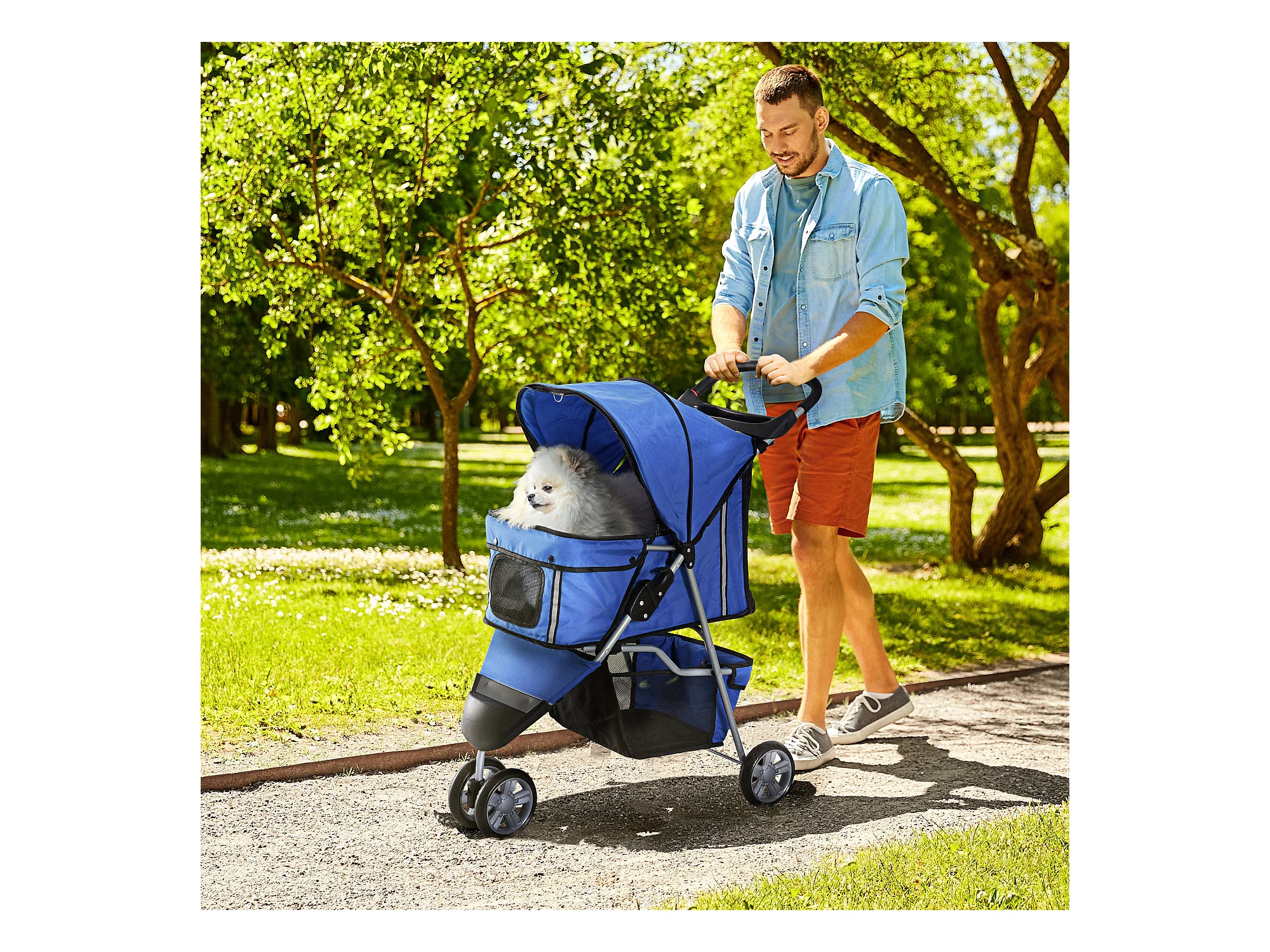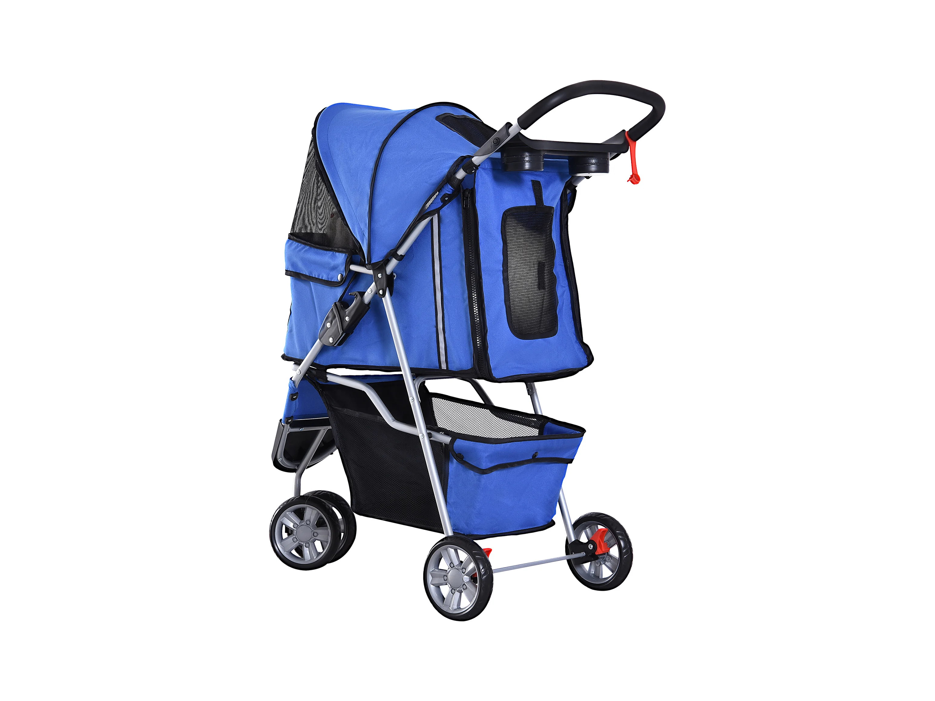 Passeggino per cani pieghevole ruote girevoli cestino portaoggetti blu