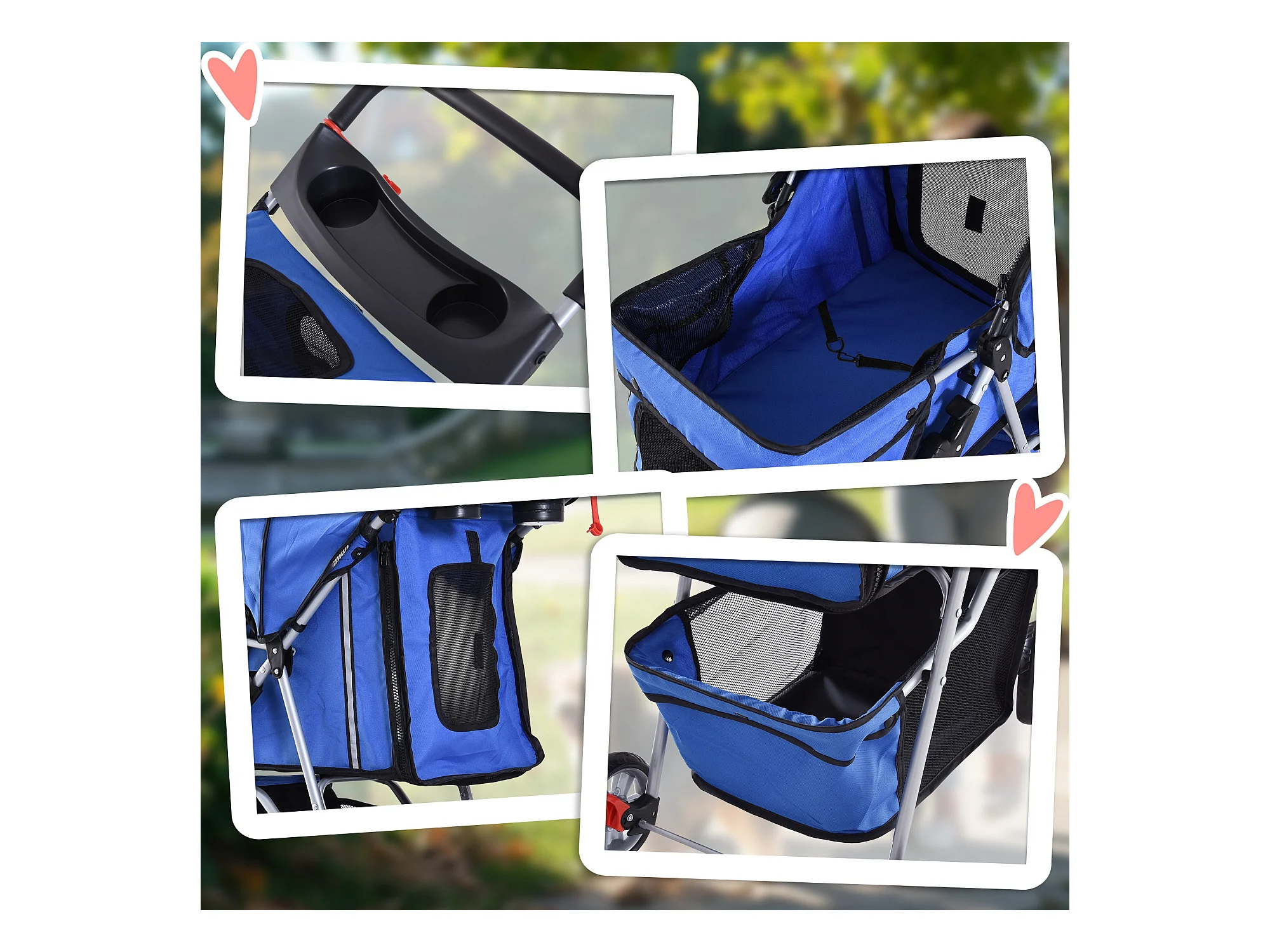 Passeggino per cani pieghevole con copertura antipioggia e freni blu