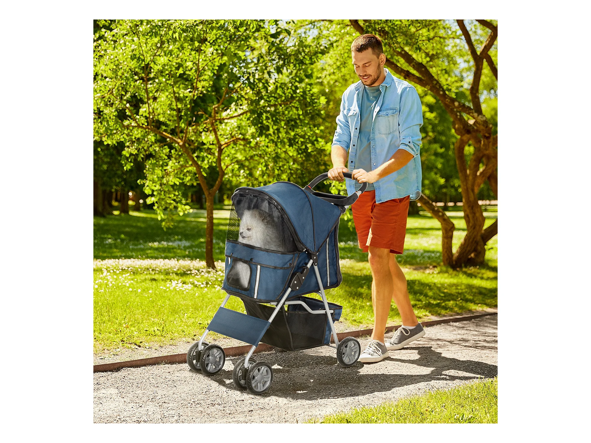 Passeggino pieghevole per cani e gatti, in poliestere resistente, blu, con ruote girevoli e copertura regolabile (76,5x52x95 cm)