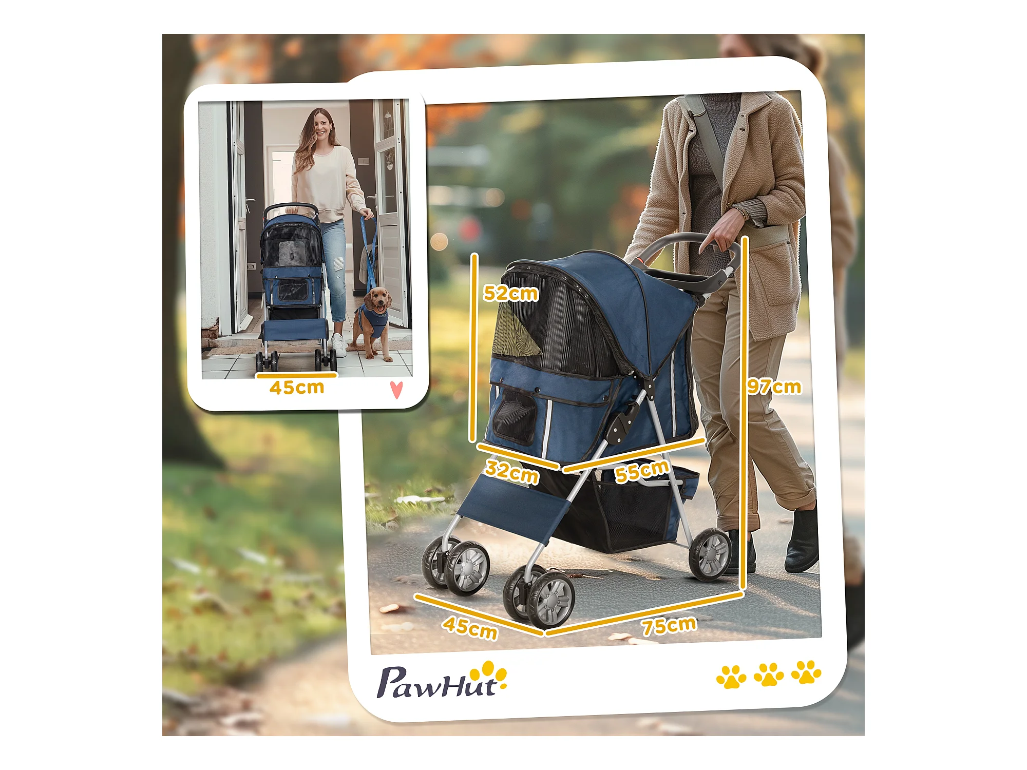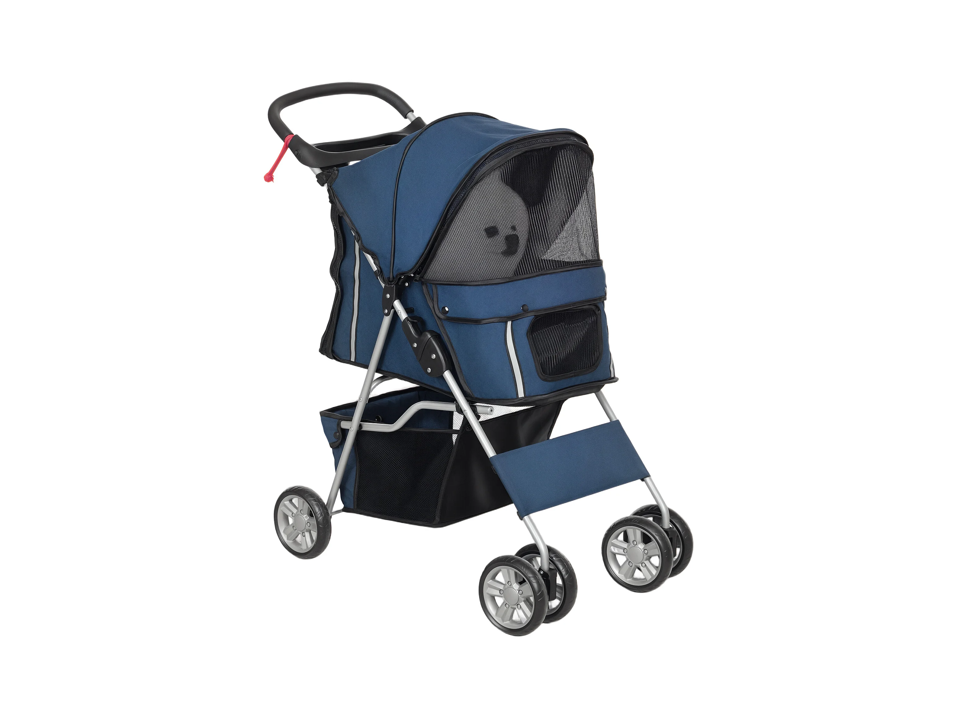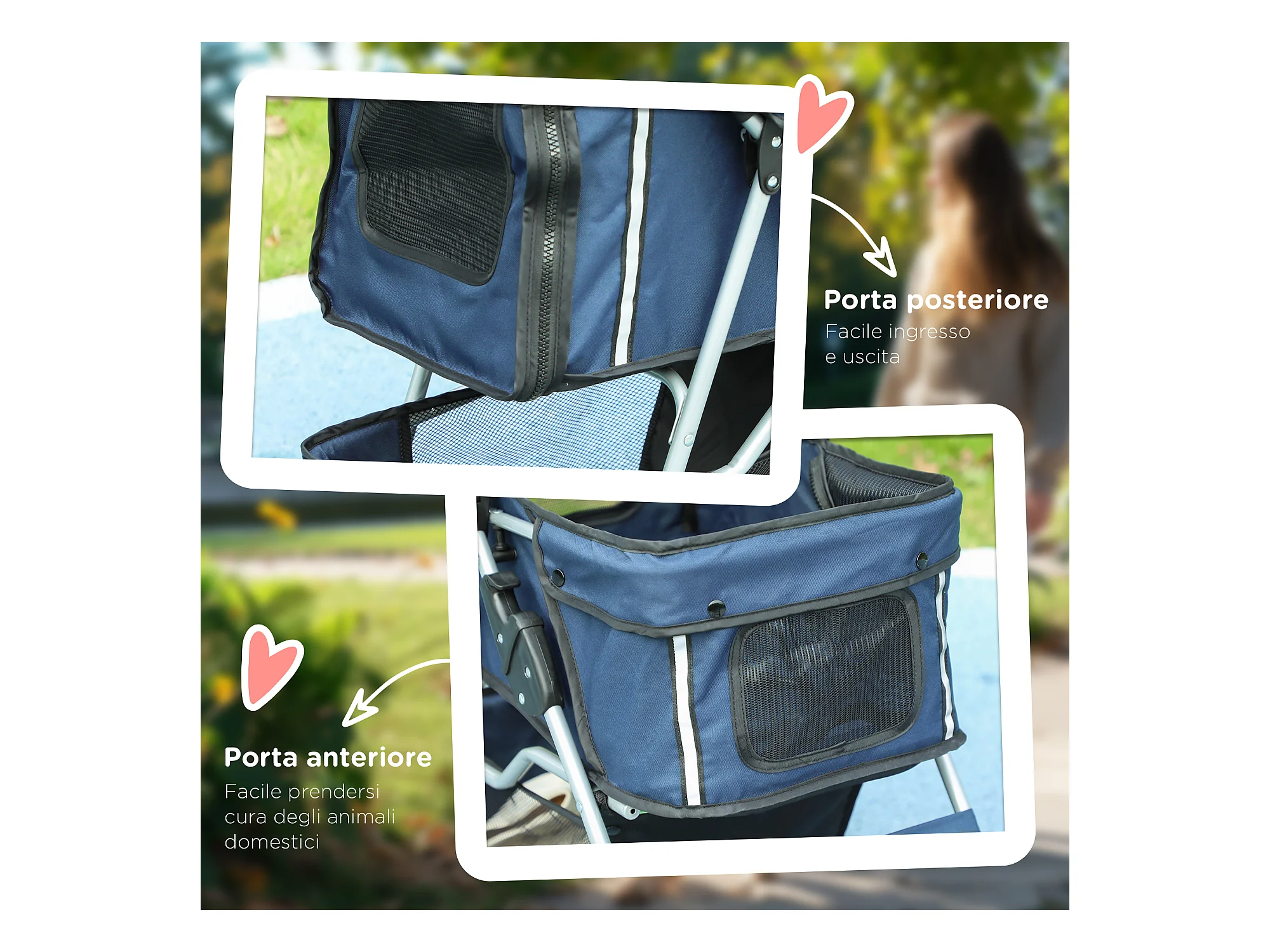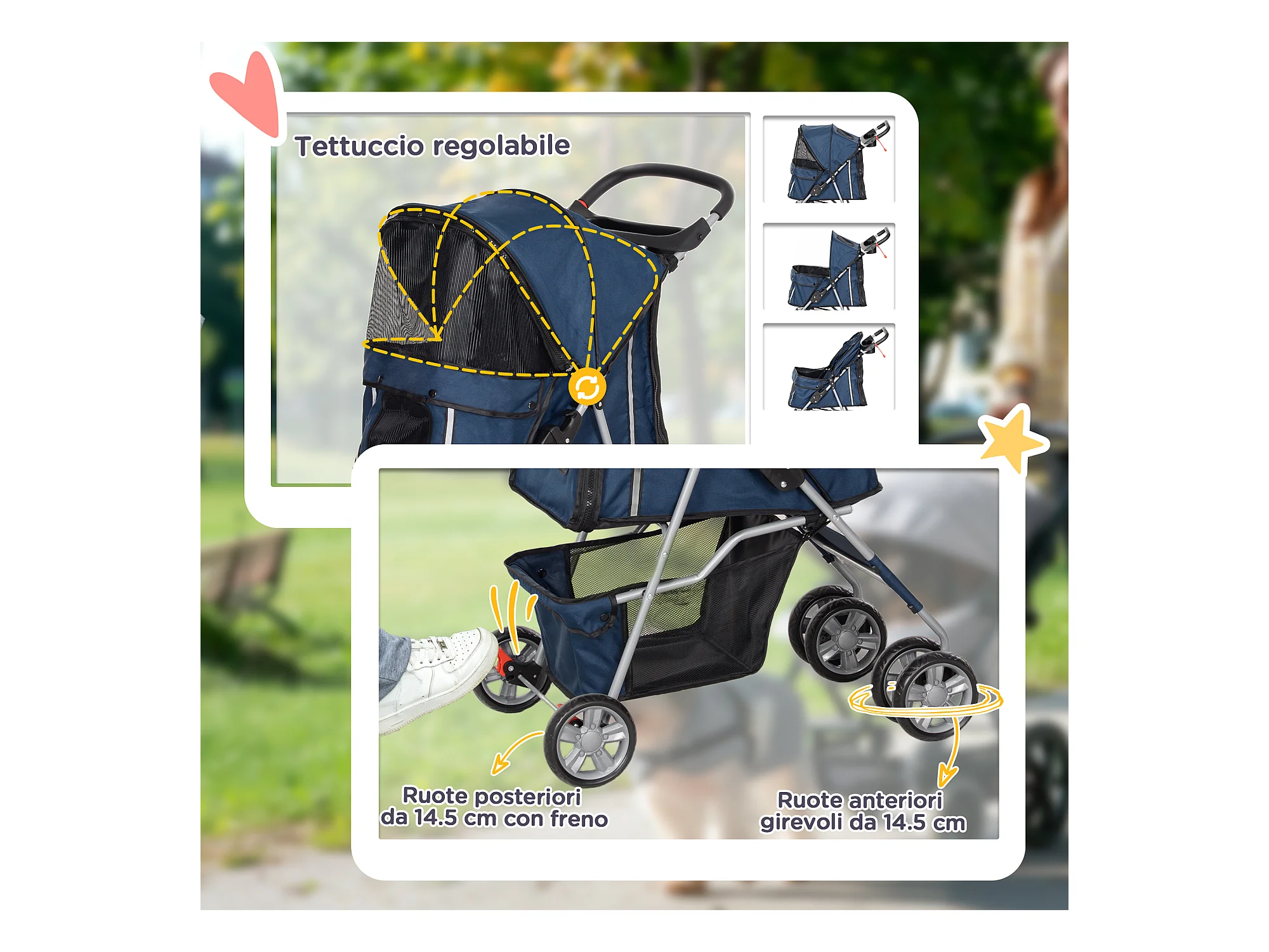 Passeggino per cani pieghevole ruote girevoli cestino portaoggetti blu