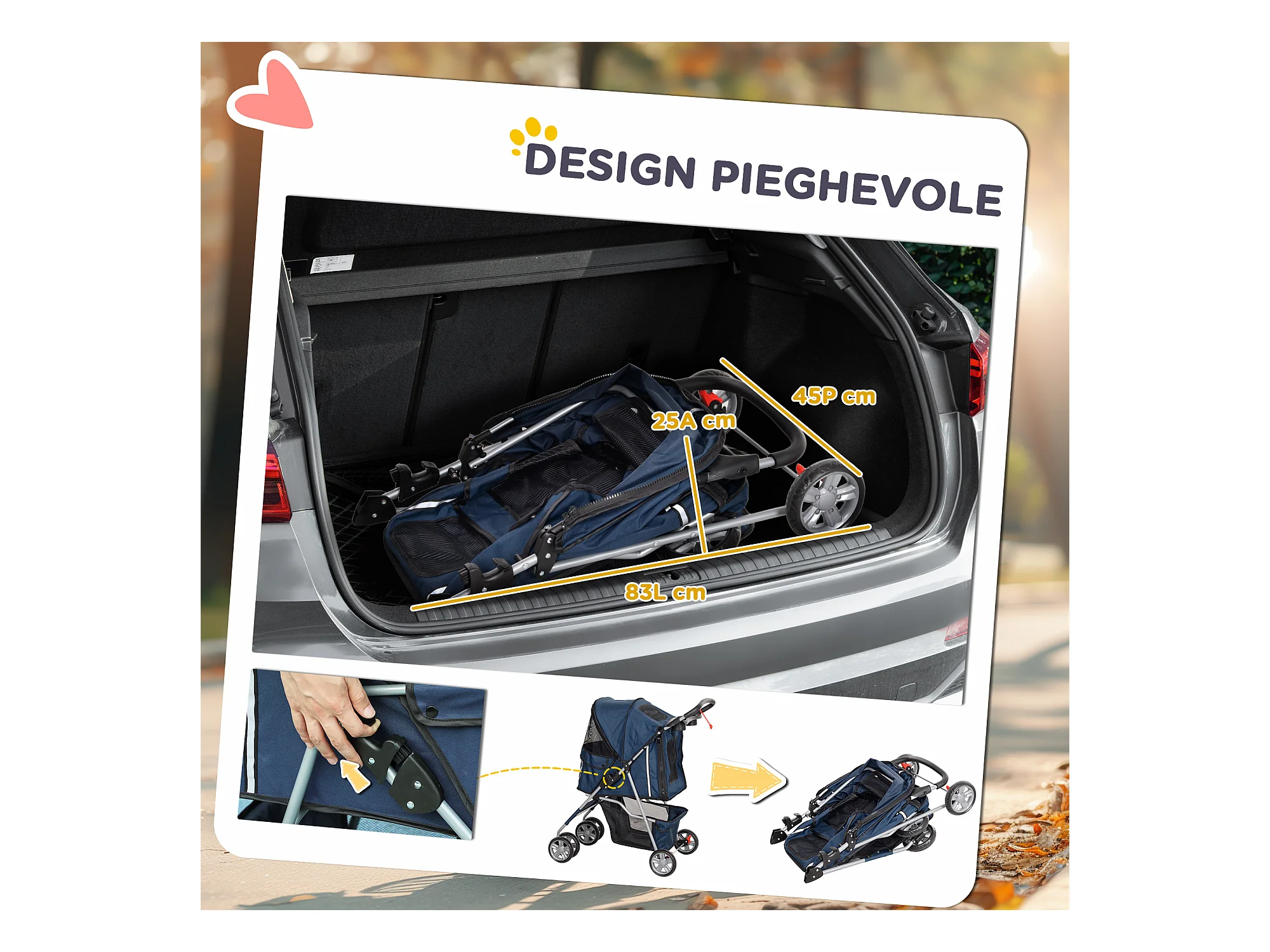 Passeggino per cani pieghevole con tettuccio e ruote girevoli blu
