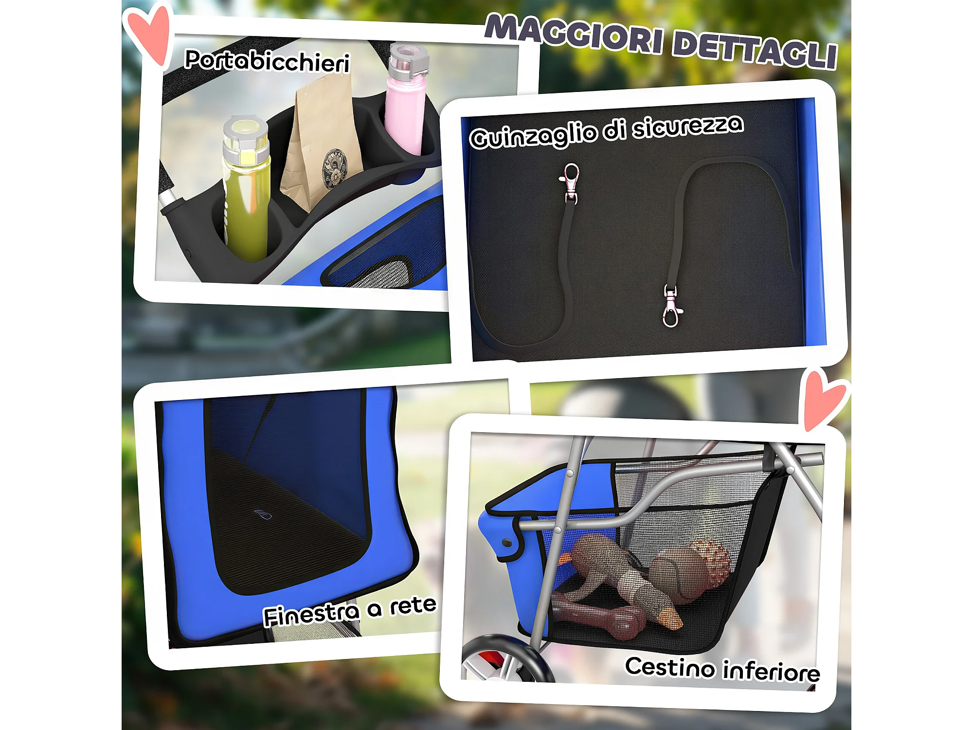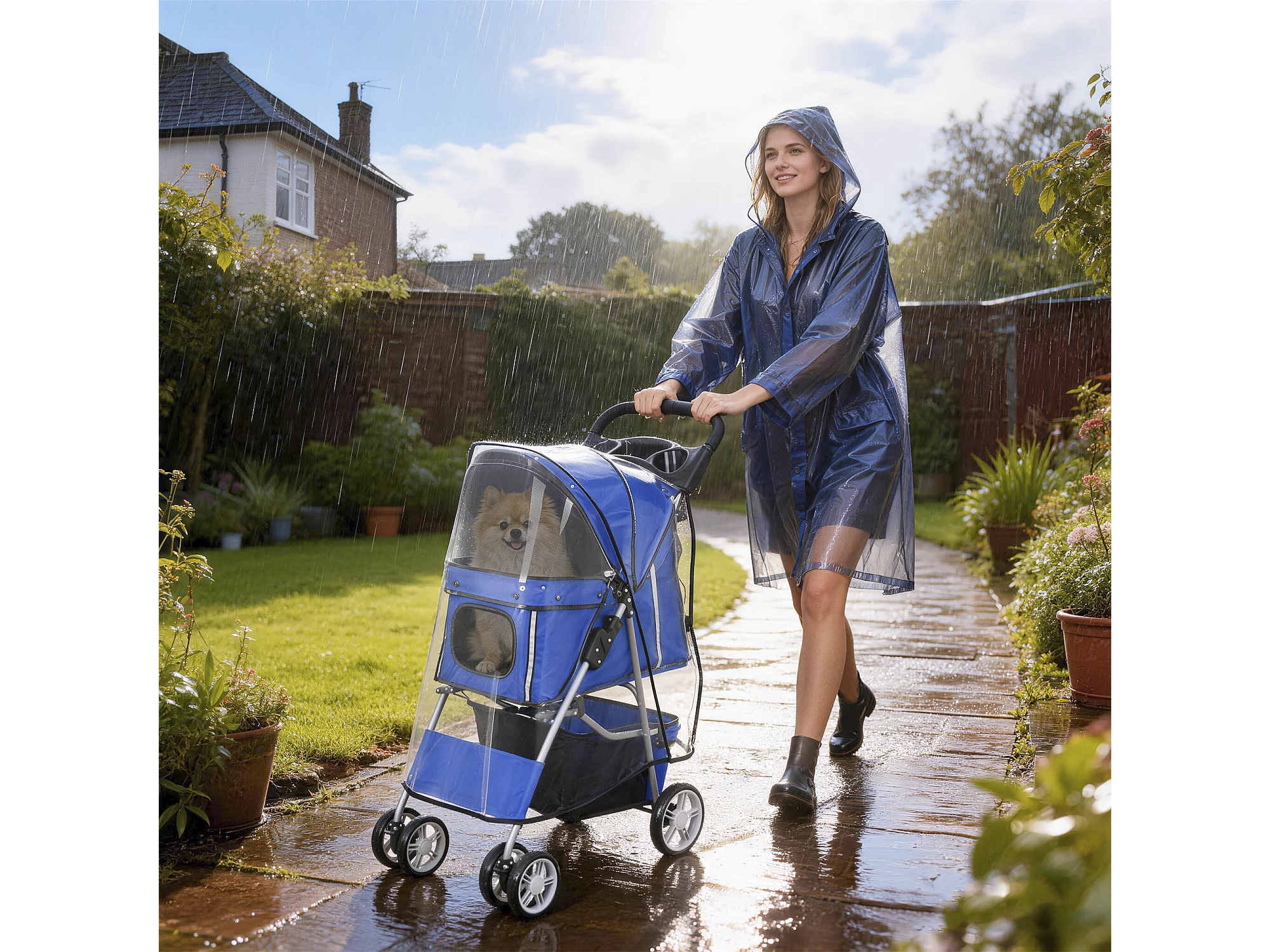 Passeggino per cani pieghevole con copertura antipioggia blu