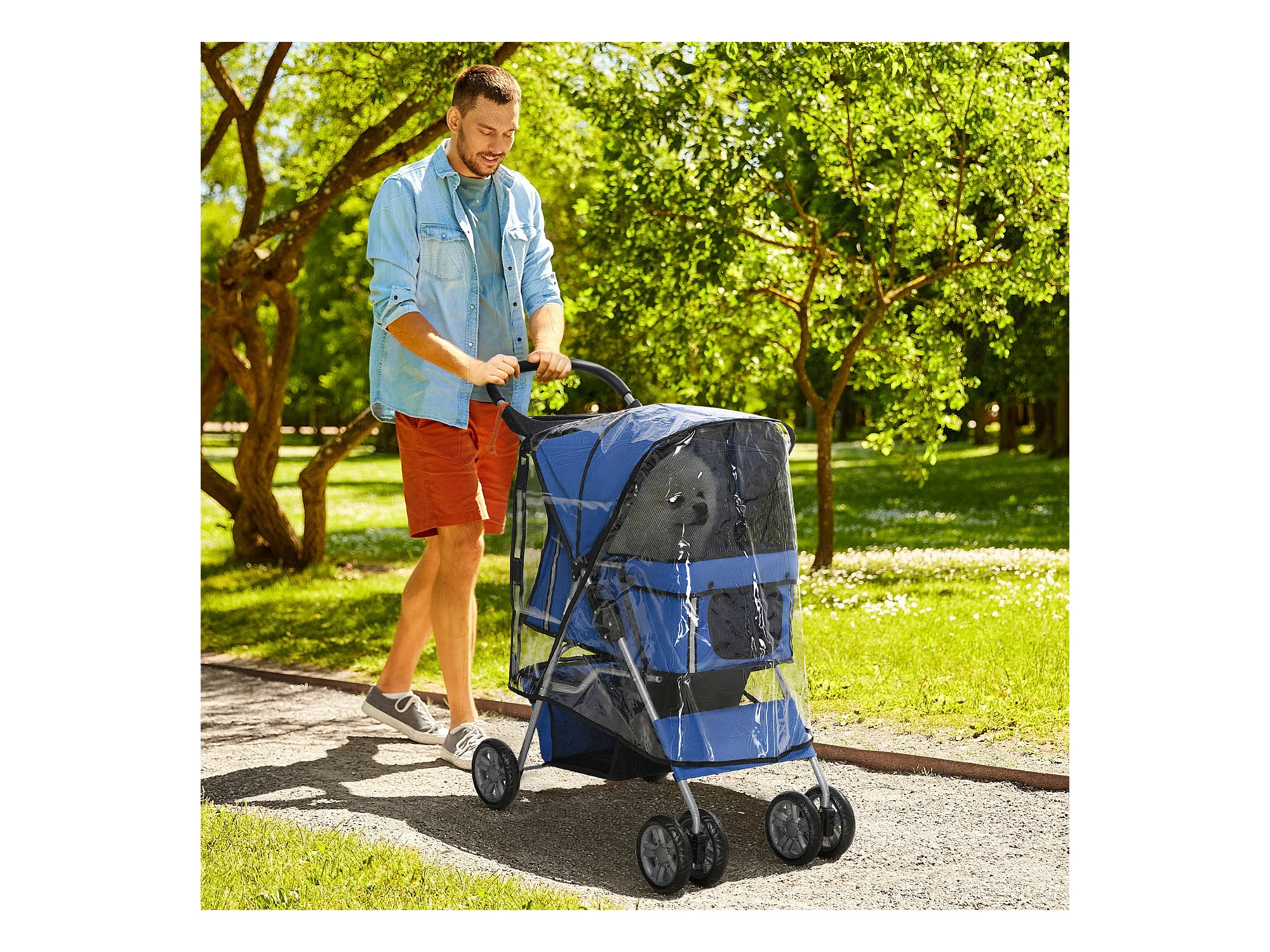 Passeggino per cani pieghevole con copertura antipioggia e freni blu