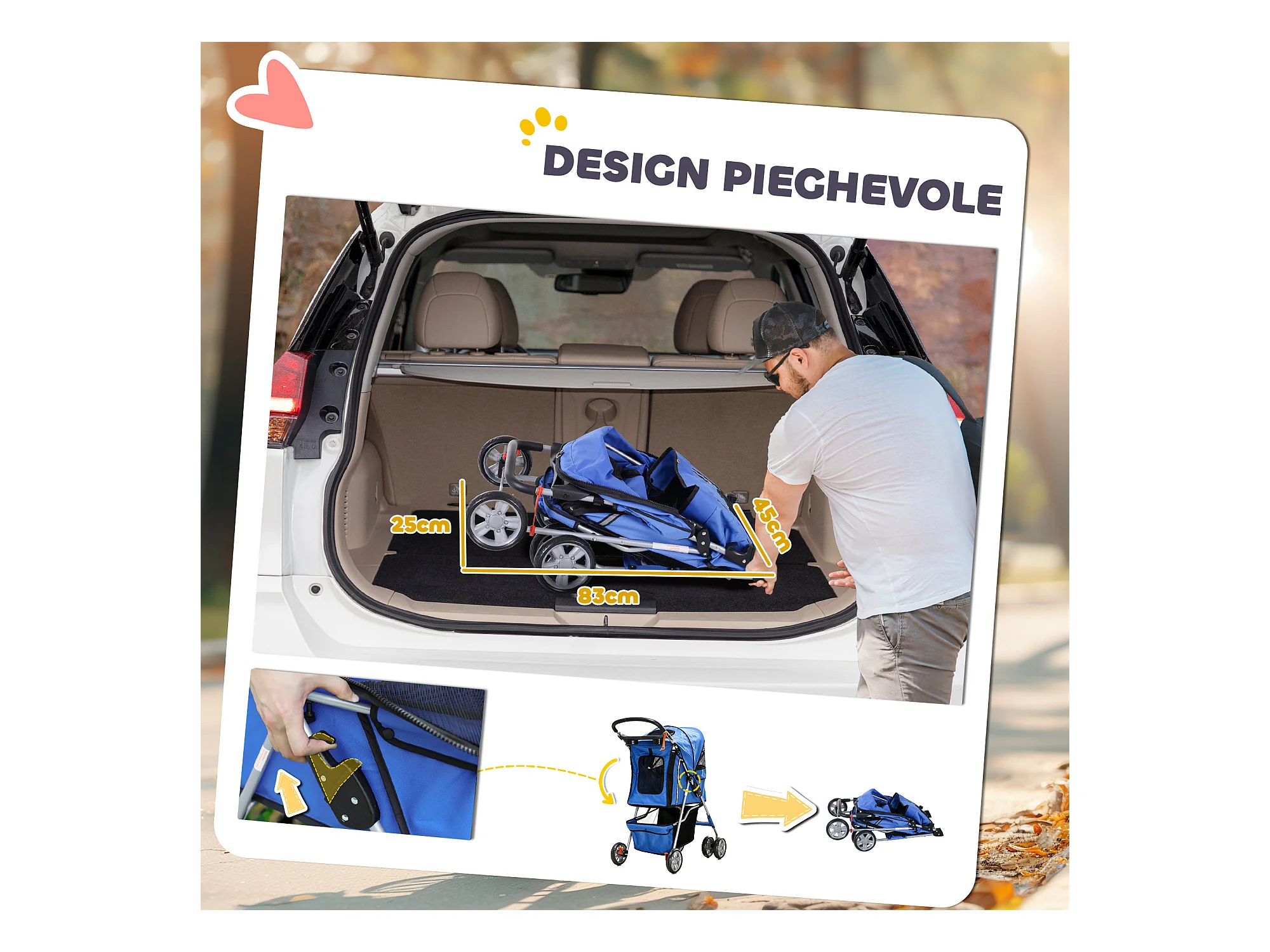 Passeggino per cani pieghevole con tettuccio e ruote girevoli blu