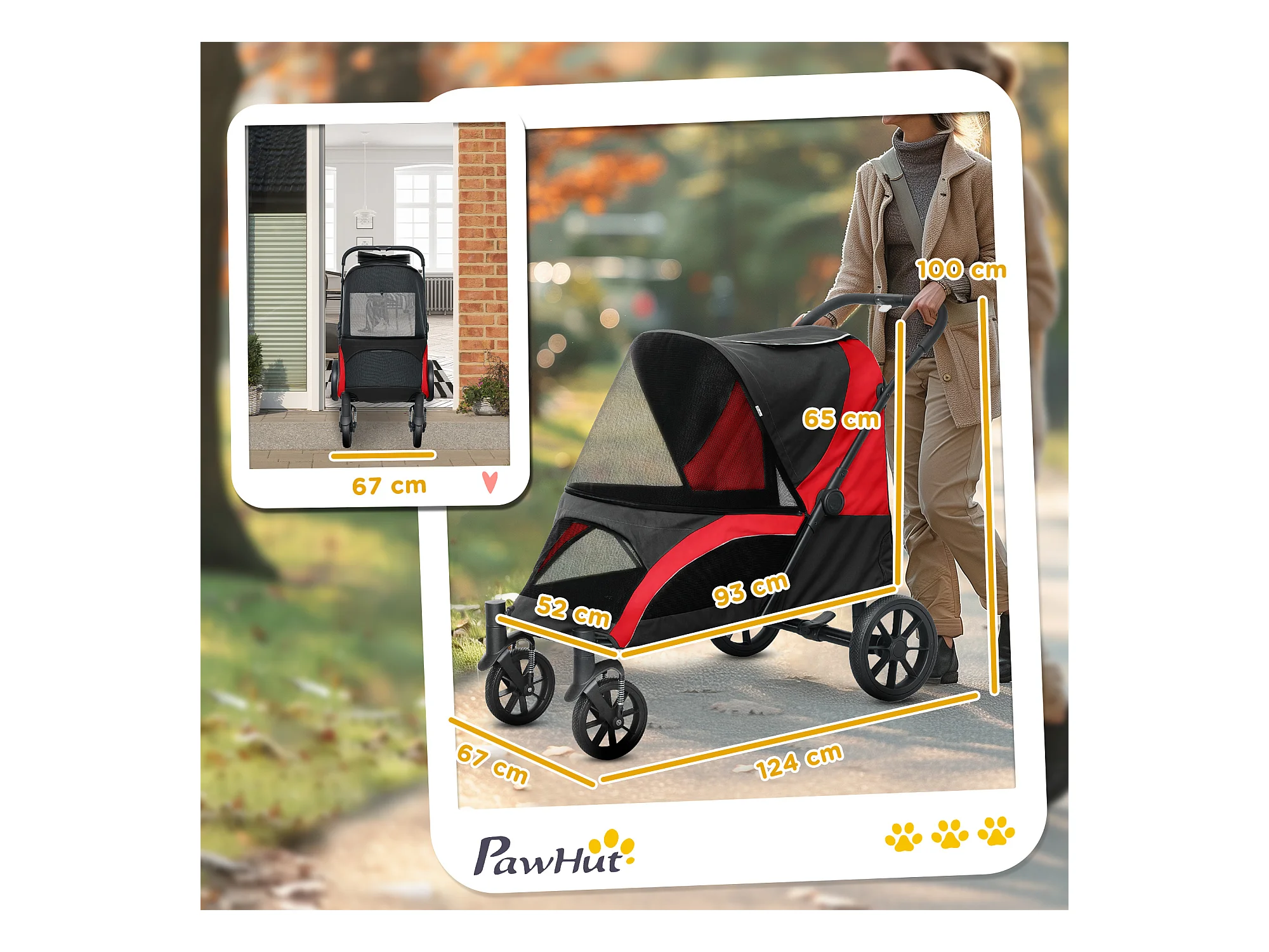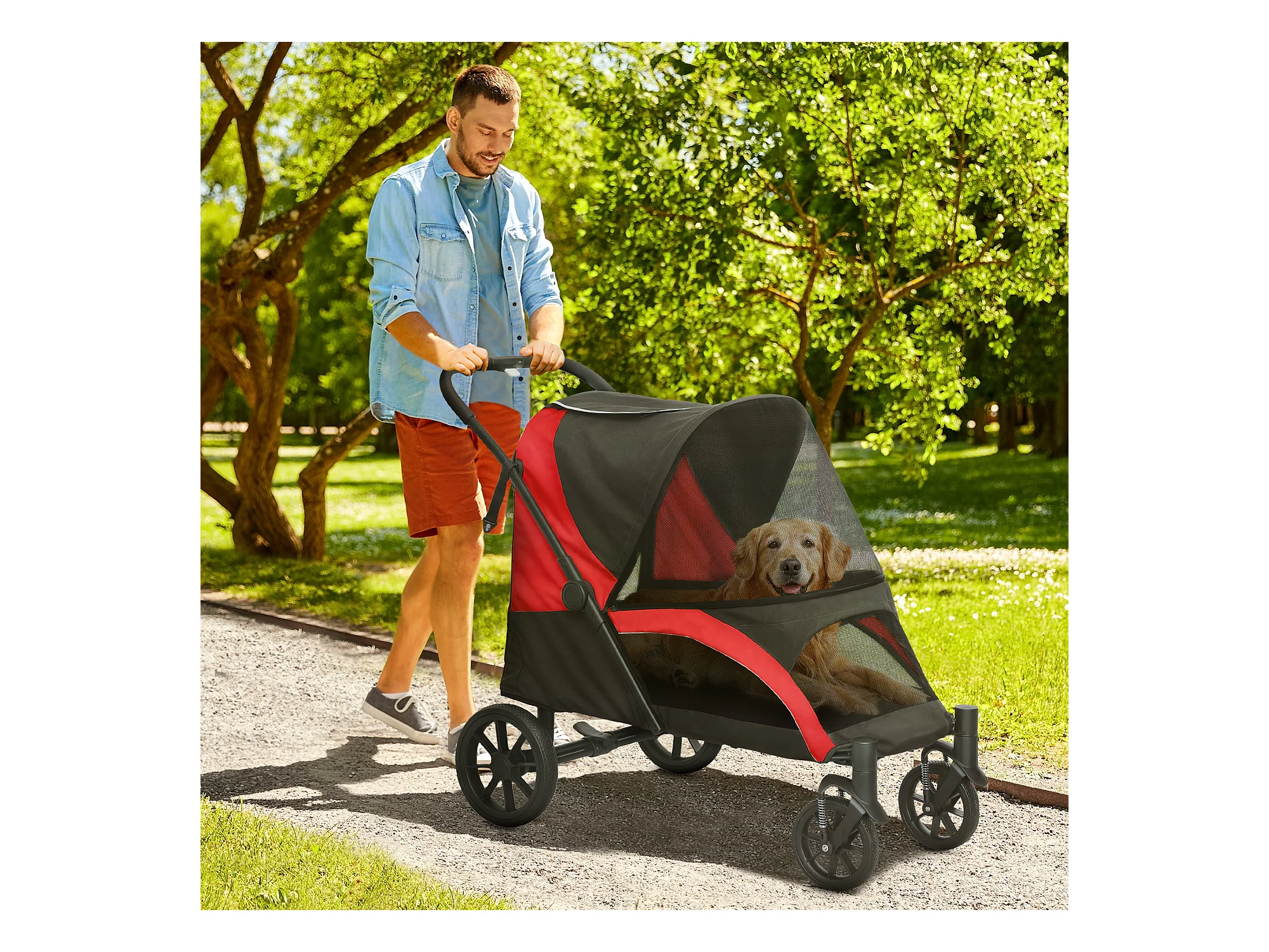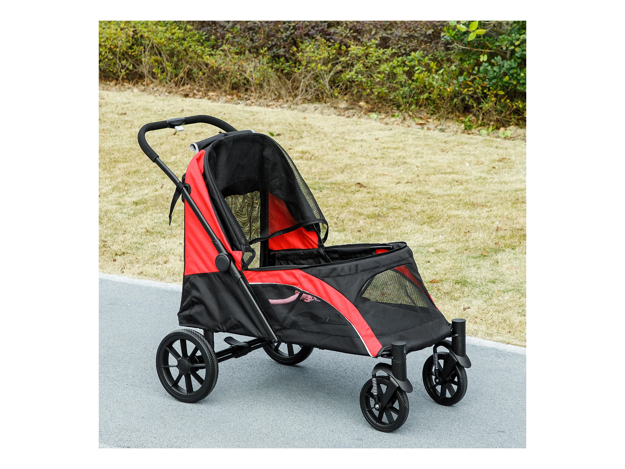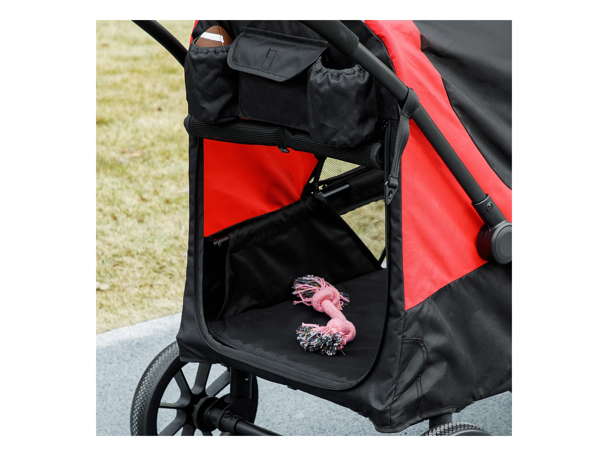Passeggino per cani pieghevole con ingressi a cerniera rosso e nero