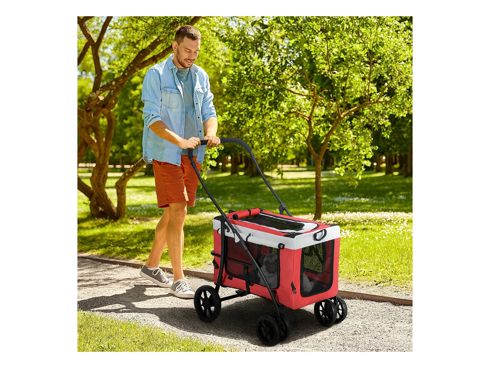 Carrello per cani e gatti, design pieghevole con rivestimento in poliestere, rosso, 4 ruote girevoli (76,5x52x95 cm)