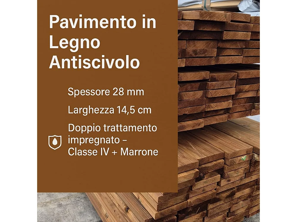 Pavimento in Legno Antiscivolo da 200 cm per Esterno, sezione 14,5x2,8 cm, Doppia Impregnazione, Marrone