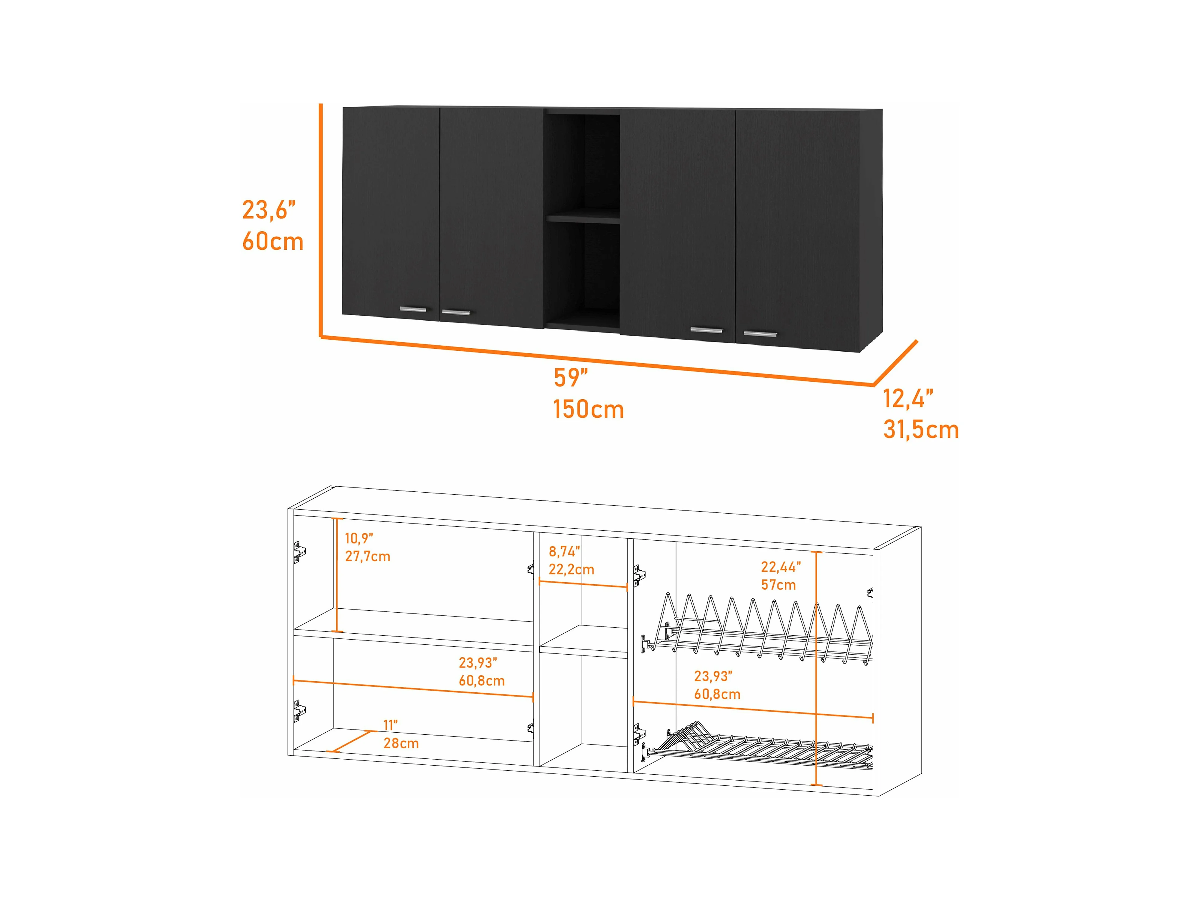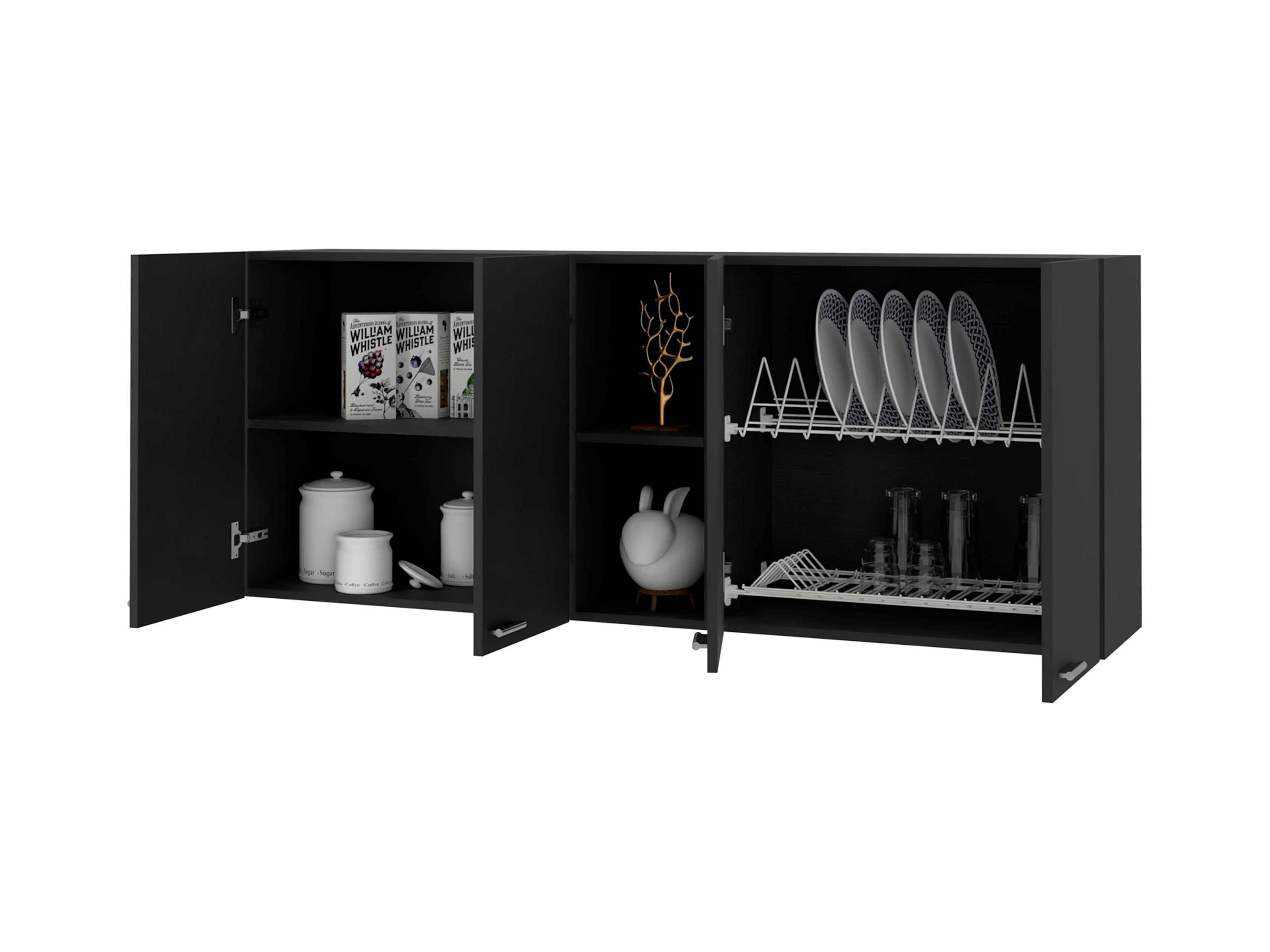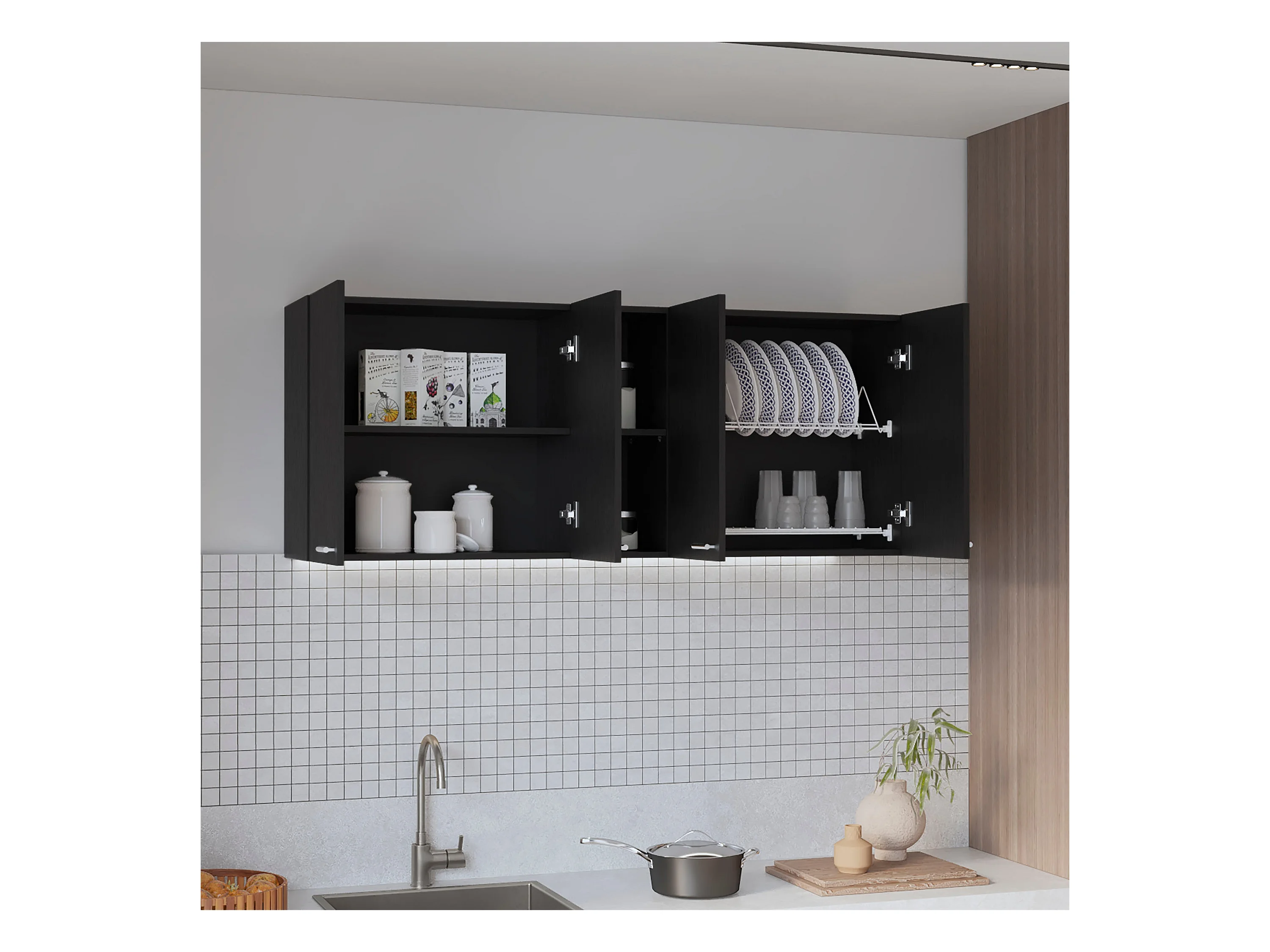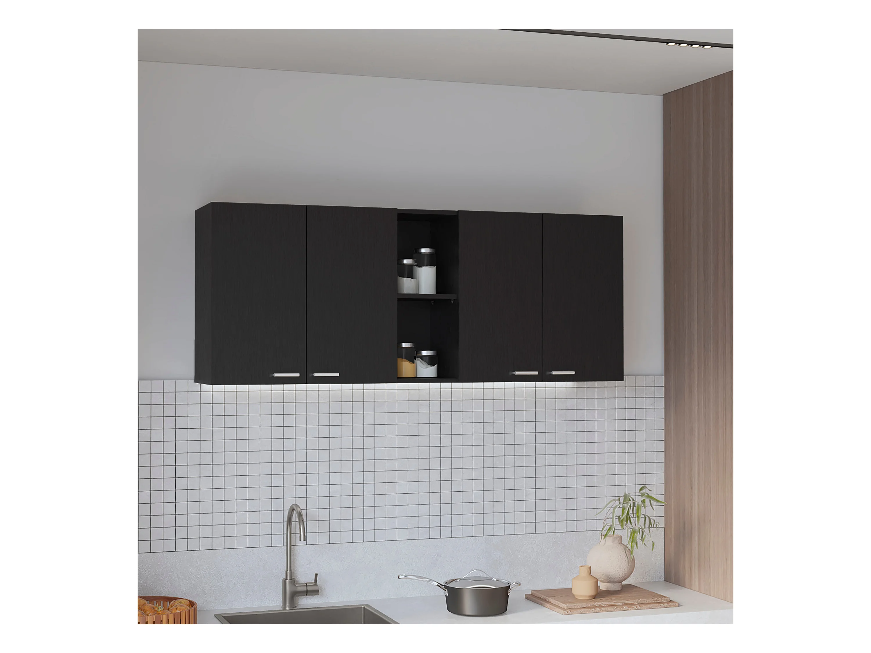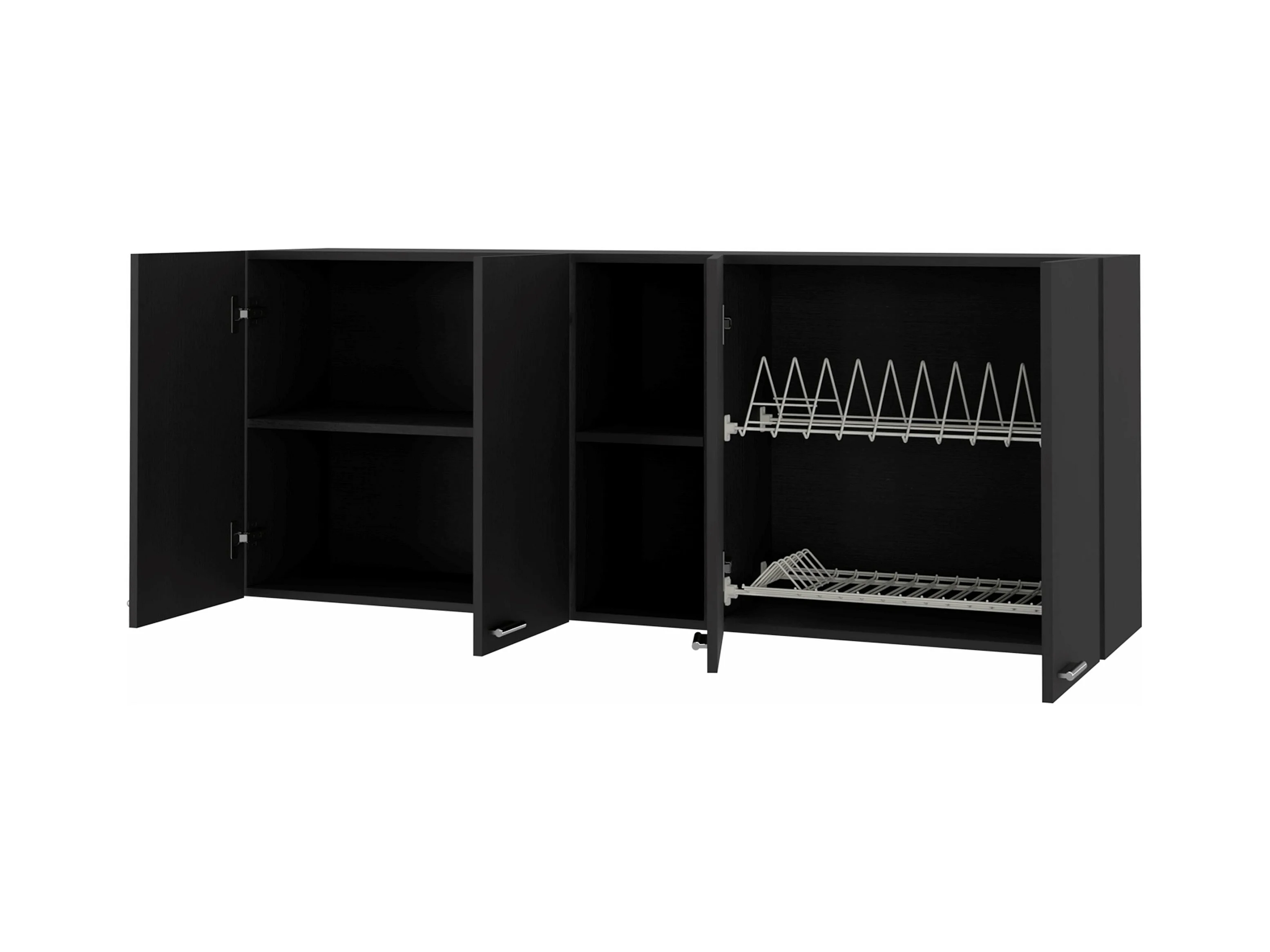 Pensile da cucina in melamina Paris con 4 armadi e 2 ripiani , 59.94 cm X 120 cm X 33.27 cm , Nero