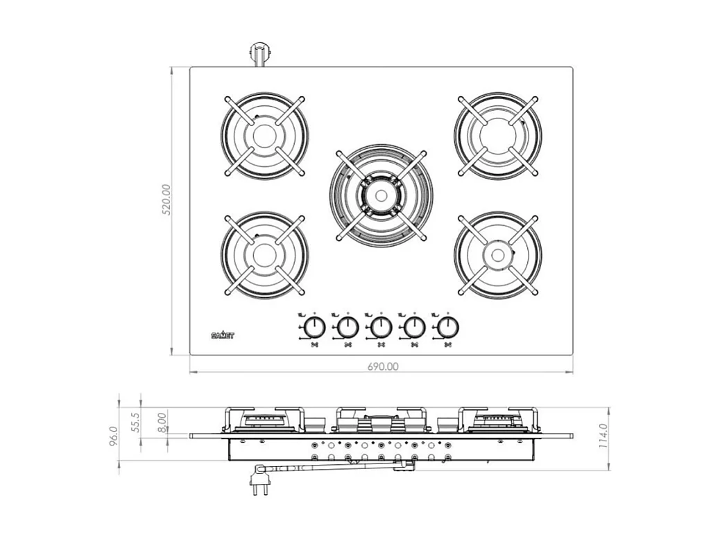 Piano cottura Samet Minerva 70 da incasso a gas 5 fuochi con manopole nere in vetro nero