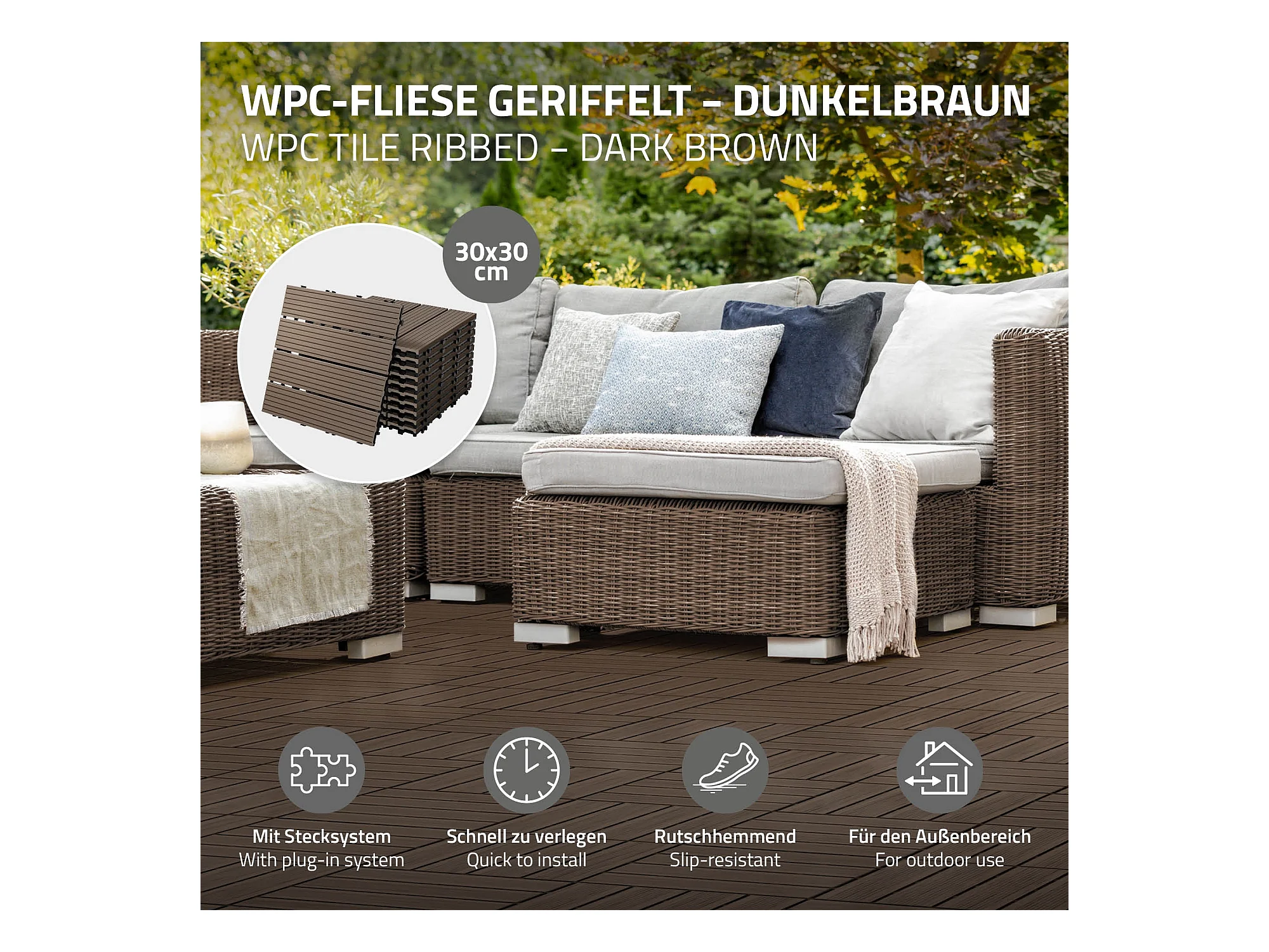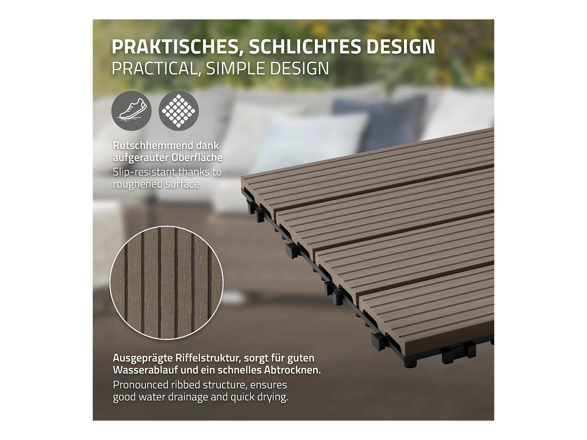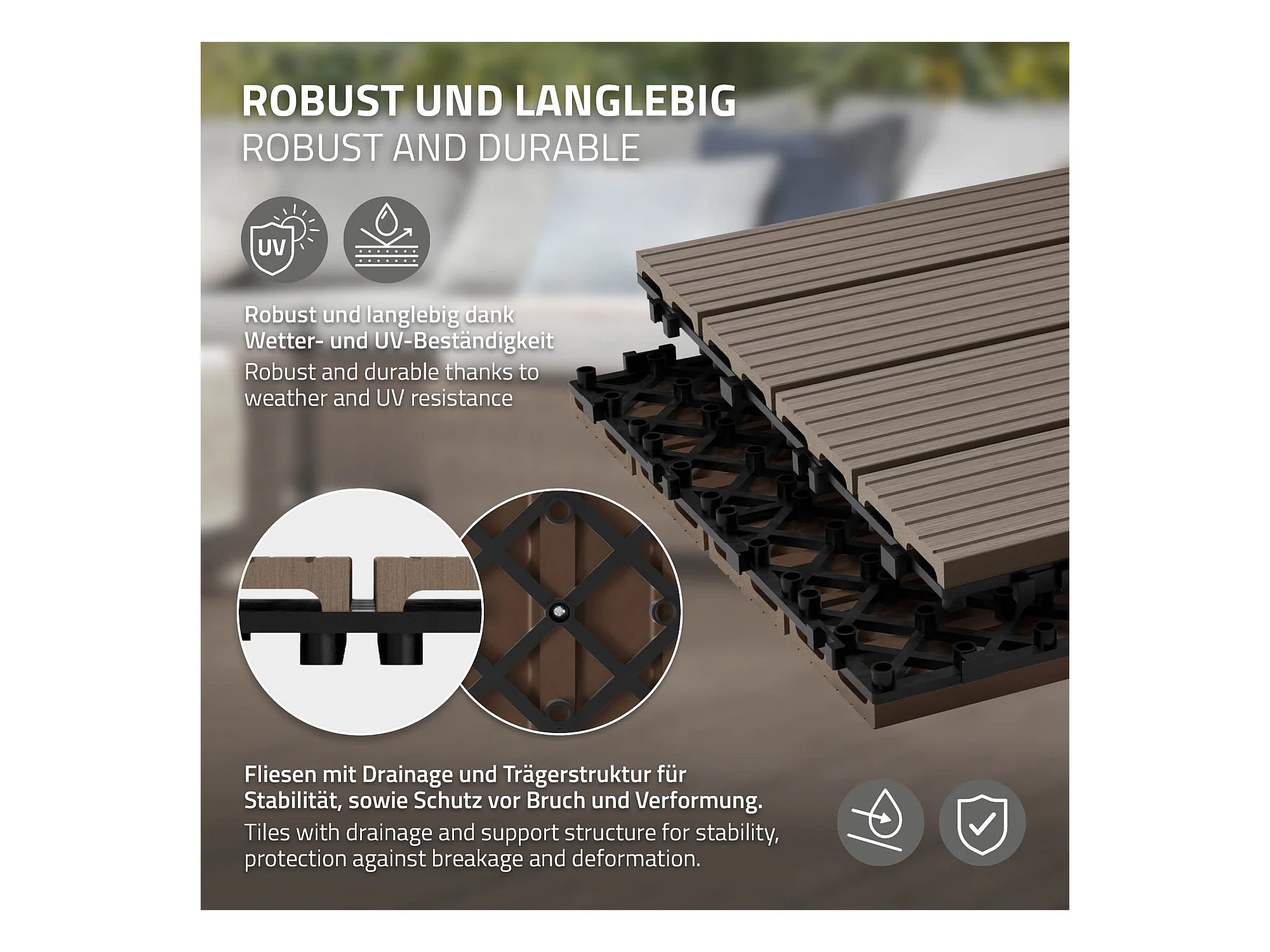 ECD Germany Piastrelle per terrazze wpc 30x30 cm marrone scuro set 44 pz 4 m² effetto legno con drenaggio clic per balconi giardini pavimenti esterni