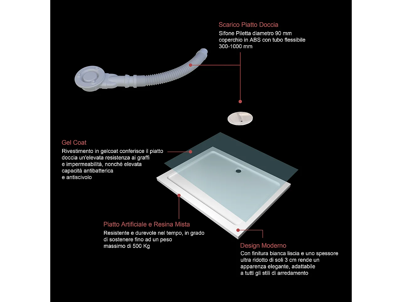 Piatto Doccia 100x80cm Bianco Spessore di 3 cm in Pietra Artificiale e Resina Minerale Mista Piletta Extra Piatta Sottile e Tubo inclusi