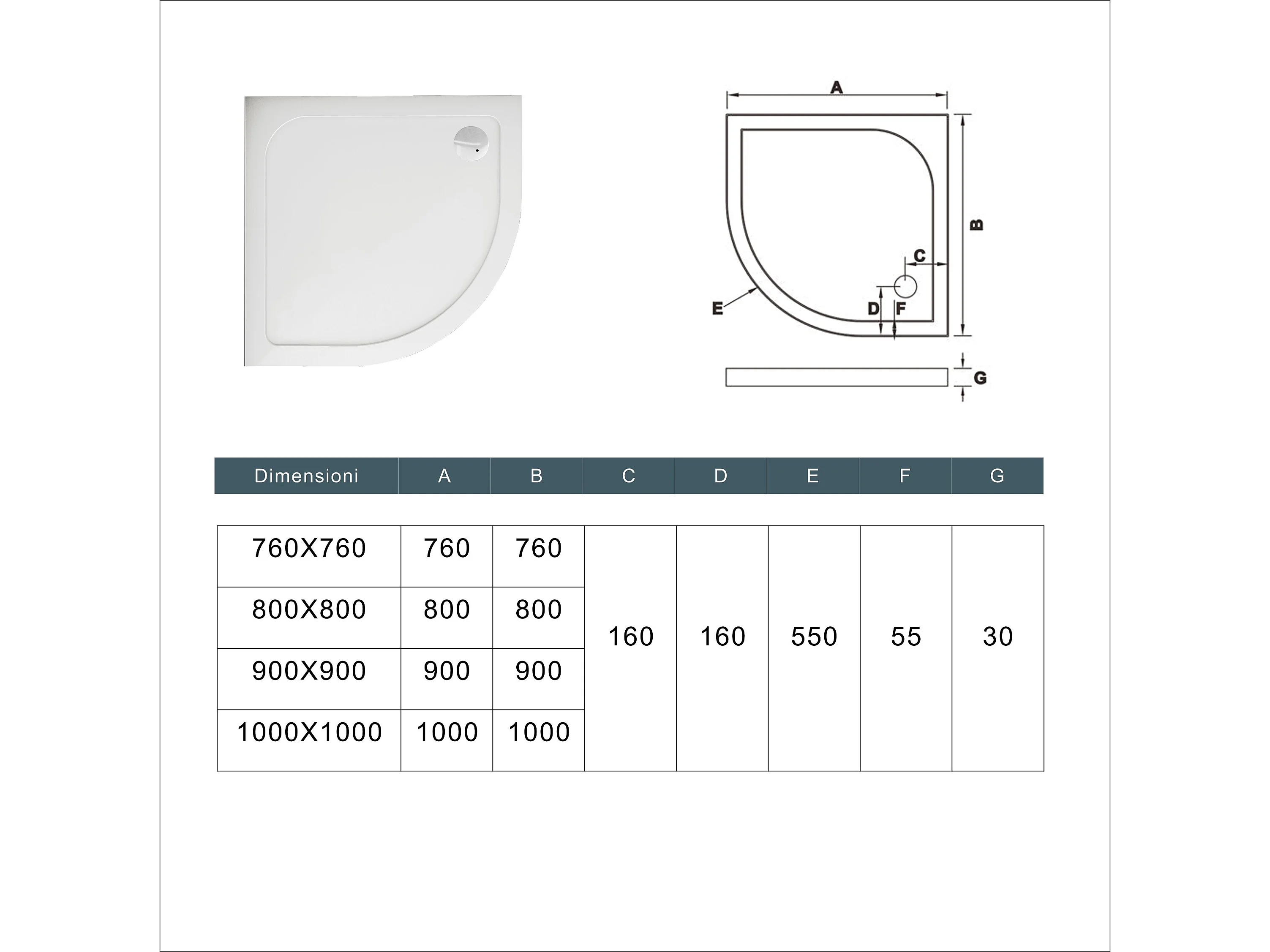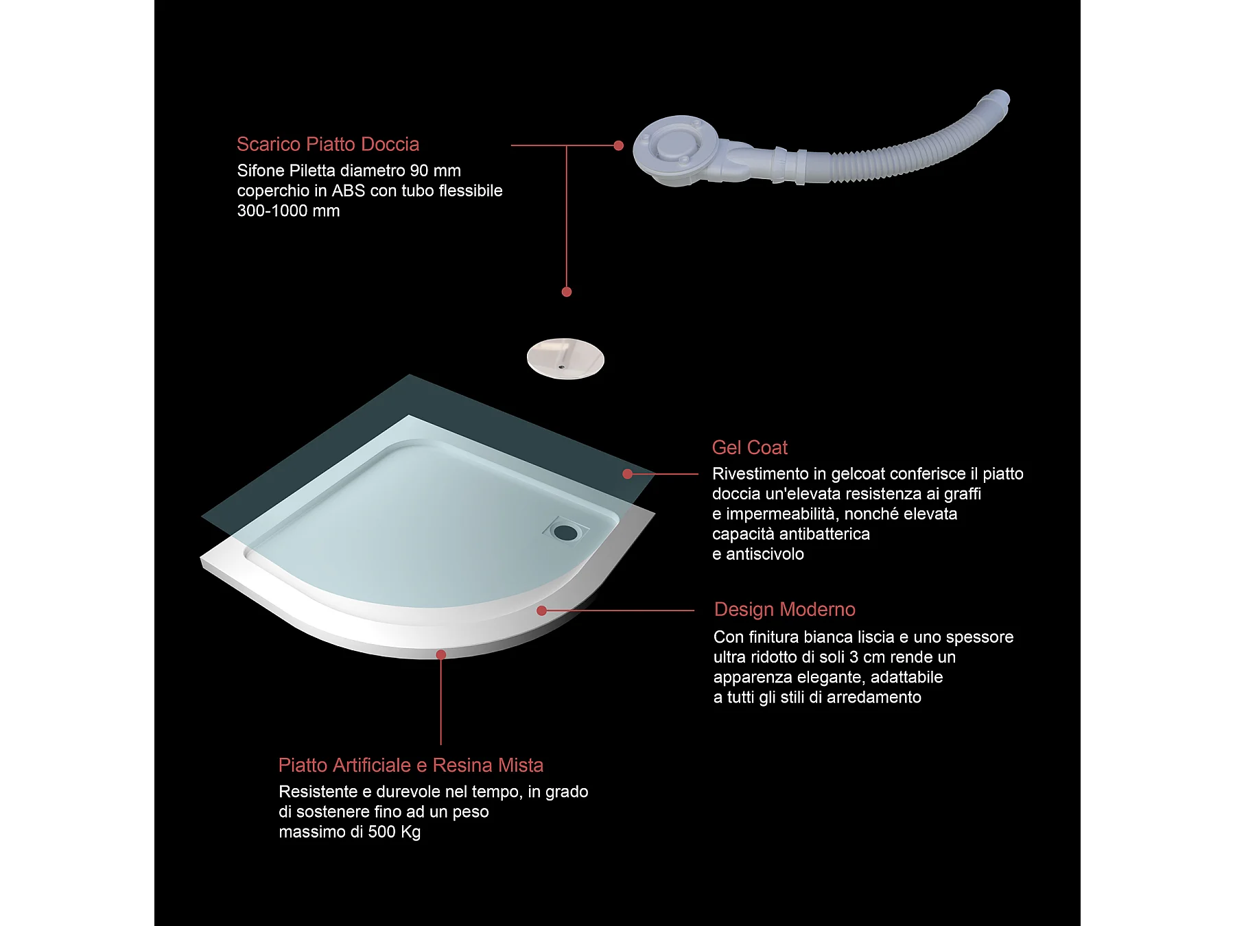 Piatto Doccia Semicircolare 90x90cm Bianco Spessore di 3 cm in Pietra Artificiale e Resina Minerale Mista Piletta Extra Piatta Sottile e Tubo inclusi