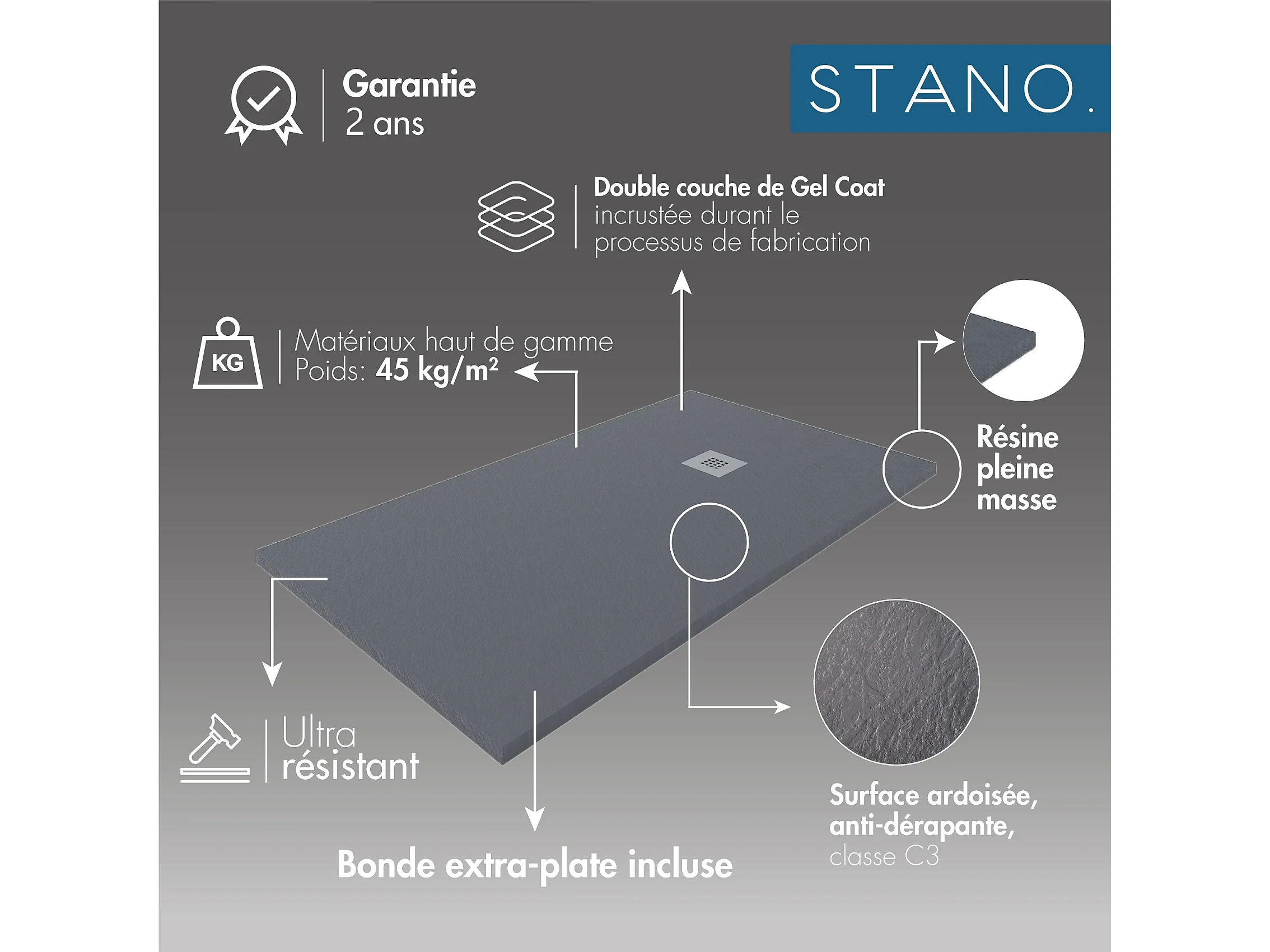 Piatto doccia ultrasottile 90 x 100 cm ELADIO in resina finitura ardesia nero