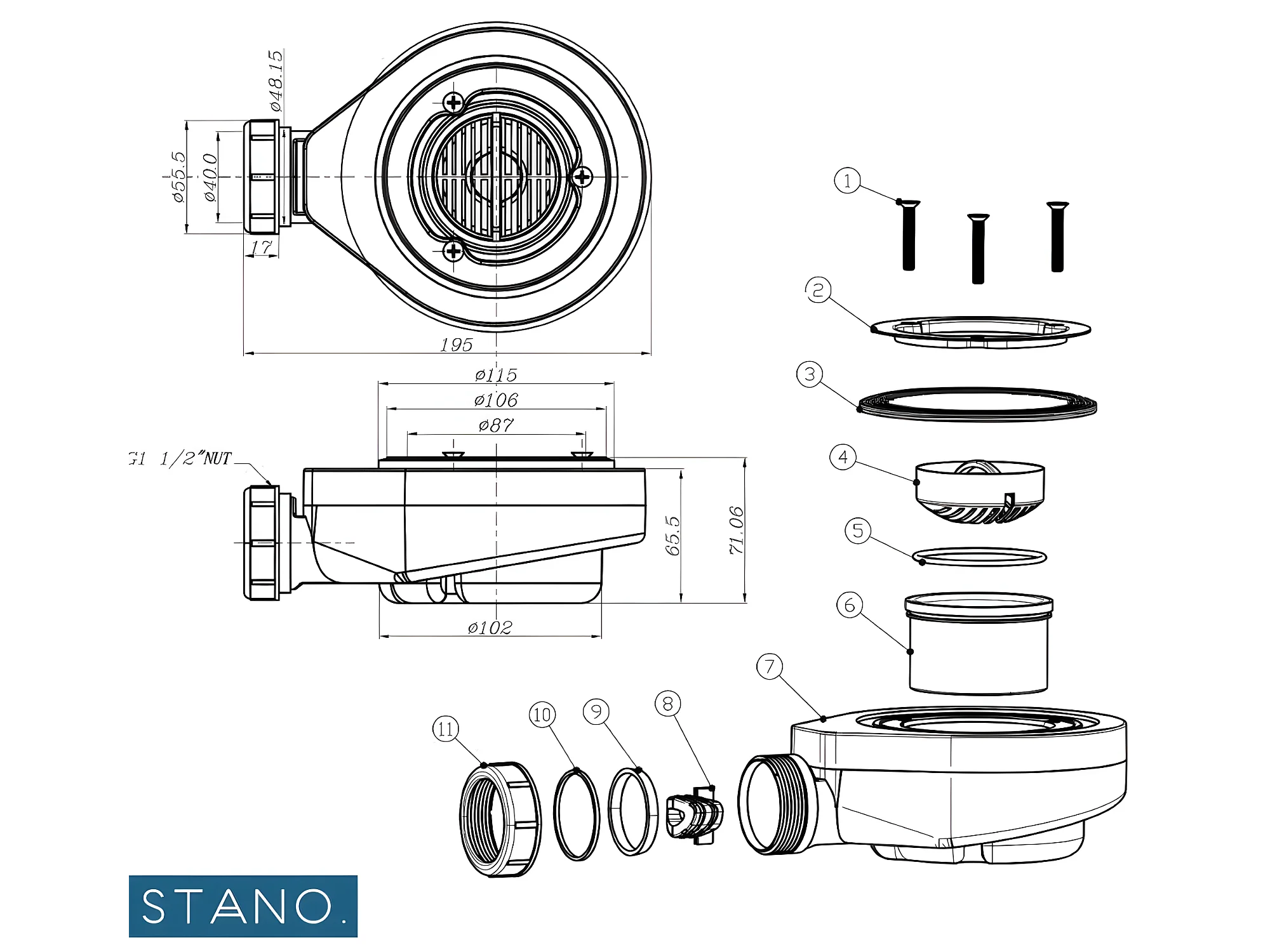 Piletta di scarico orizzontale senza coperchio Ø90 DONA per piatto doccia Solicast®