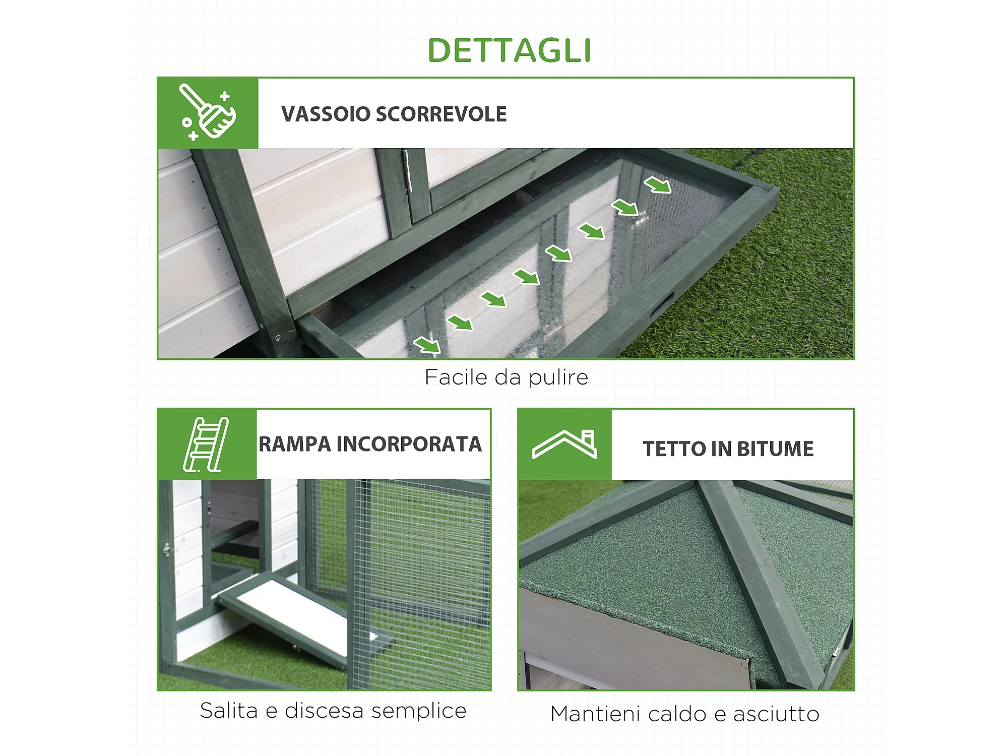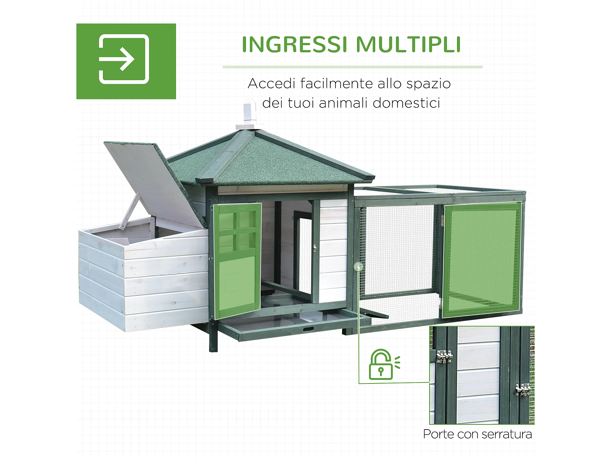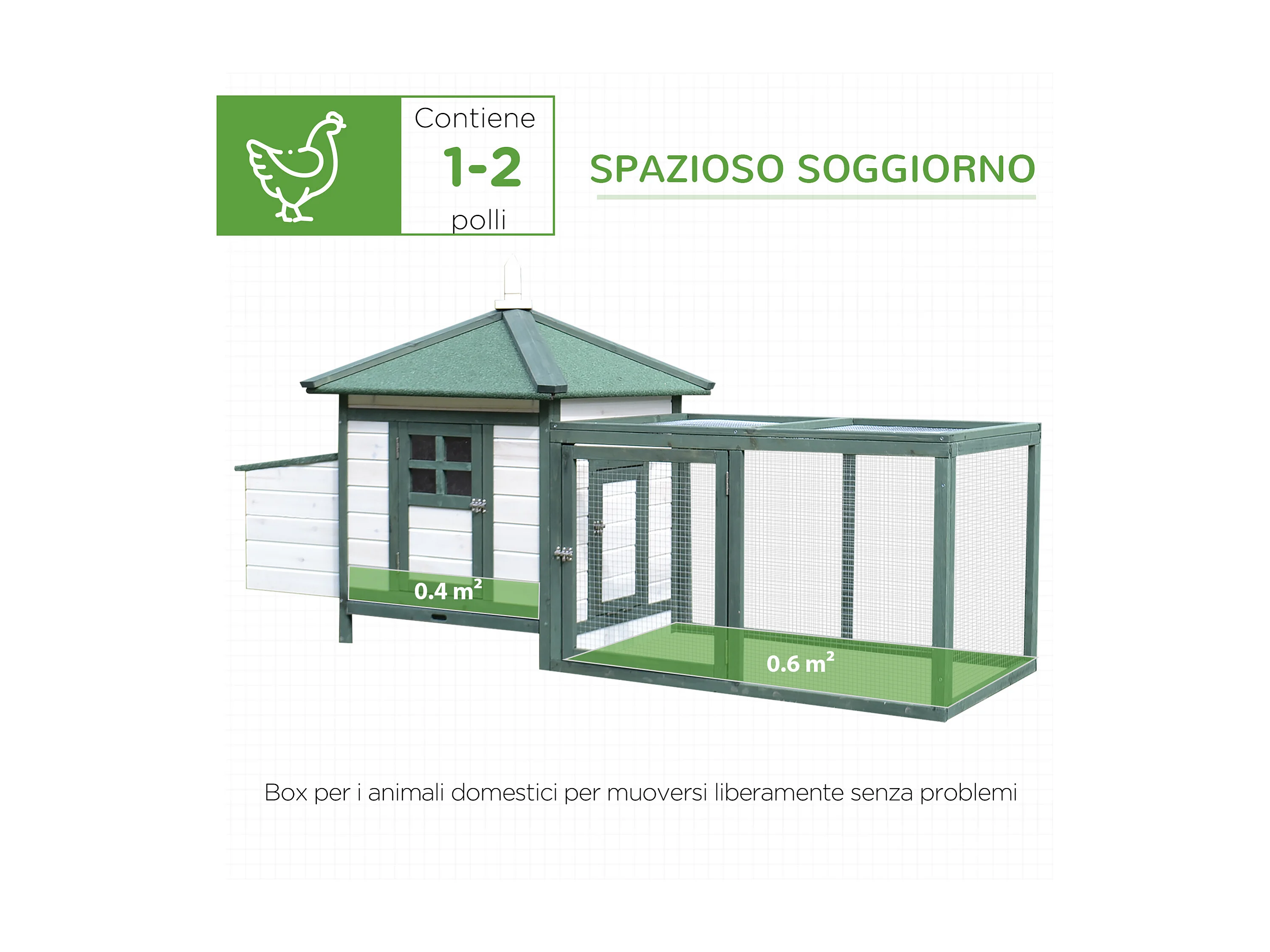 Pollaio da giardino in legno da esterno 196x76x97cm bianco e verde