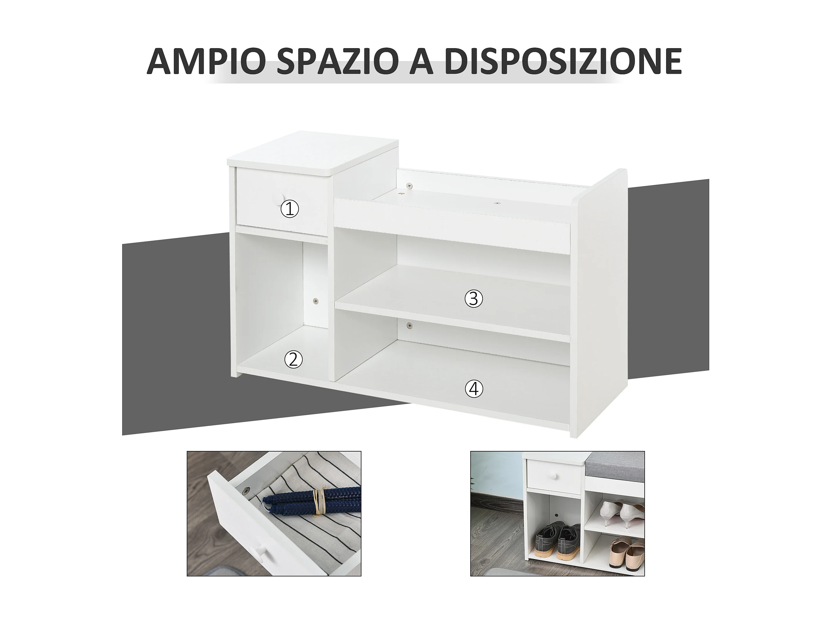 Scarpiera con panca imbottita e armadietto per 4 paia scarpe bianco