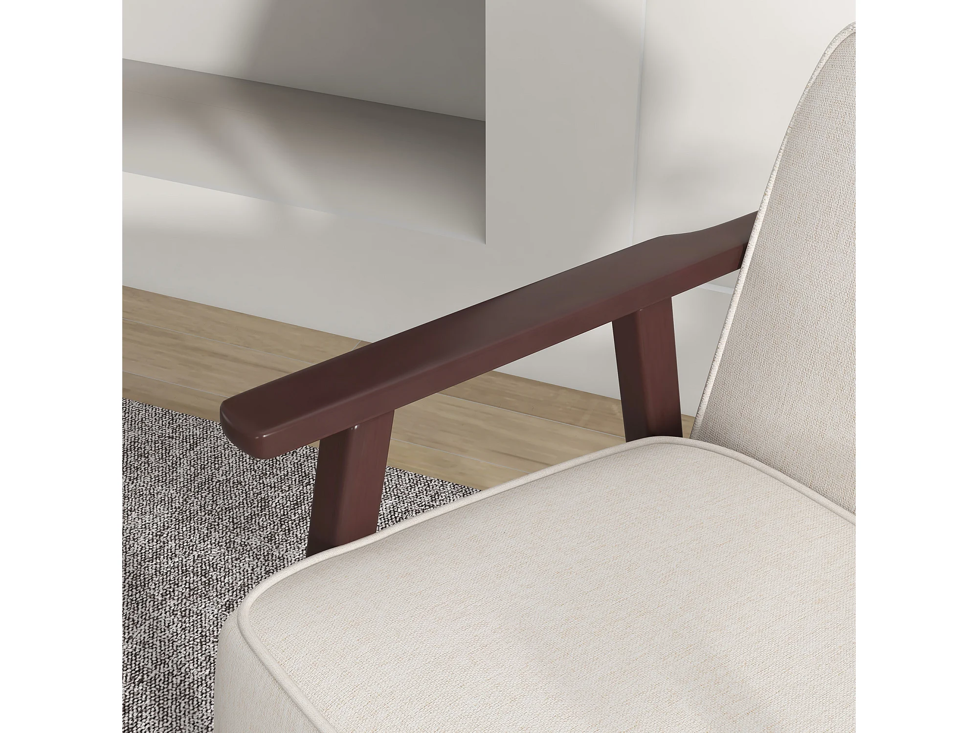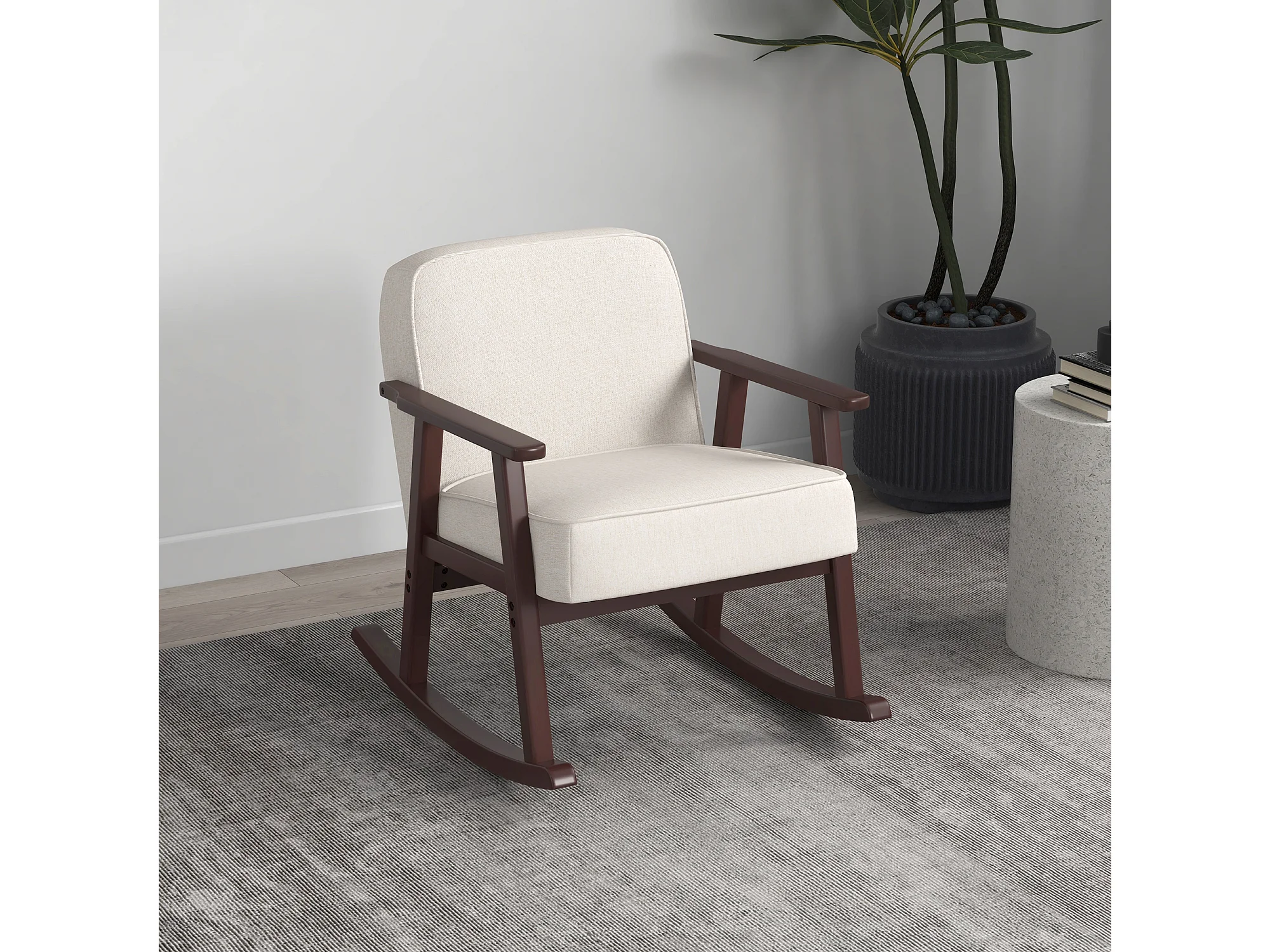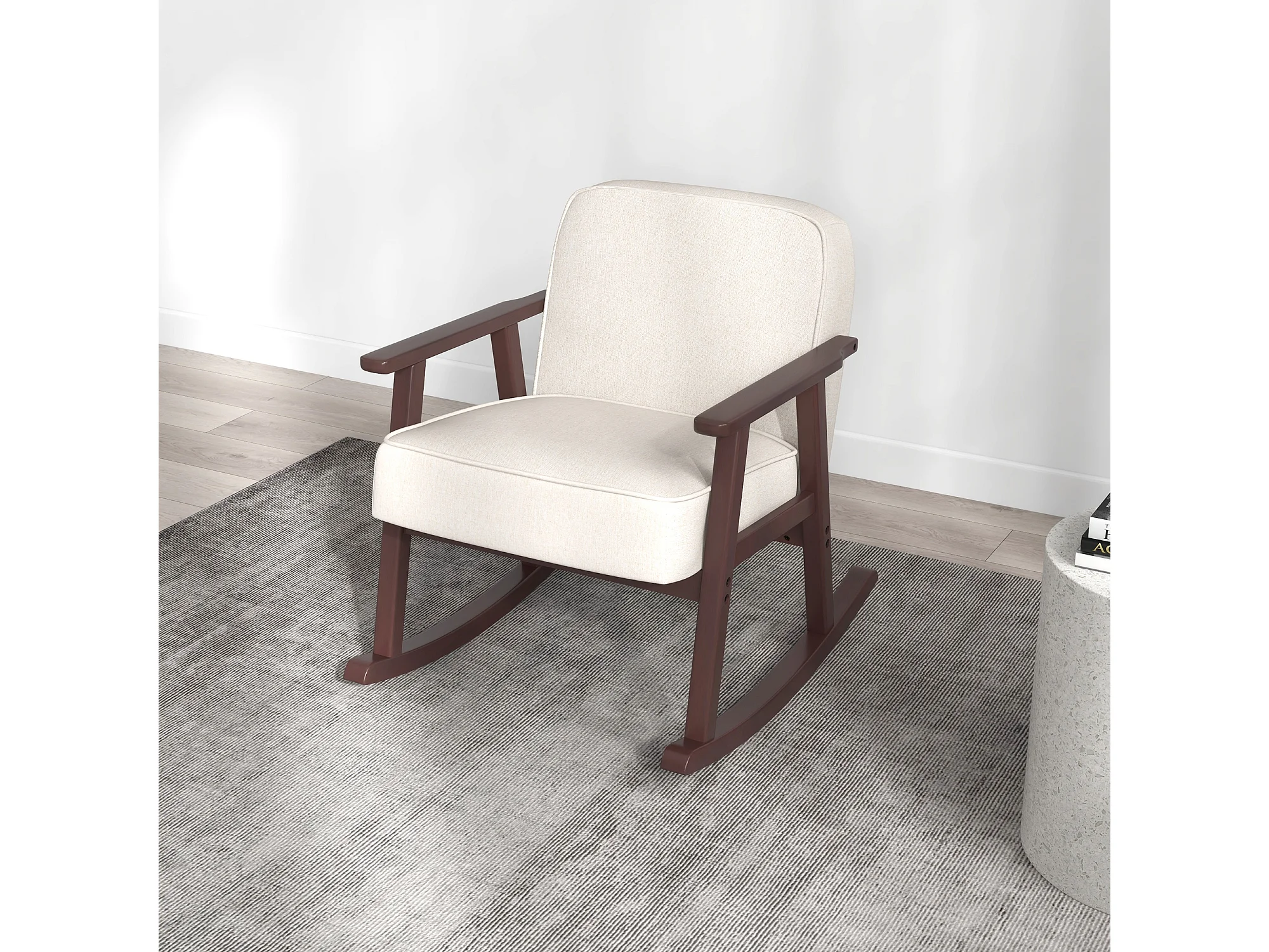 Poltrona scandinava a dondolo in legno e tessuto con braccioli, beige