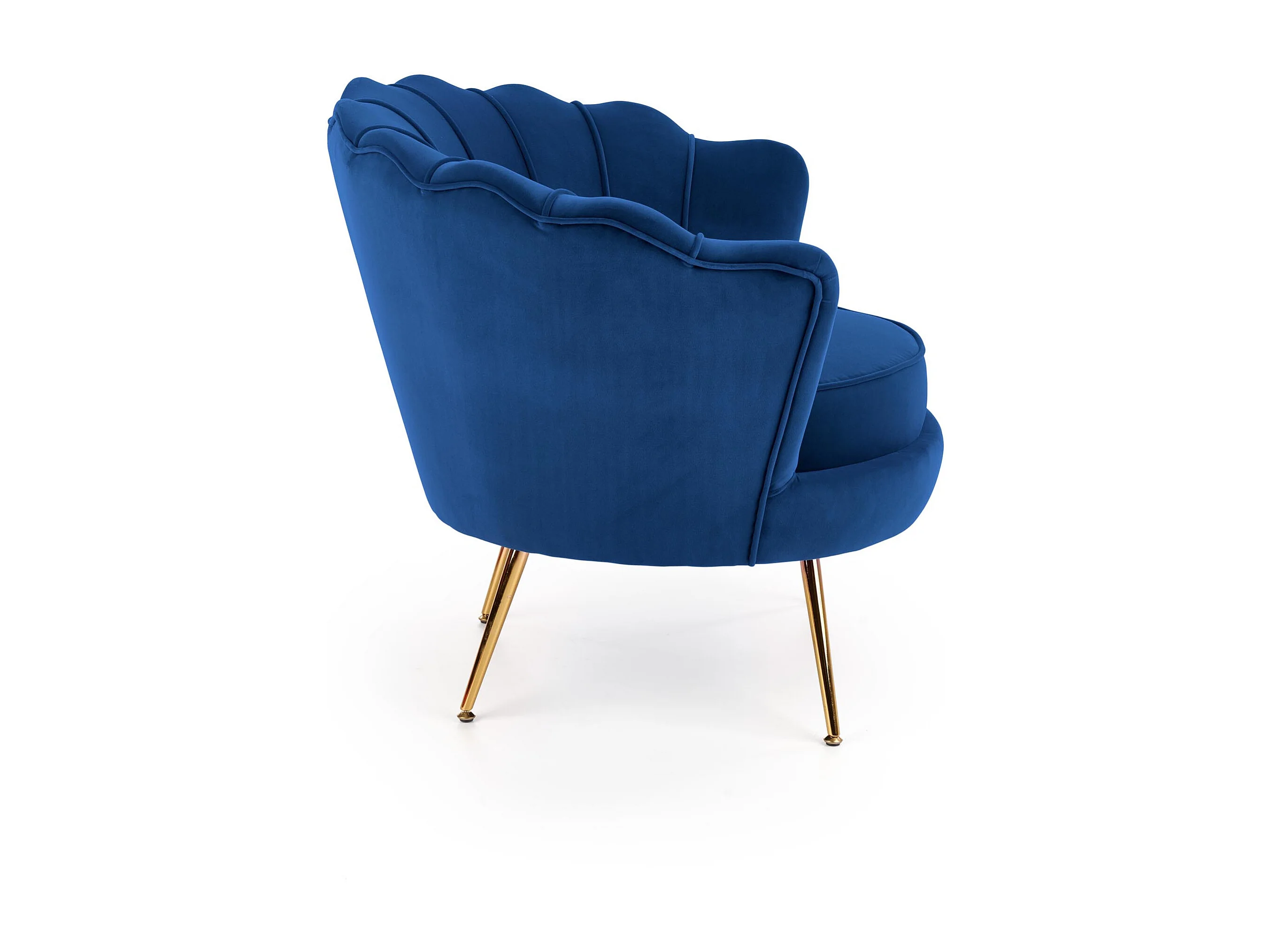 Poltrona a guscio in velluto blu con gambe in metallo dorato CAPRICA