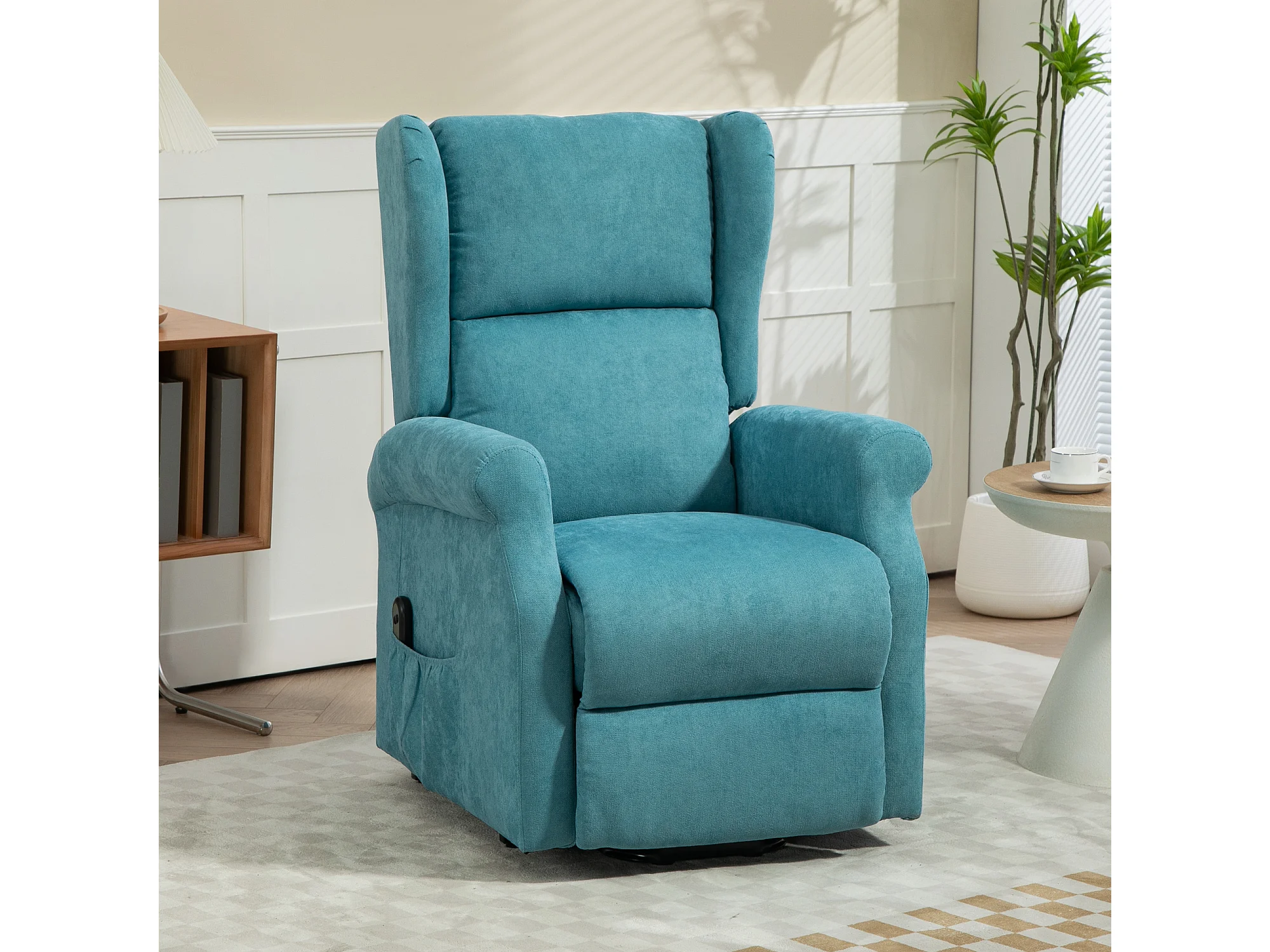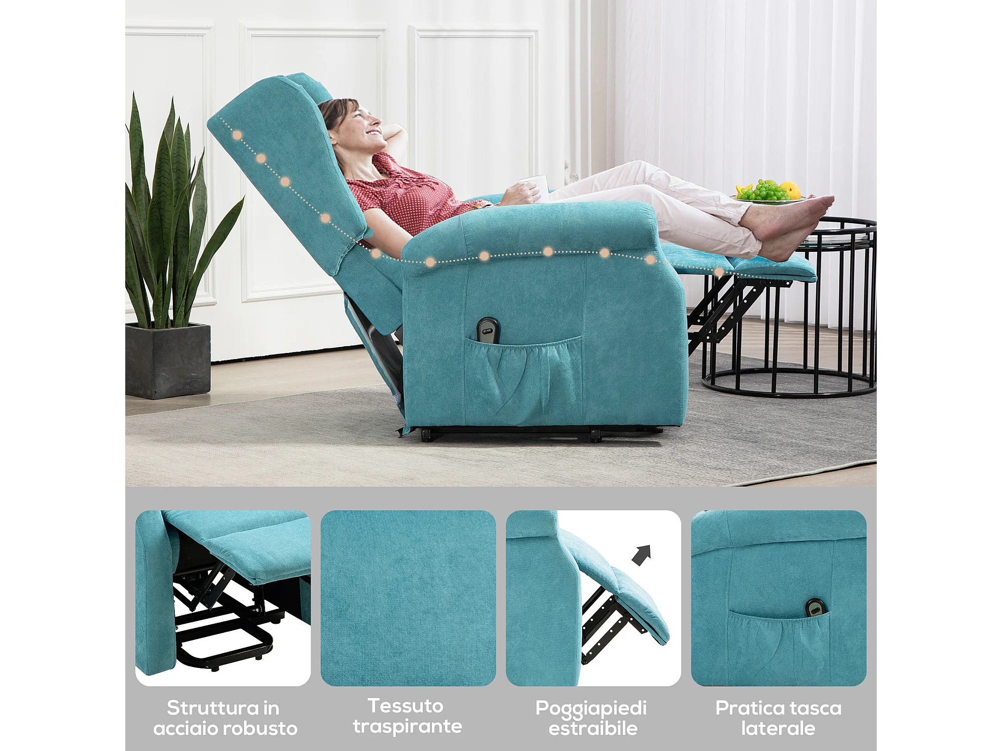 Poltrona alzapersona reclinabile con poggiapiedi e telecomando blu