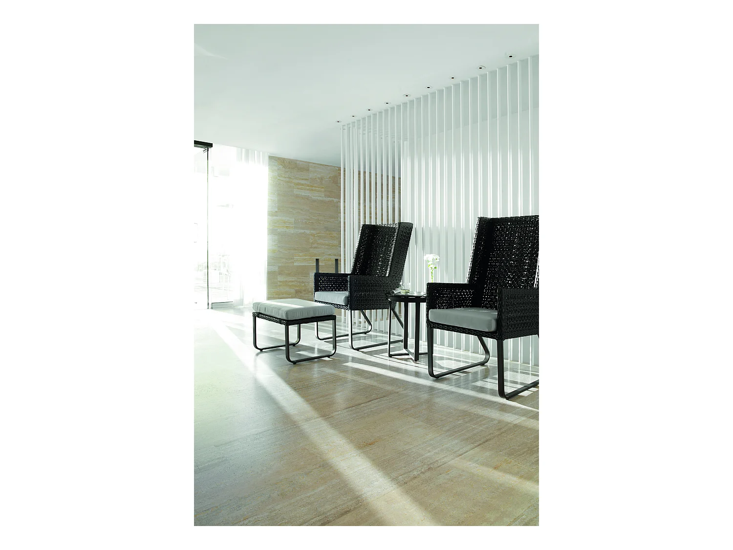 Poltrona in alluminio e fibra sintetica marrone chiaro con cuscini marrone chiaro