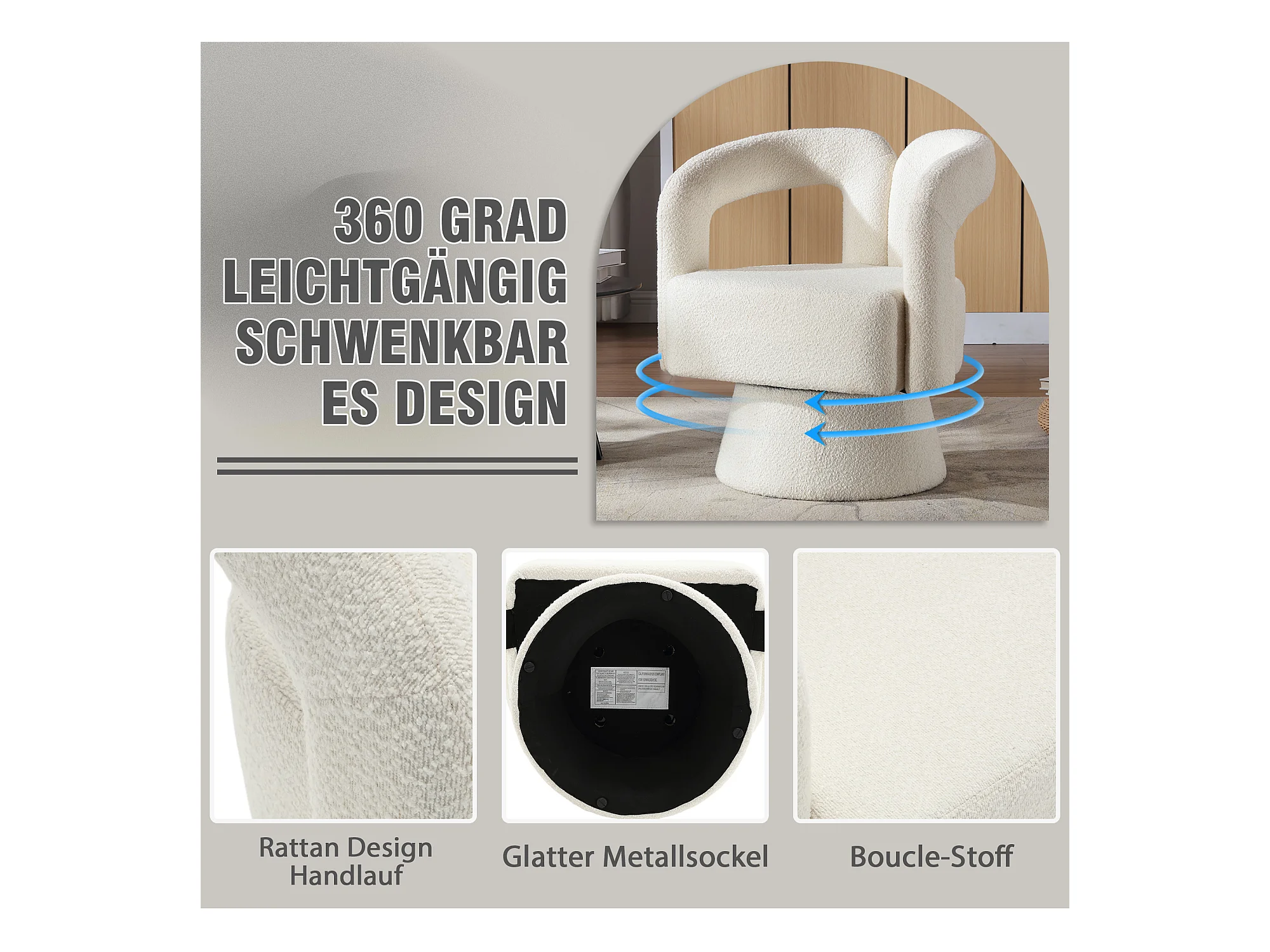Poltrona girevole a 360°, imbottita, in morbido tessuto bouclé, beige, per soggiorno, camera da letto, ufficio, sala d'attesa (67x55x74 cm)