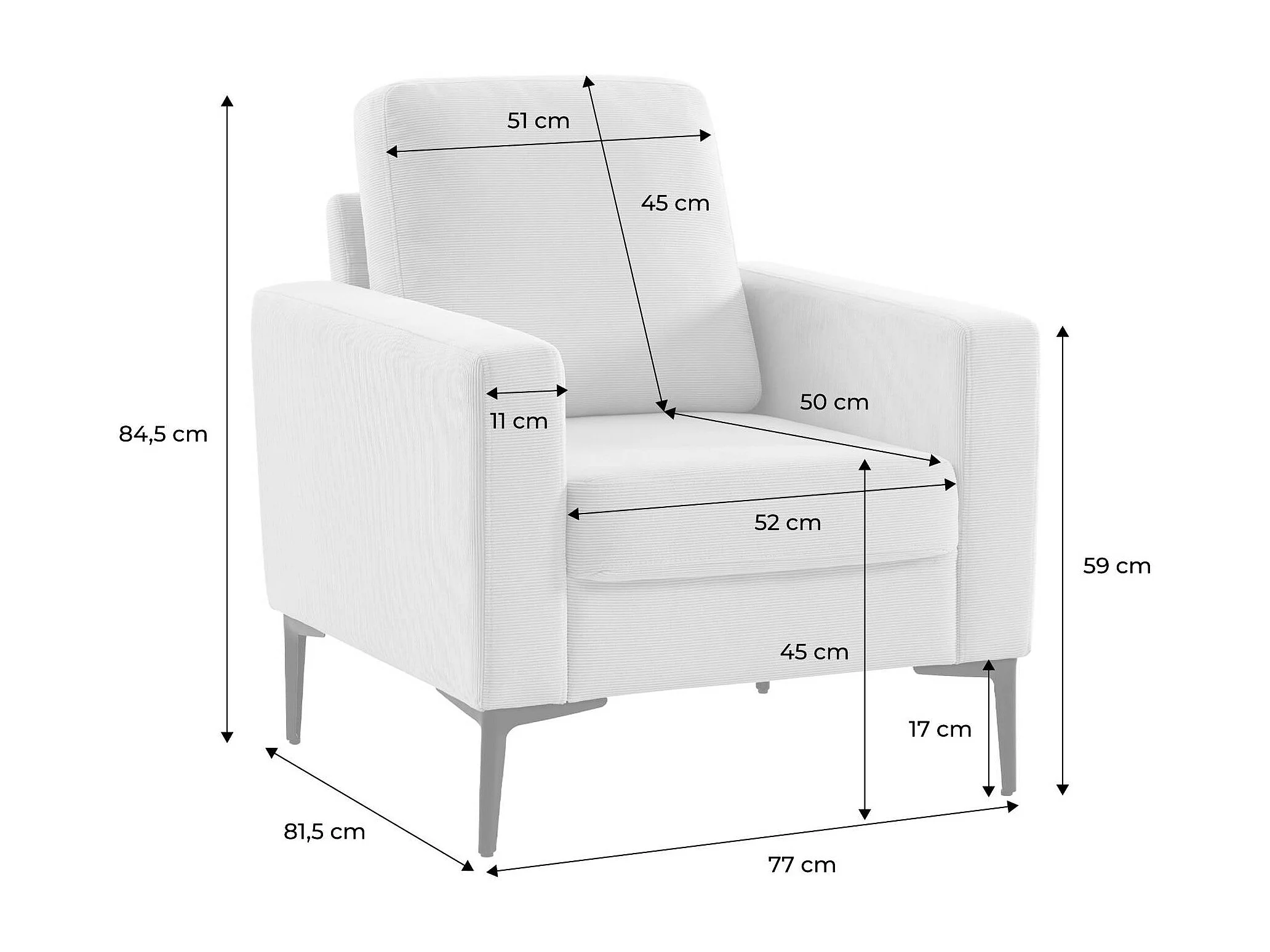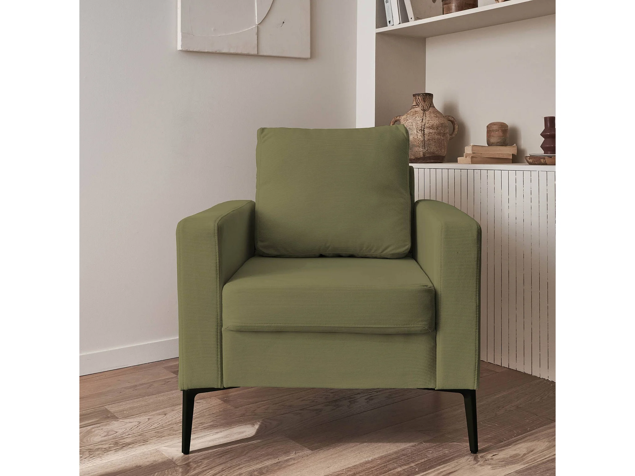 Poltrona in velluto a coste, gambe in metallo, kaki