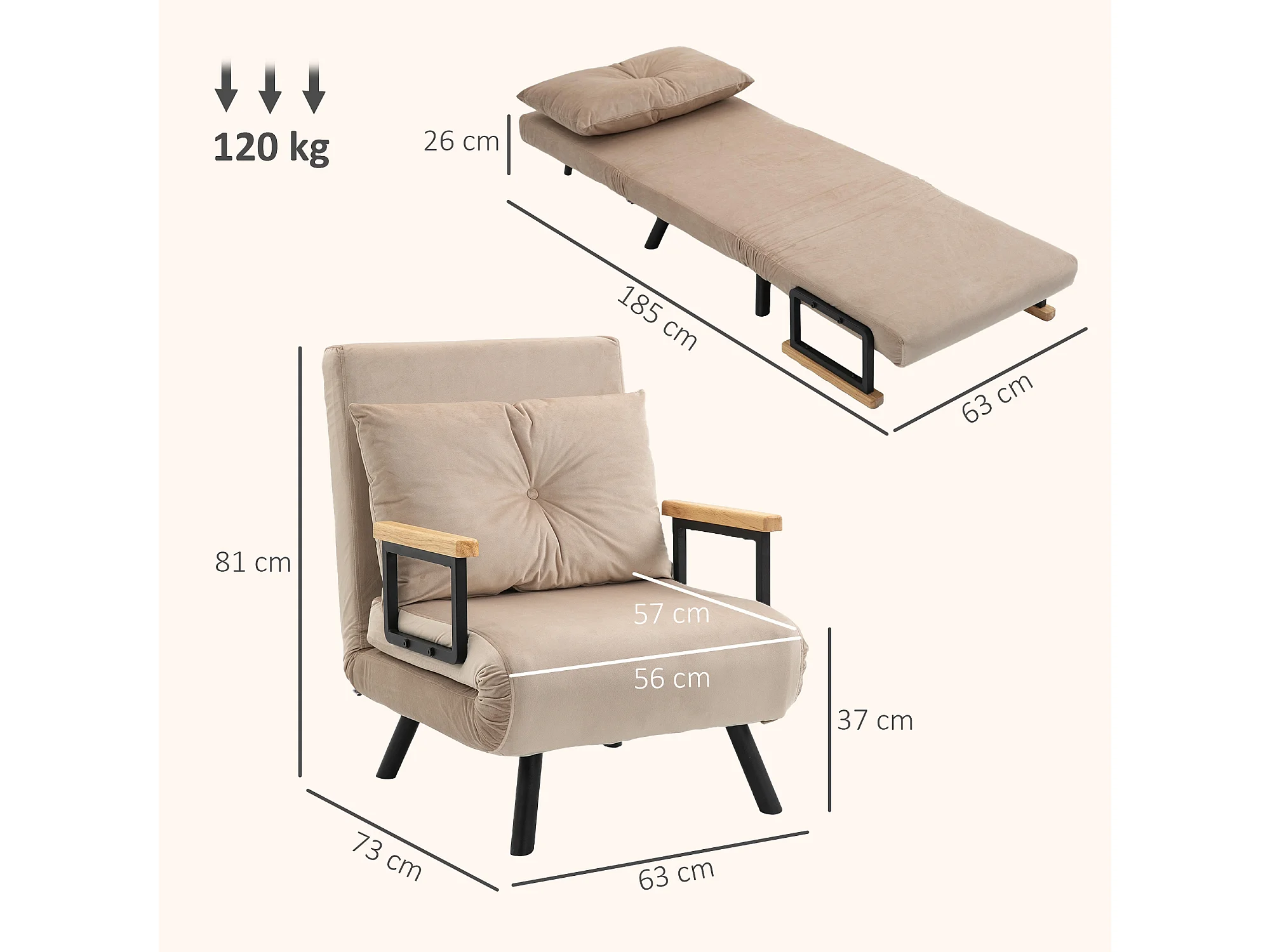 Poltrona letto 3 in 1 con schienale reclinabile e cuscino beige
