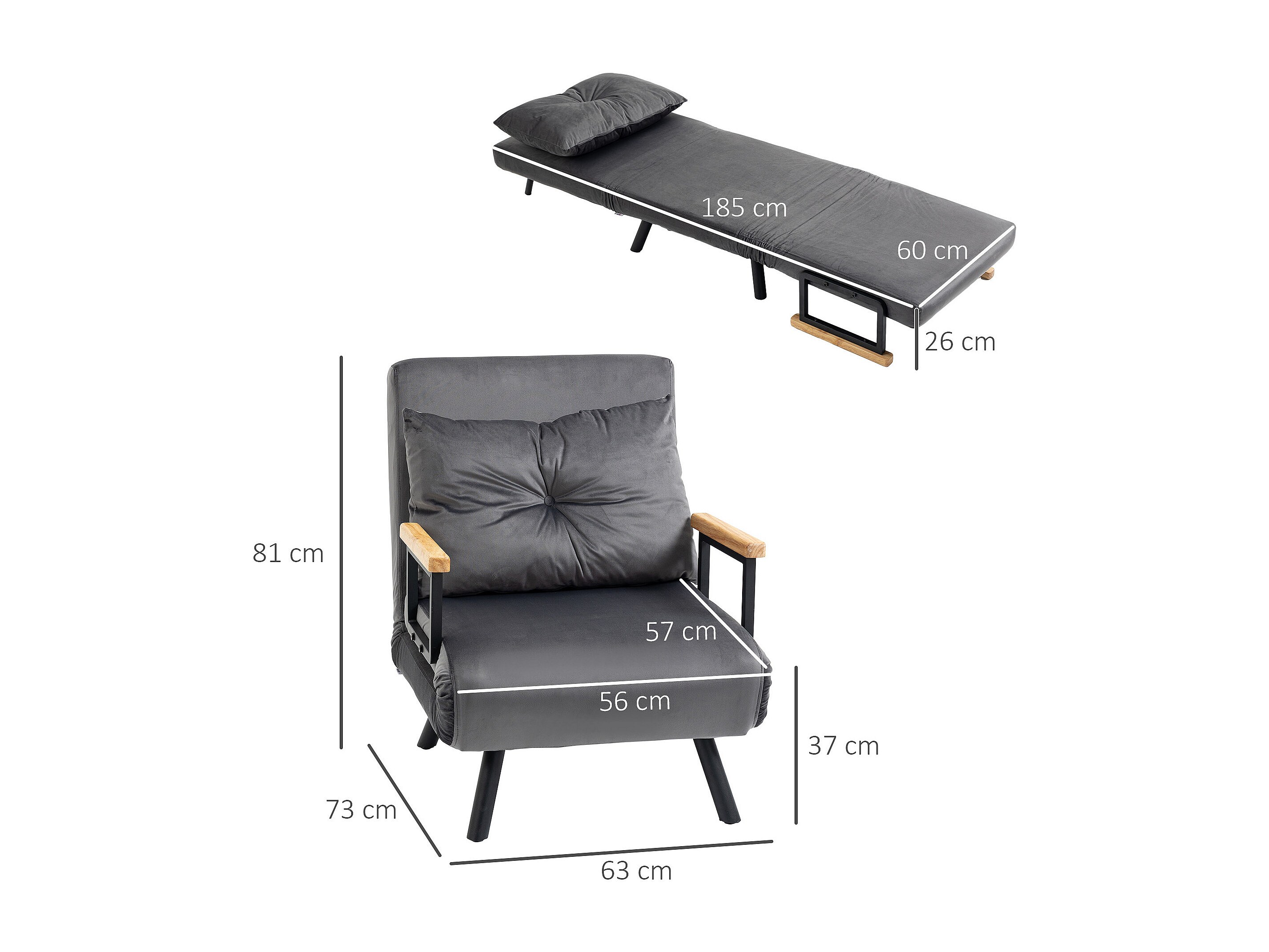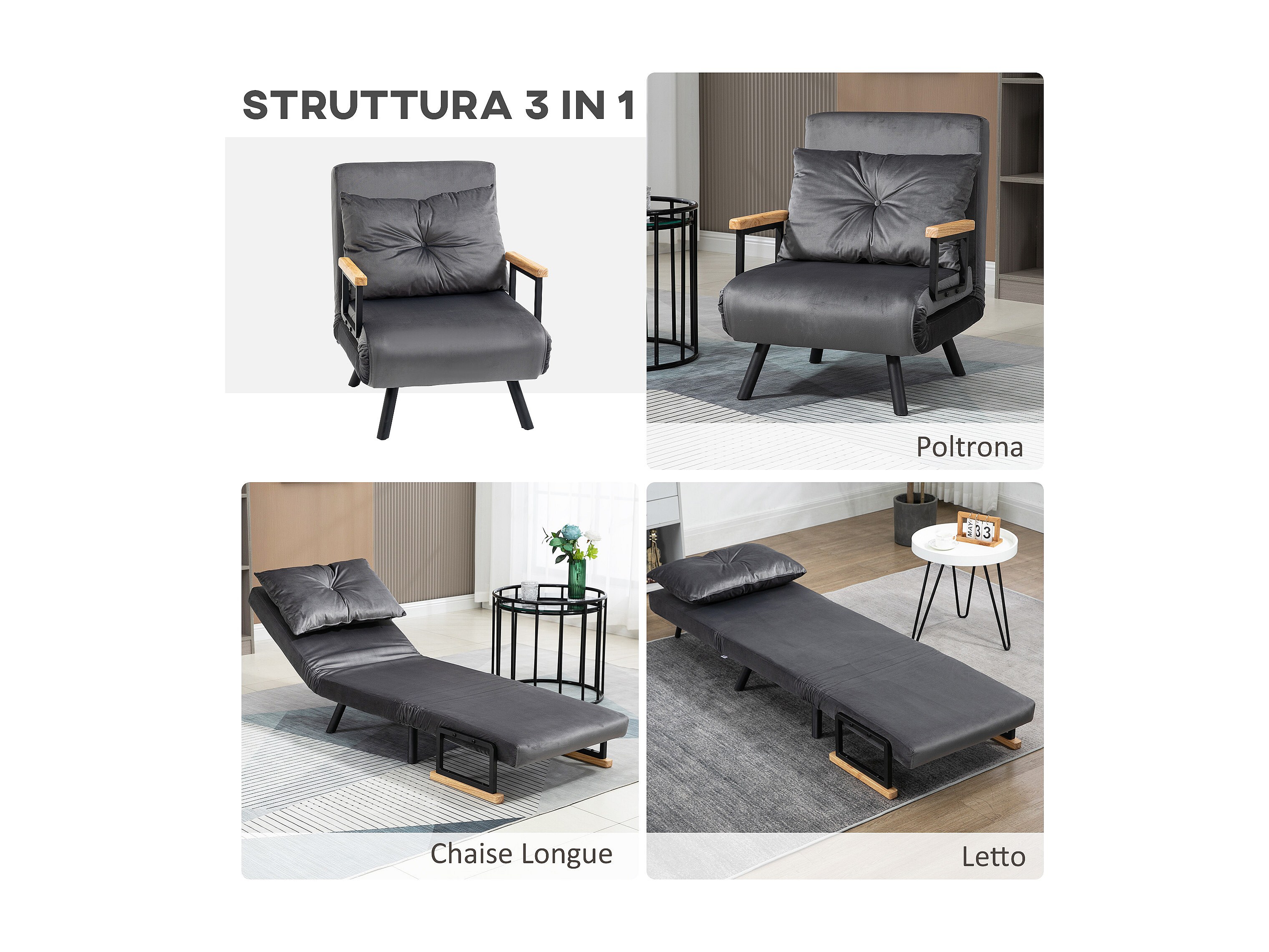 Poltrona letto singolo 3 in 1 con schienale reclinabile grigio scuro