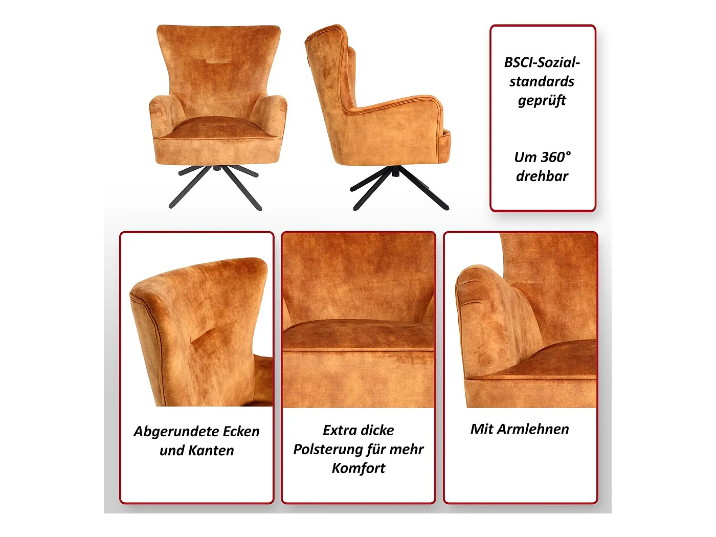 Poltrona lounge Vintage relax elegante girevole MCW-L63 velluto ~ arancione