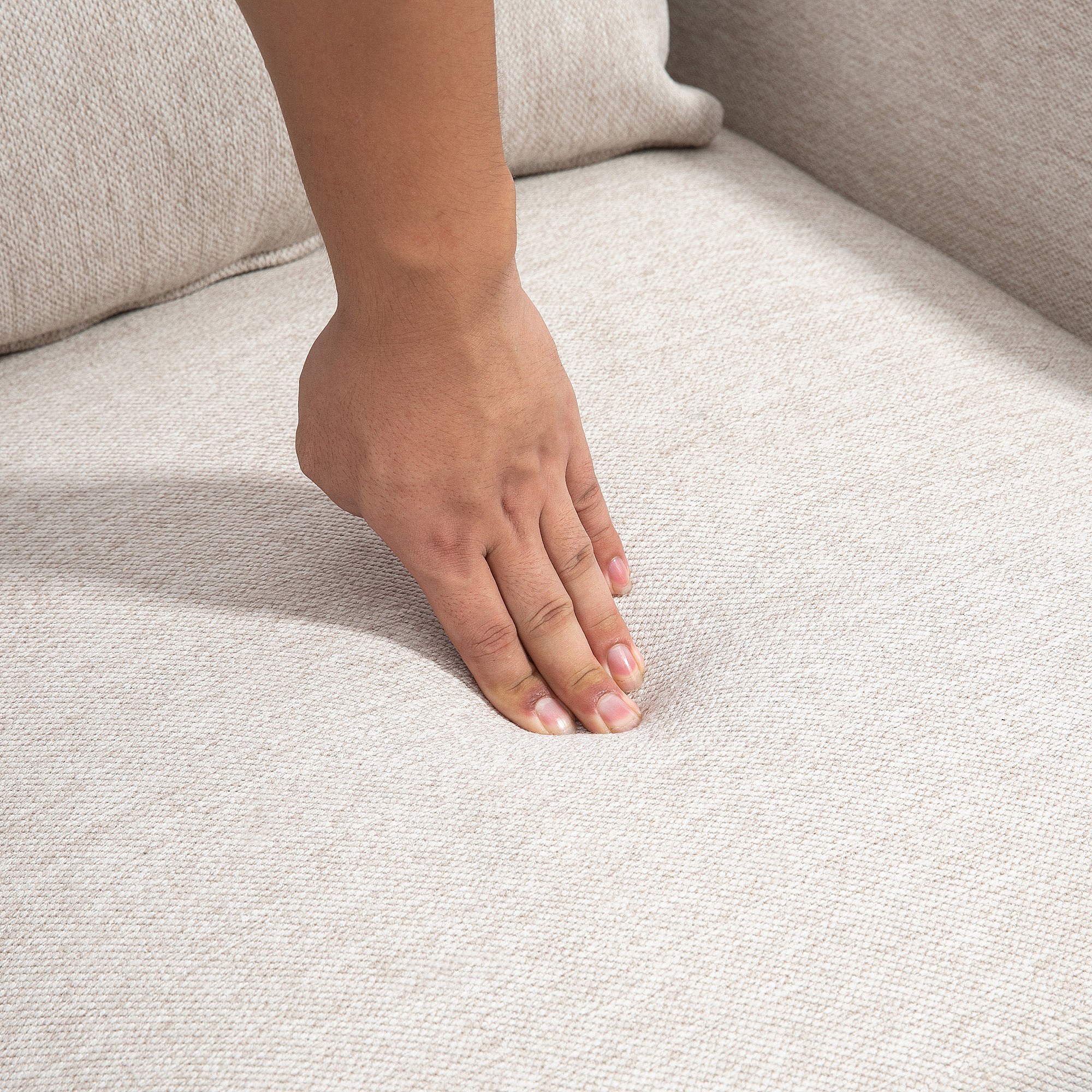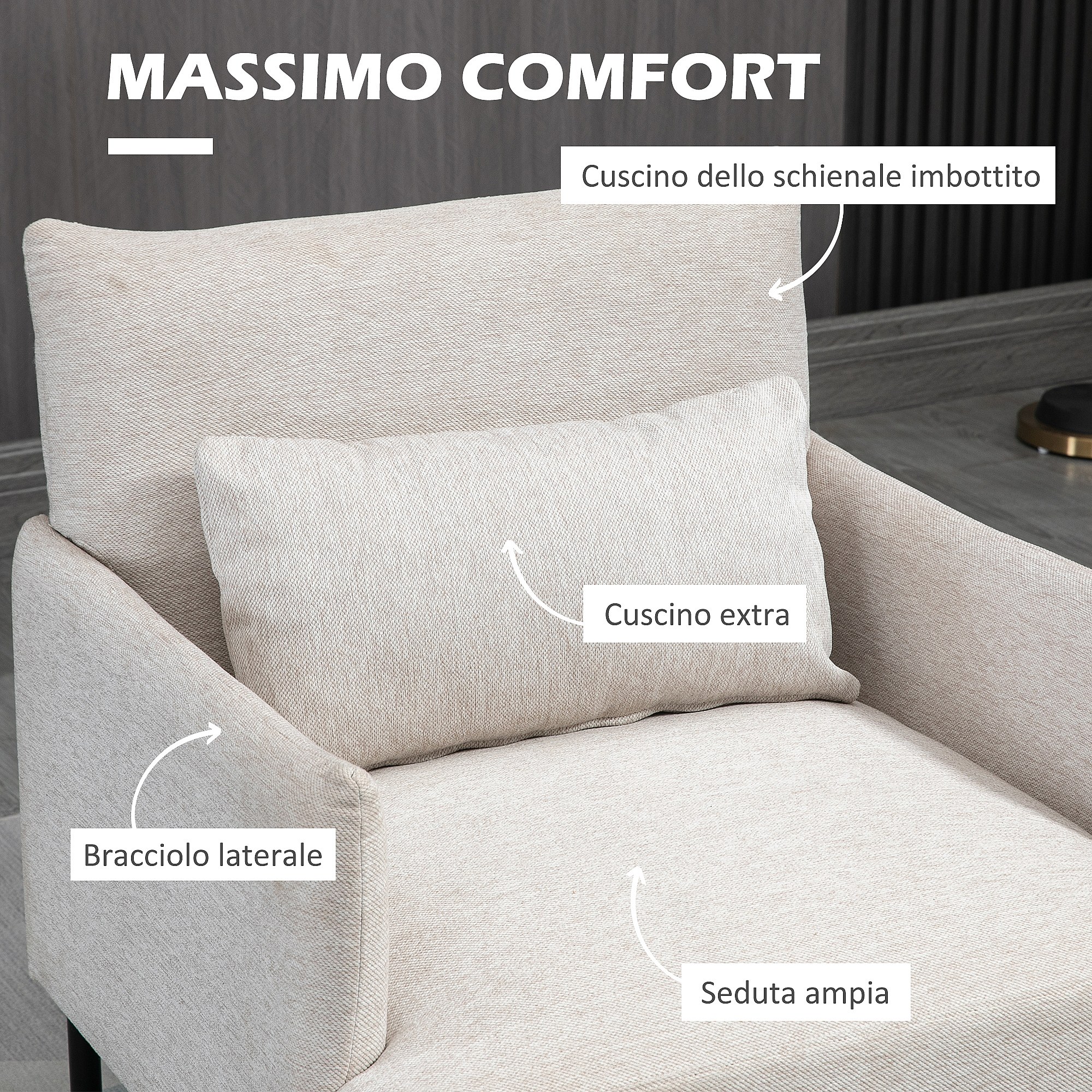 Poltrona moderna d'arredo con schienale imbottito e cuscino crema