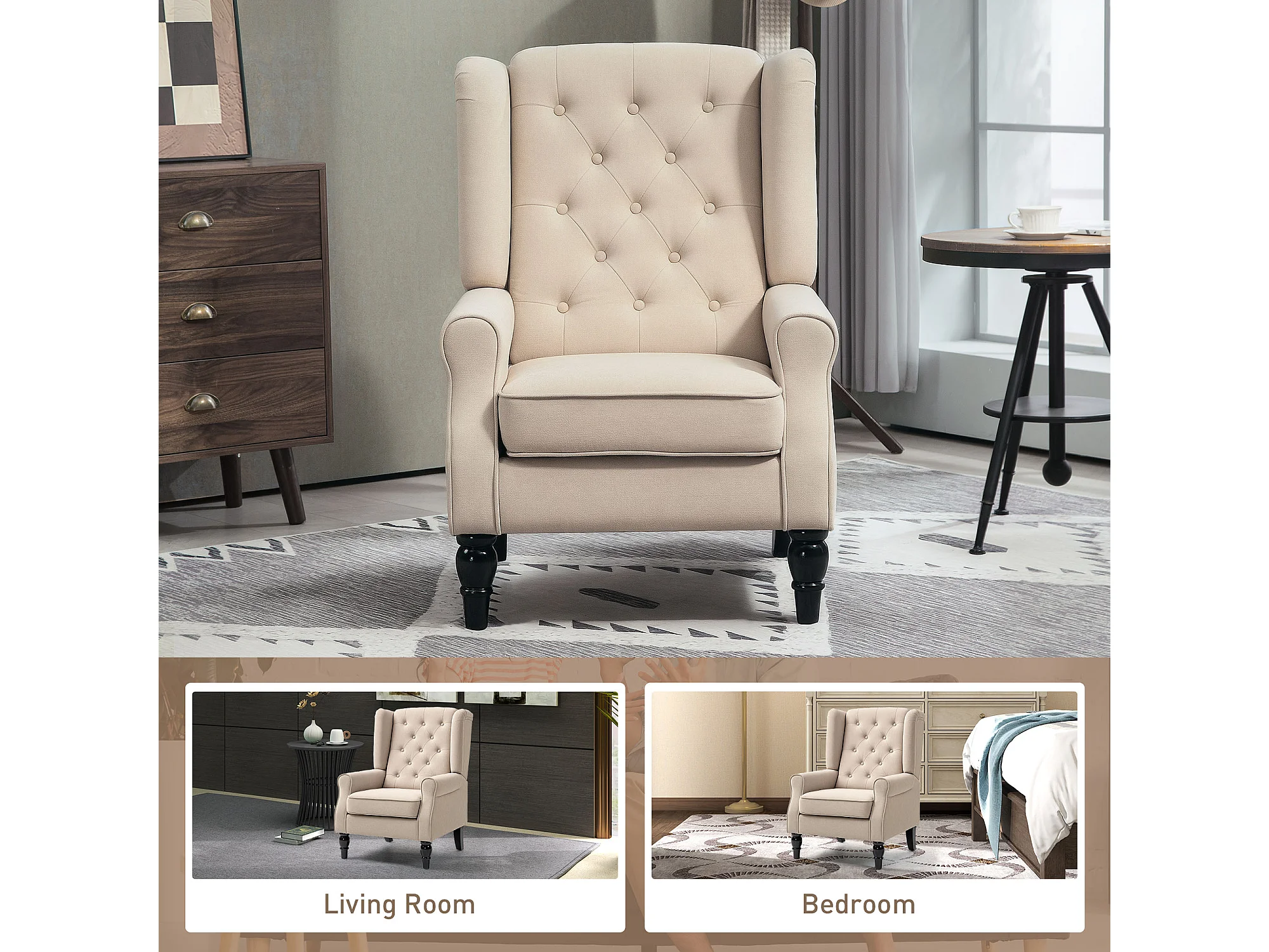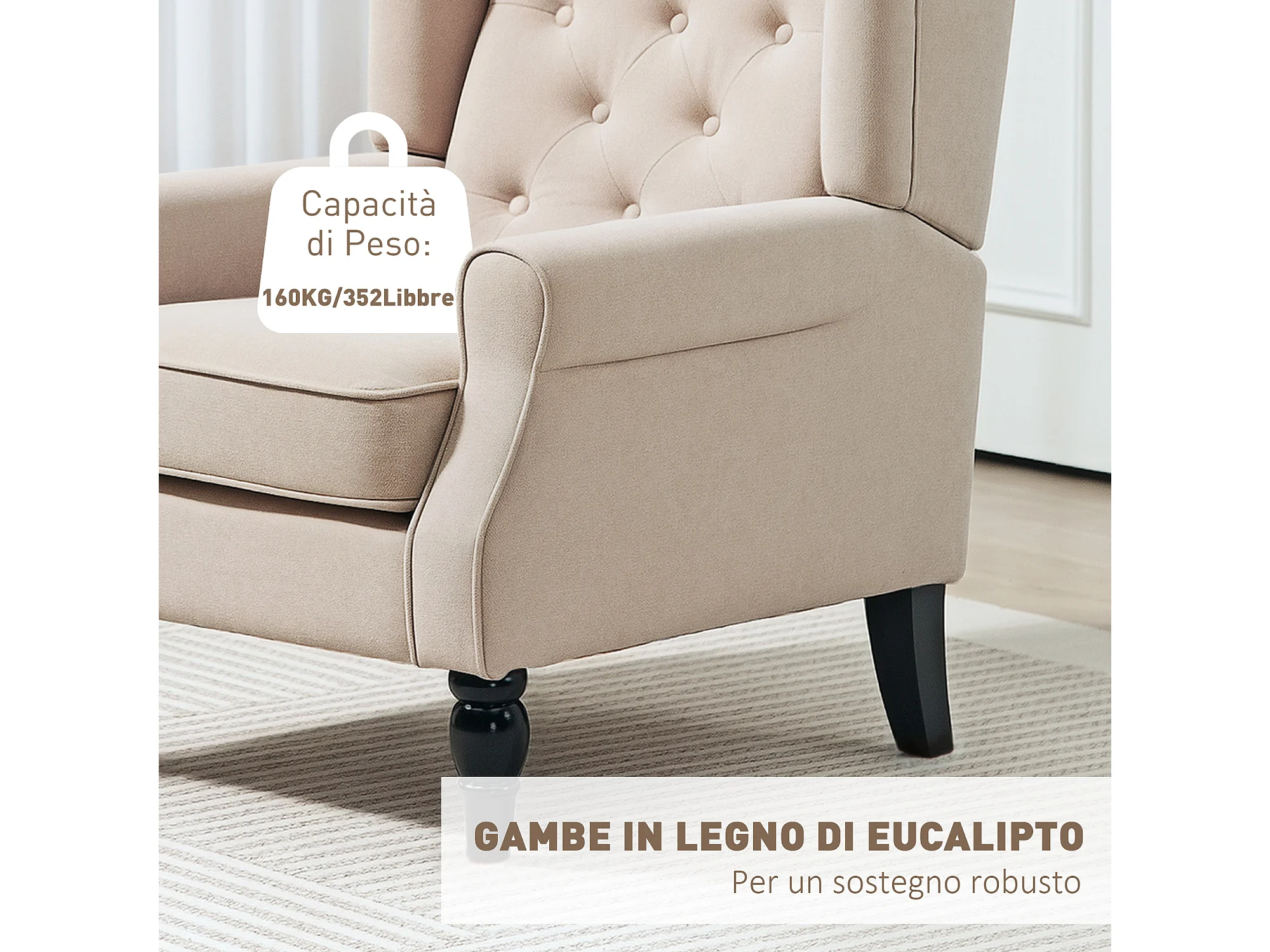 Poltrona per salotto e camera in stile francese con cuscini beige
