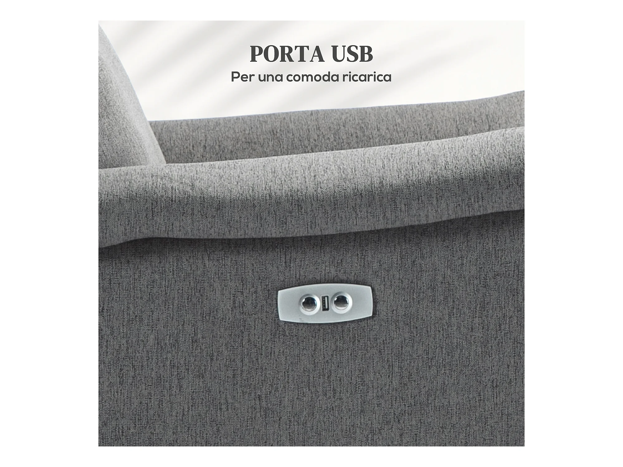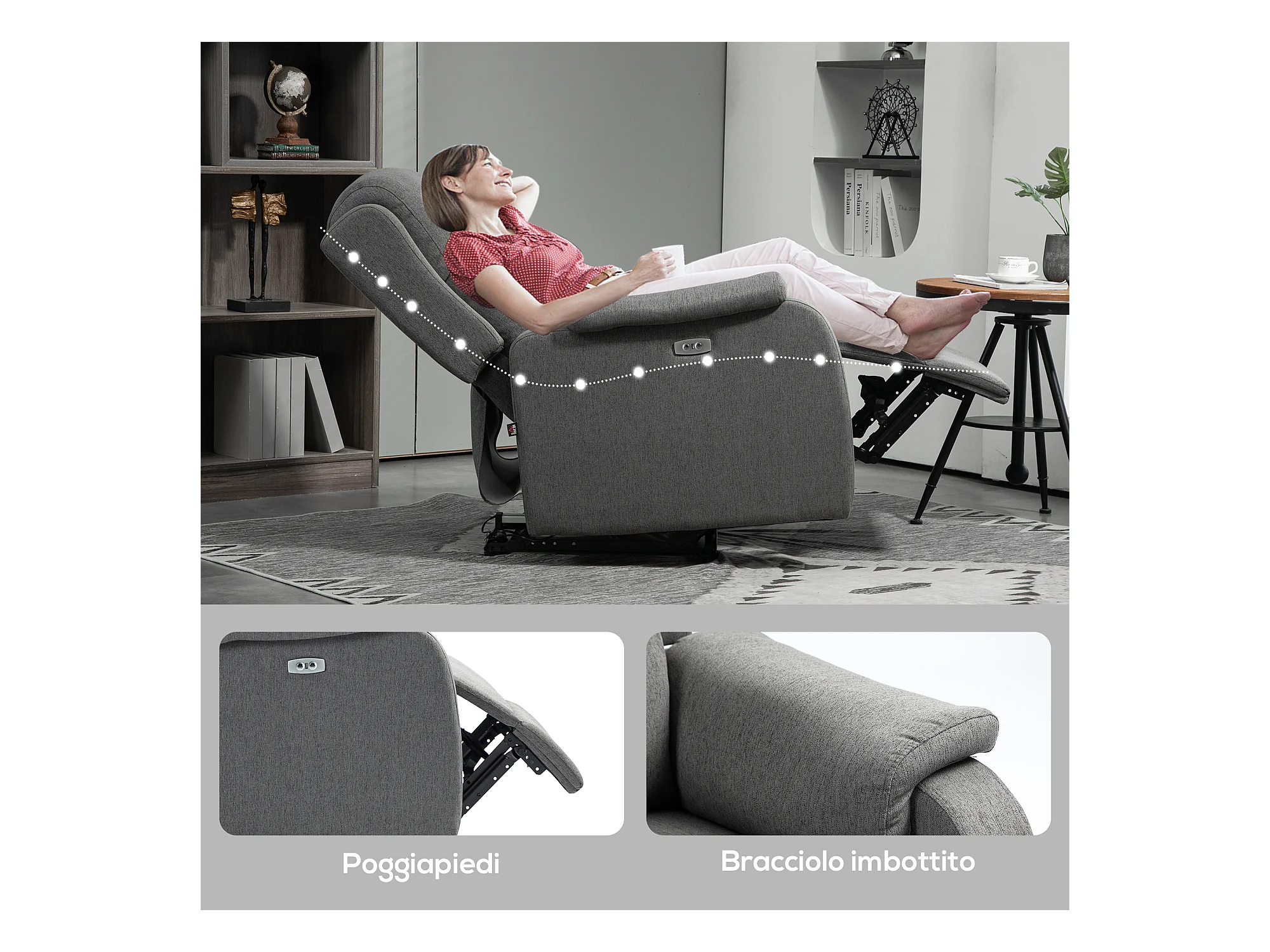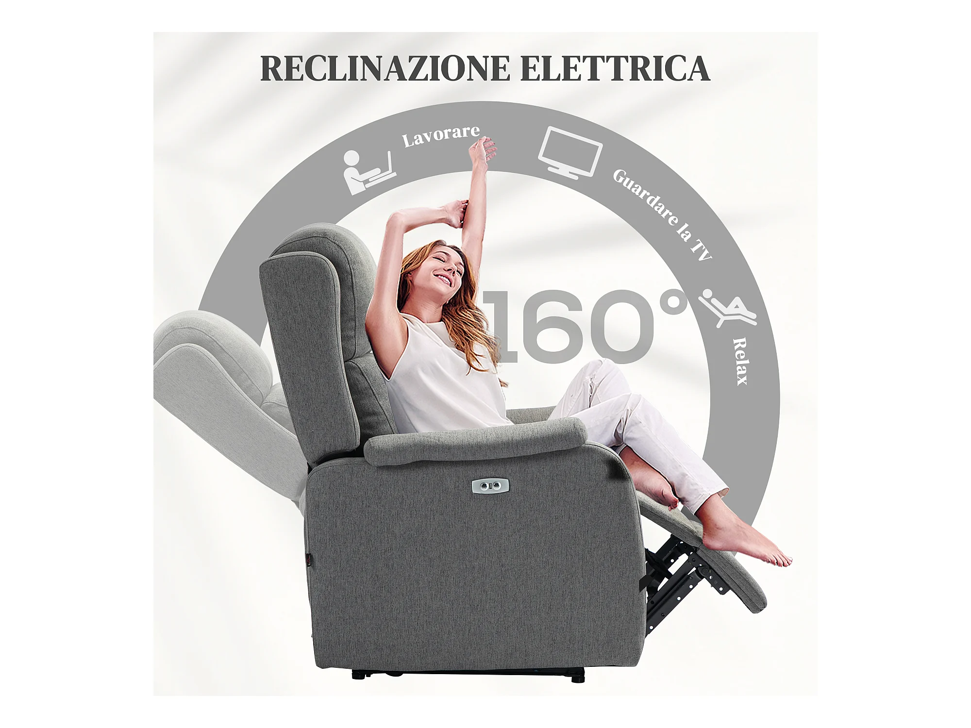 Fauteuil TV électrique gris avec releveur, inclinabile 150°, tessuto lino, 150 kg
