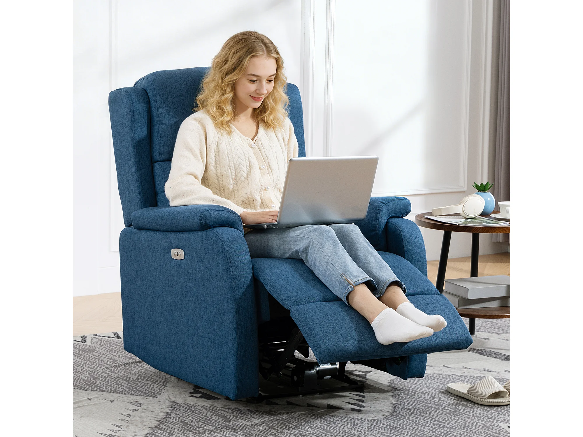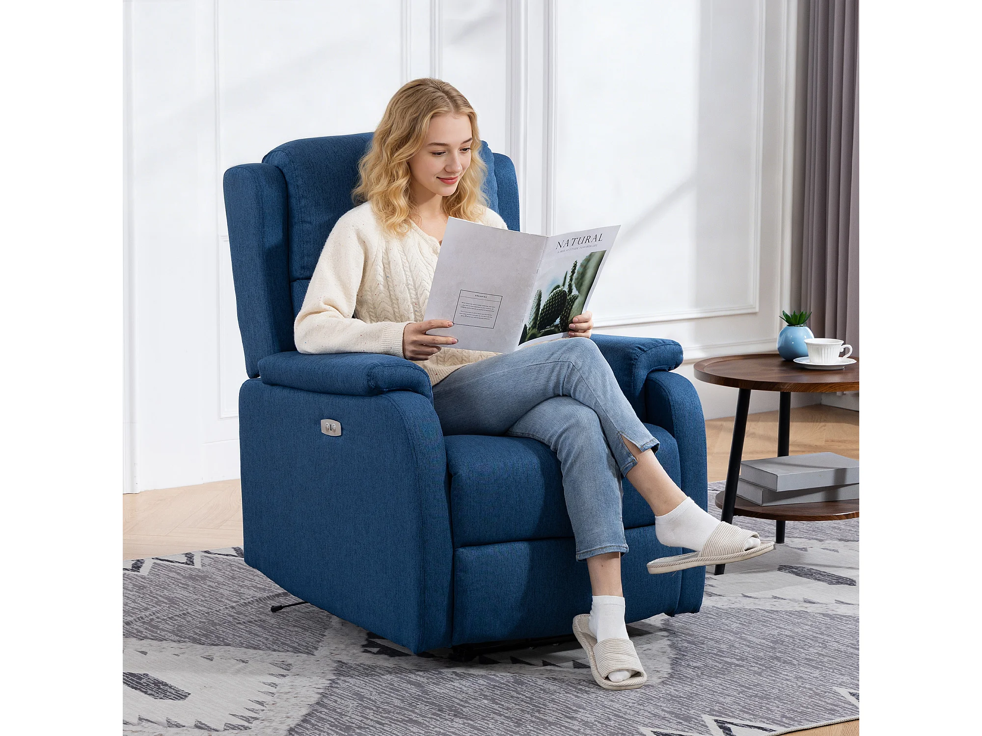Poltrona reclinabile elettrica con poggiapiedi tessuto blu