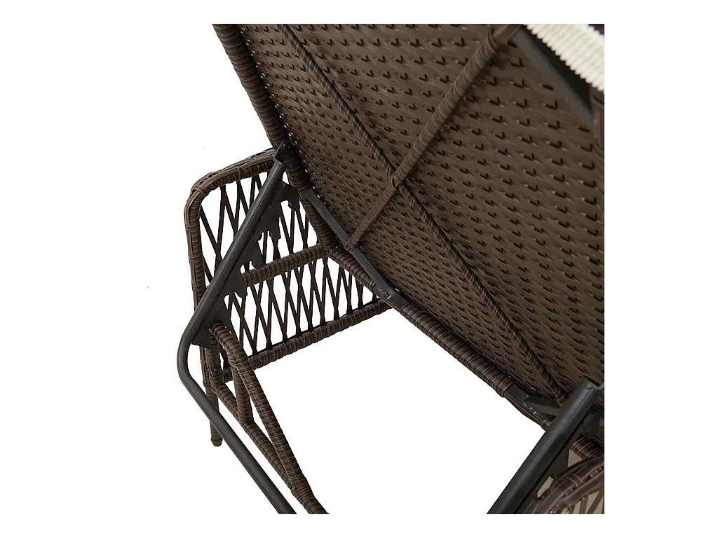 lettini prendisole con cuscini e tavolo marrone in polyrattan.