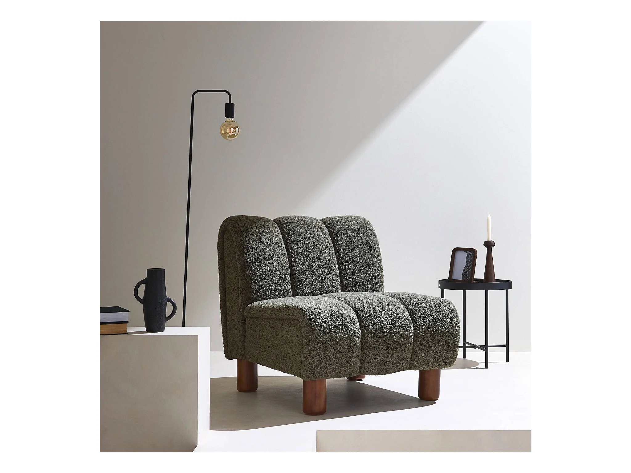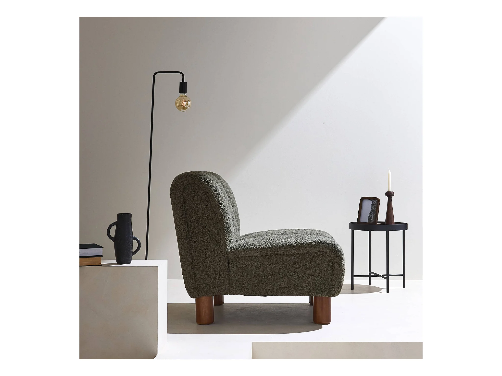 Poltrona relax con gambe rotonde in legno e tessuto bouclé, kaki