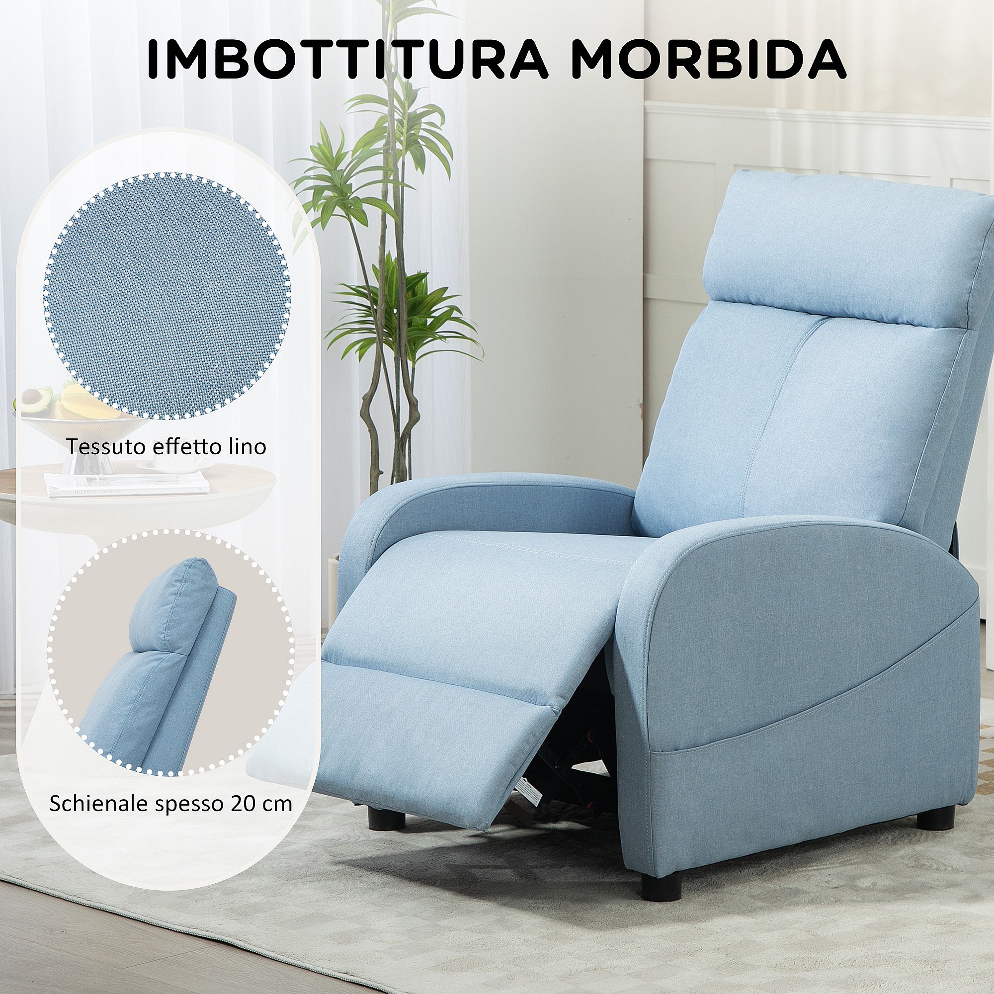 Poltrona relax reclinabile con poggiapiedi in tessuto azzurro