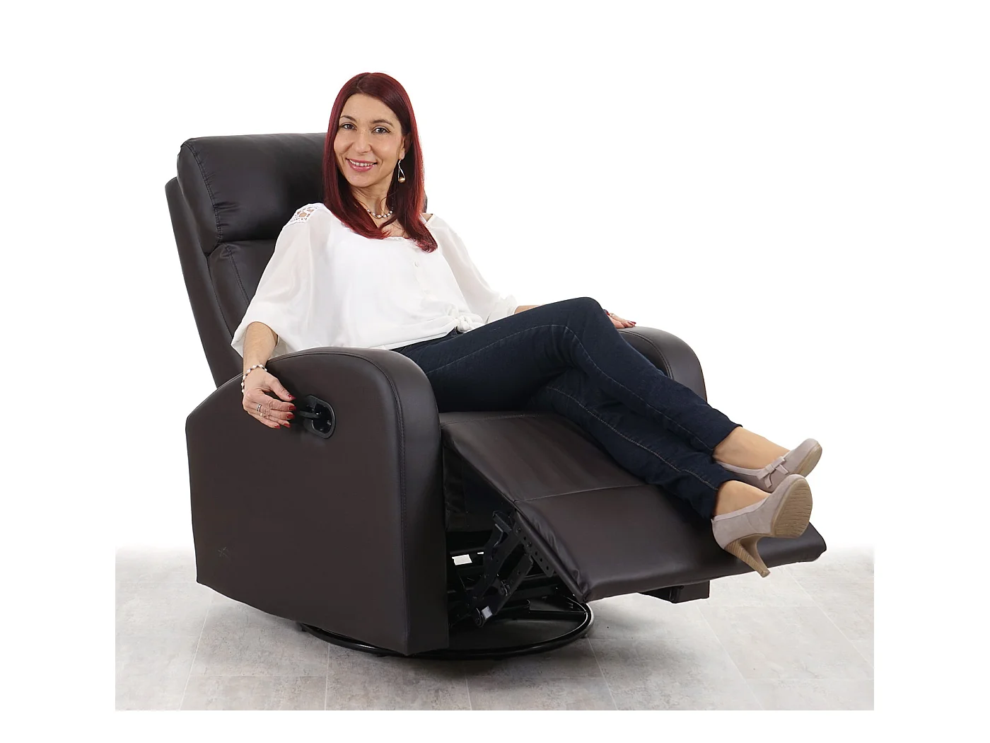 Poltrona relax reclinabile girevole MCW-C46 con poggiapiedi ecopelle marrone