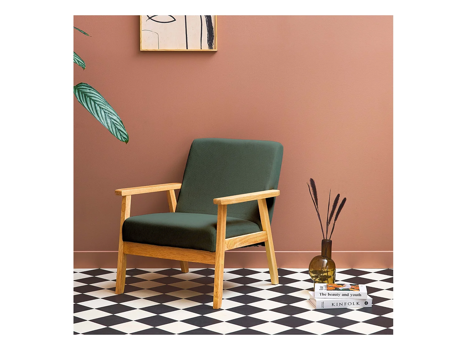 Poltrona scandinava in legno di hevea tinto noce e tessuto in velluto,