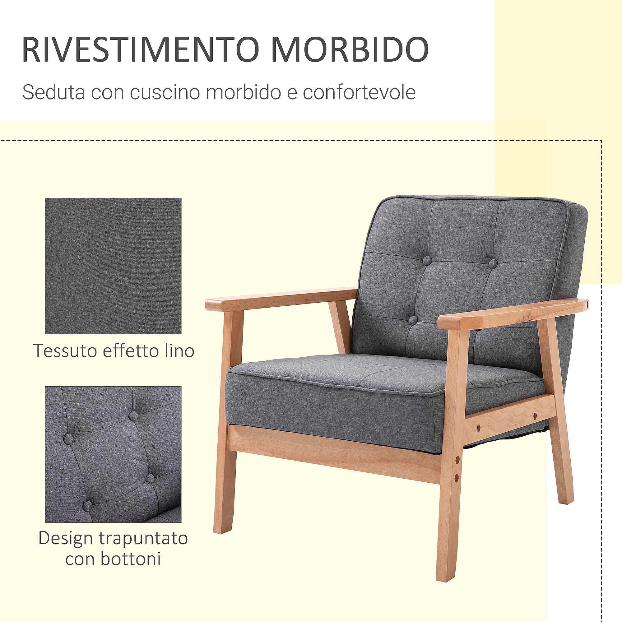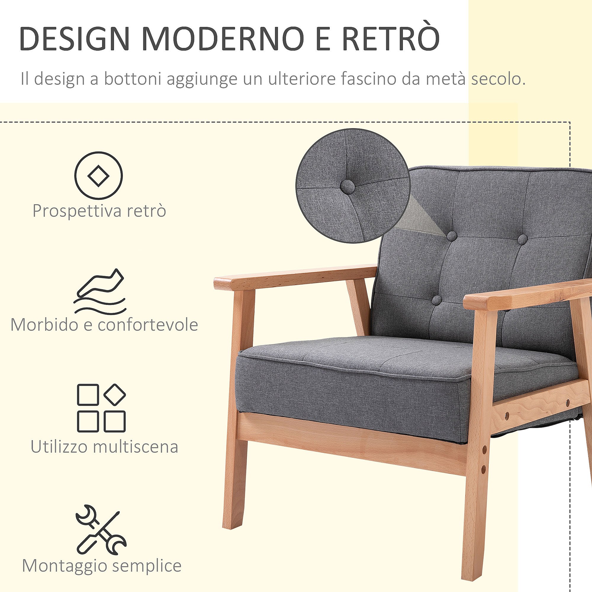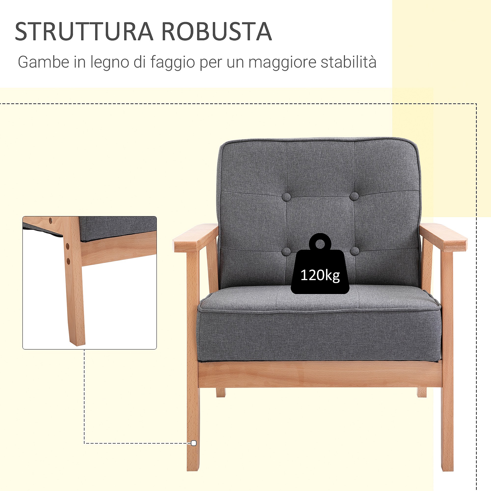Poltrona stile nordico imbottita con braccioli legno e tessuto grigio