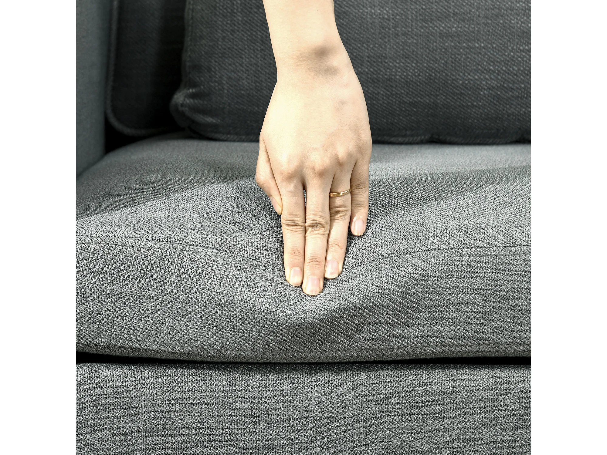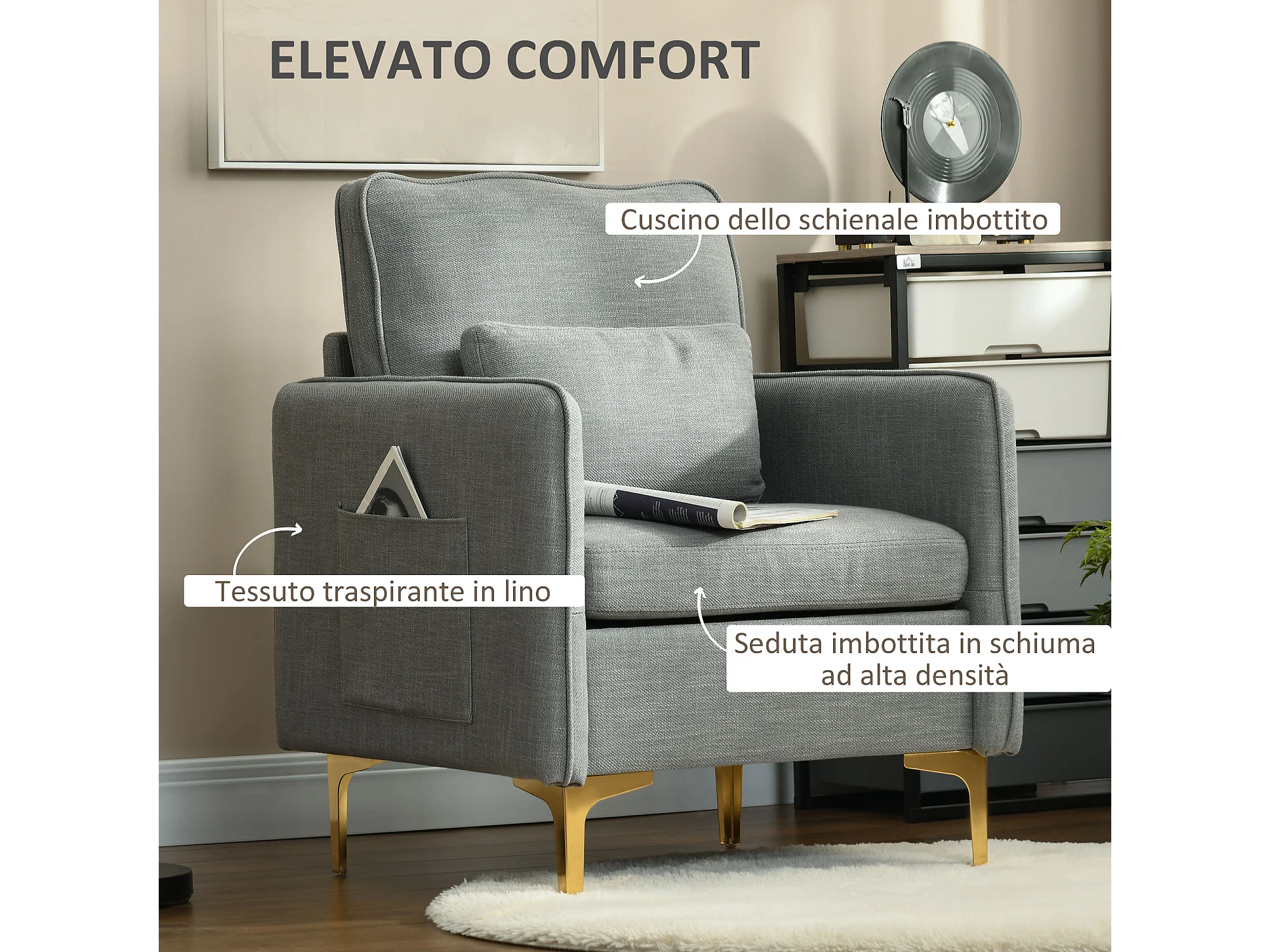 Poltroncina design con tessuto effetto lino e tasche laterali grigio