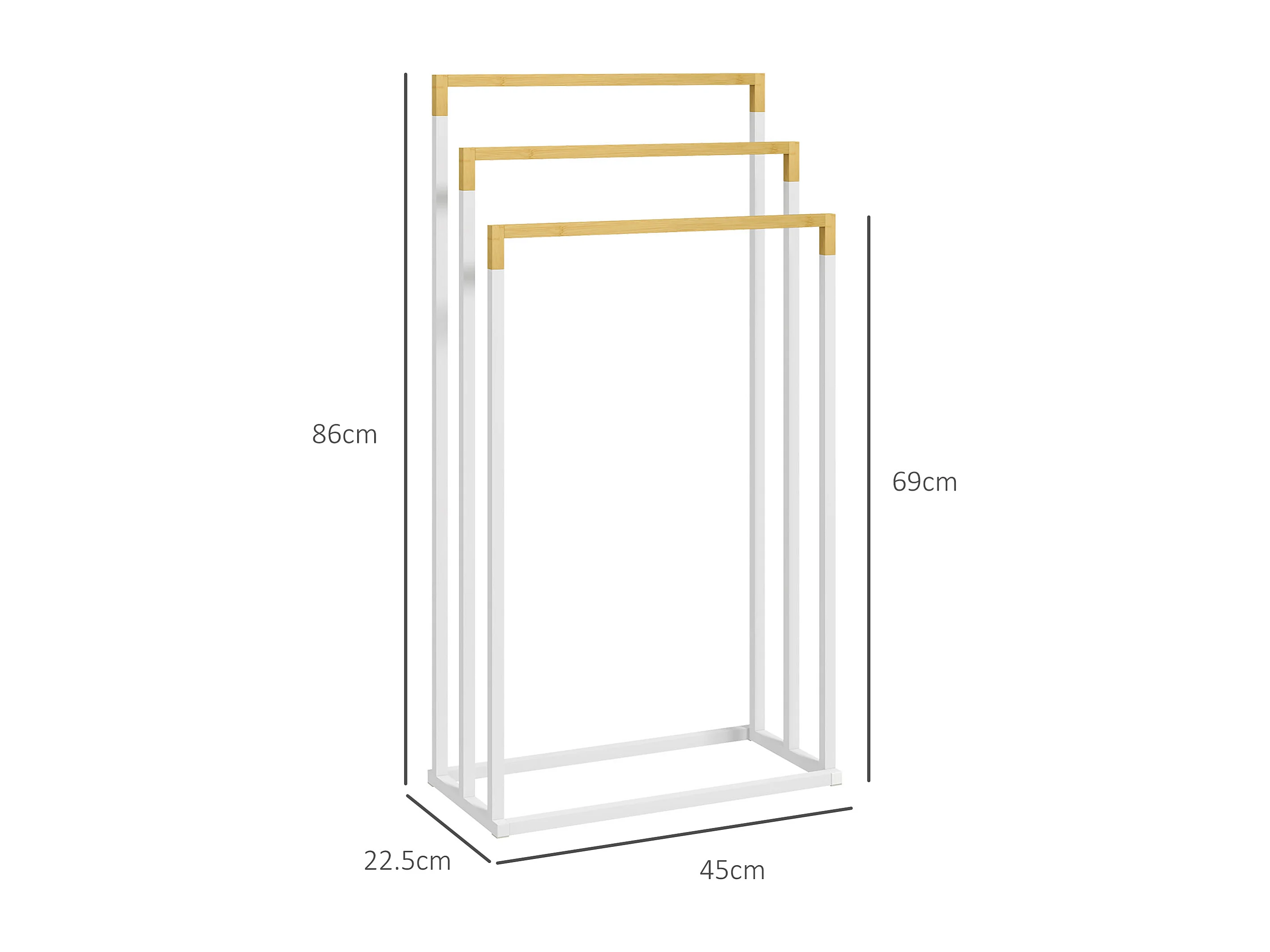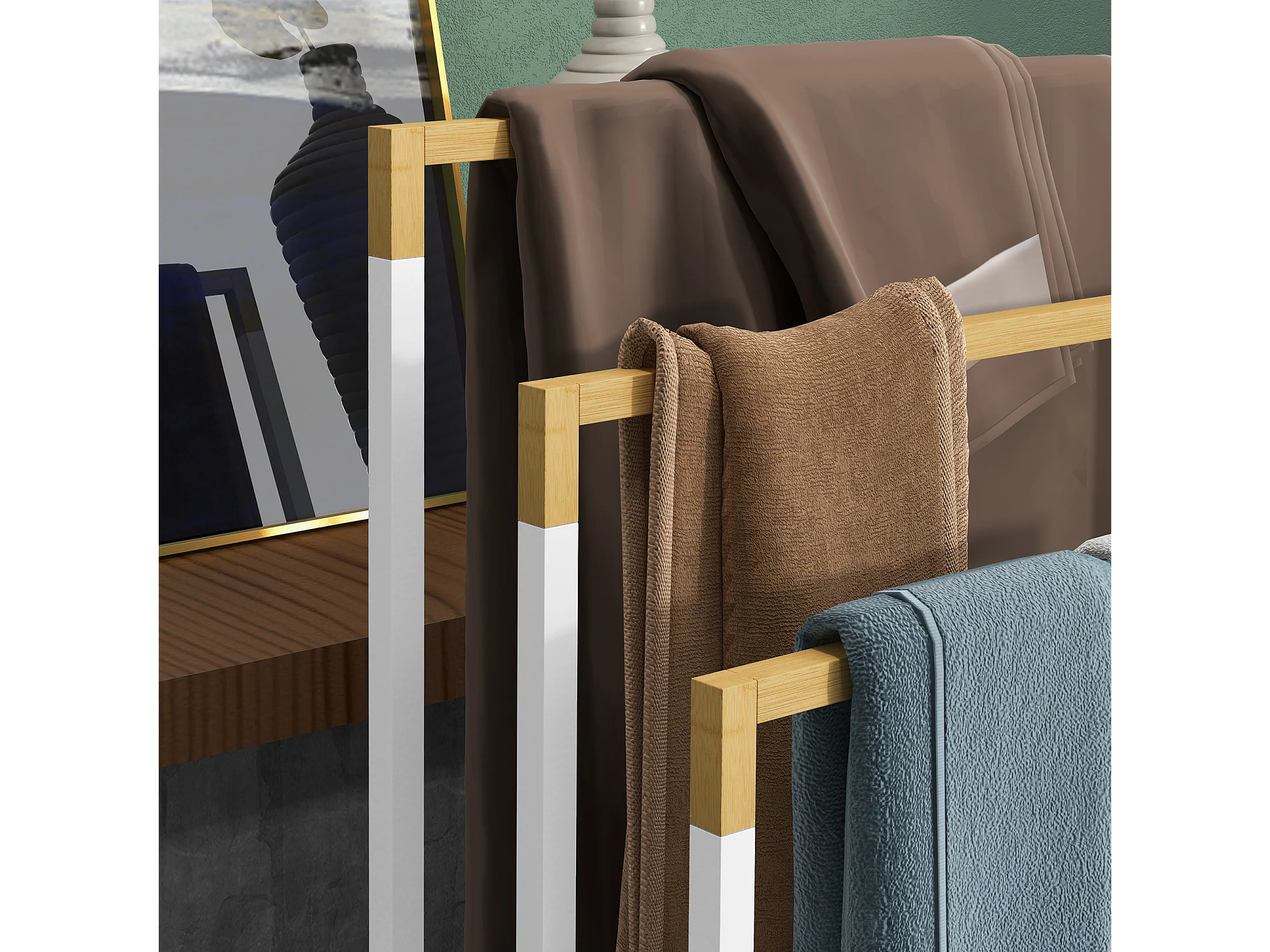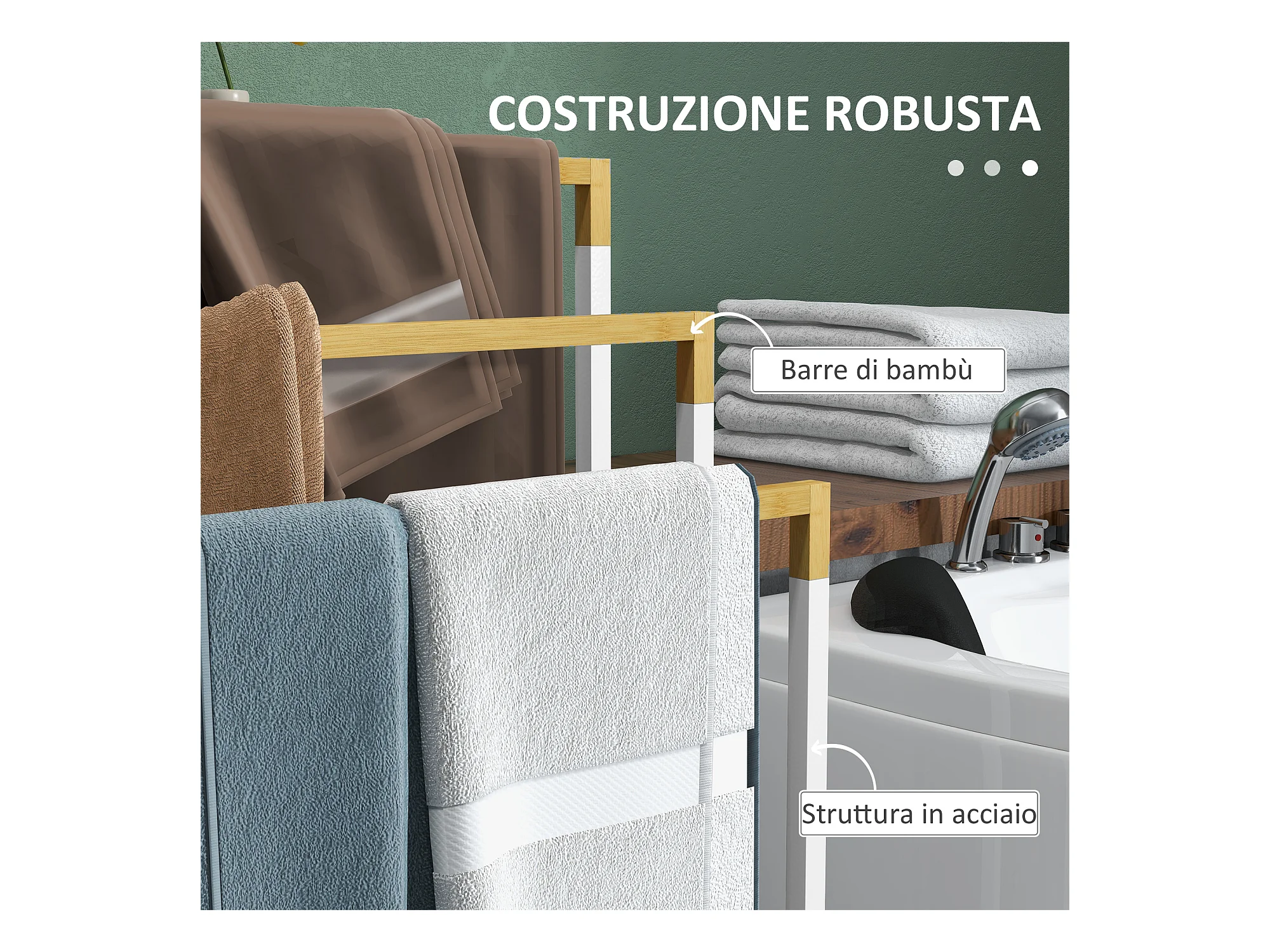 Porta asciugamani a 3 sbarre in bambù e acciaio bianco e color legno