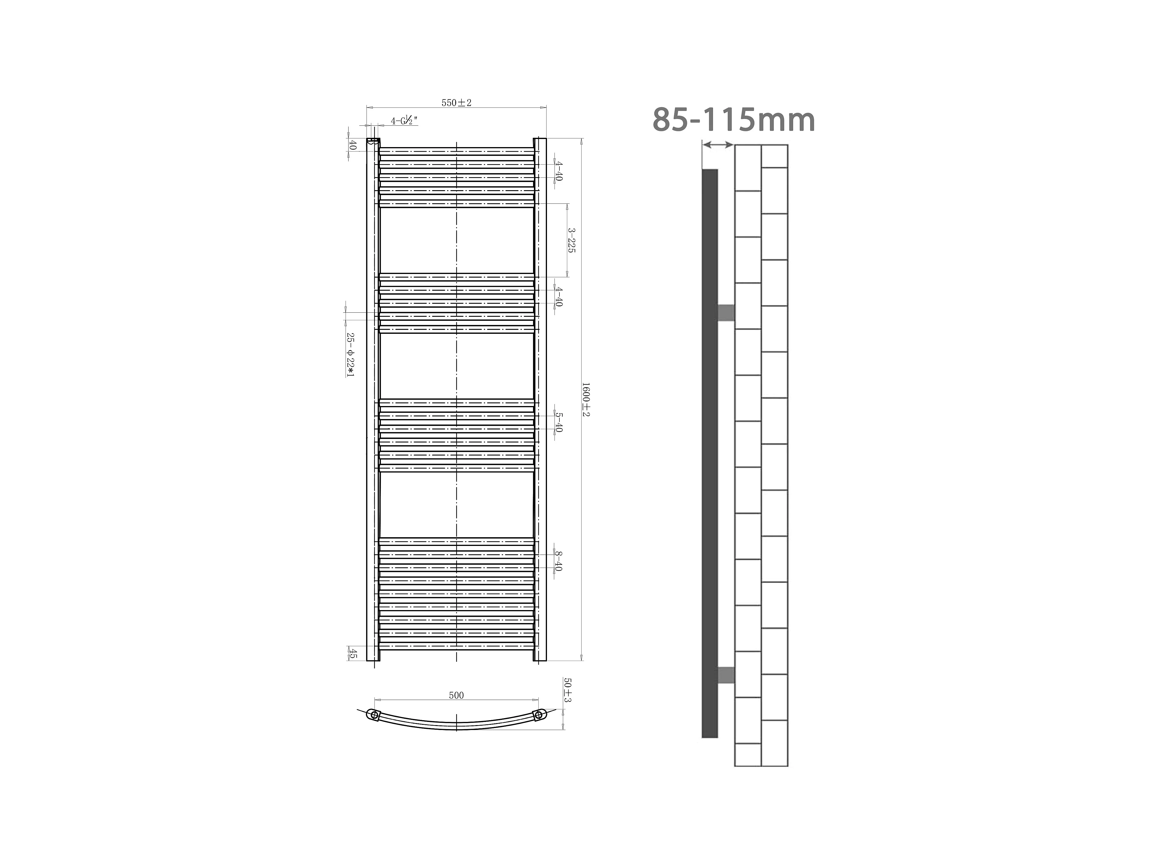 Porta asciugamani radiatore 1650x500mm riscaldamento ad acqua Watt 456.9 nero